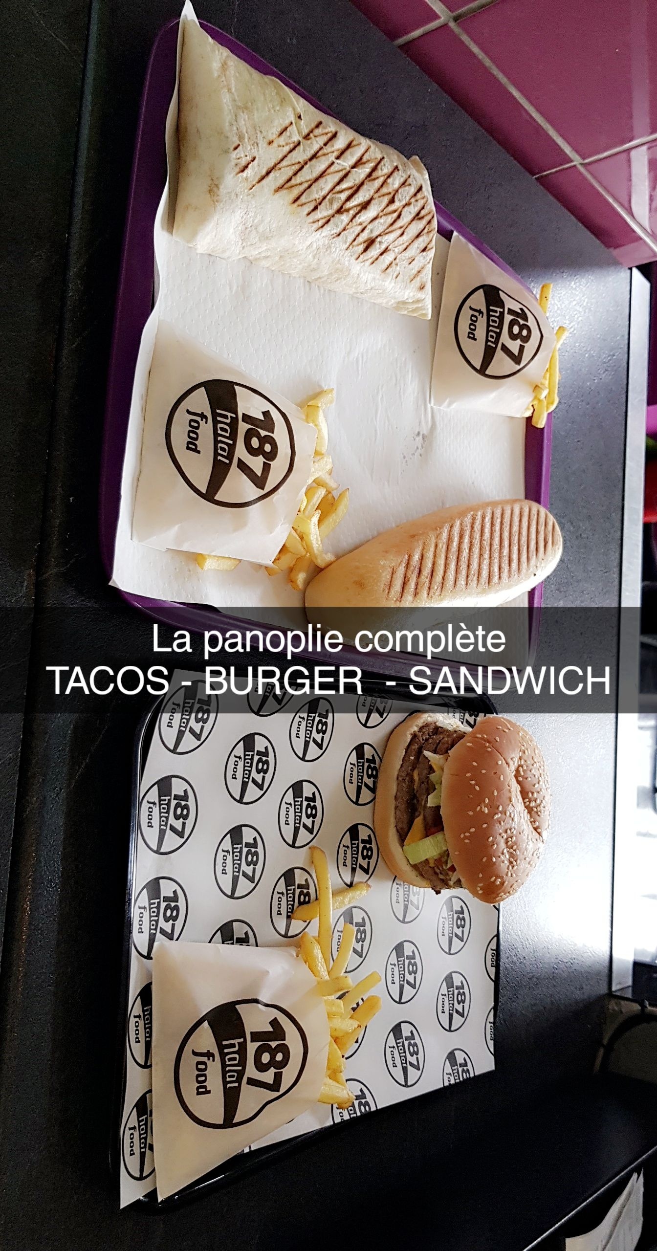 je ne suis pas du genre à donnez 5 étoiles à n'importe quelle fast food, mais je mets 5 étoiles pour plusieurs raison. les horaires sont très satisfaisant terminer à 23h00 est une tache difficile mais très souvent je mange très tard donc ça m'arrange l'ambiance est calme un endroit climatisé leur accueille parfait il vous met pas la pression il vous laisse le temps de choisir ils sont à l'écoute souriant plusieurs variété de tacos et de burger surtout la composition des tacos un choix libre pour les plus gourmand point positif on ne mange pas tout le temps la même chose et c'est très propre l'endroit les tacos nous remplit merci 187 !!!