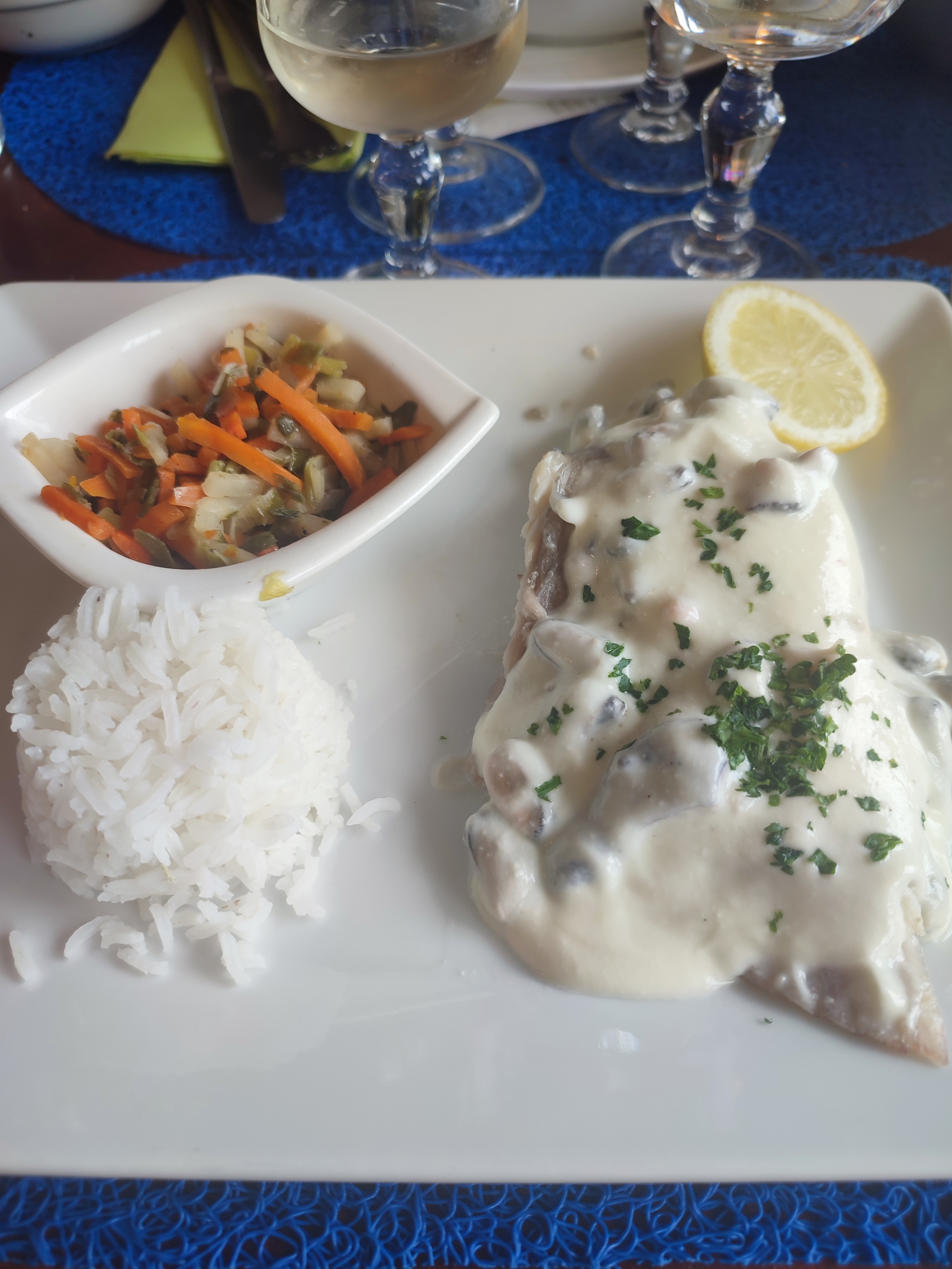 Aile de raie à la Normande plutôt un tiers d'une aile, avec une cuillère de crème fraîche non cuisinés et presque froide et sans saveur et deux cuillères de riz Je suis sortie en ayant encore faim. Grosse déception 😕