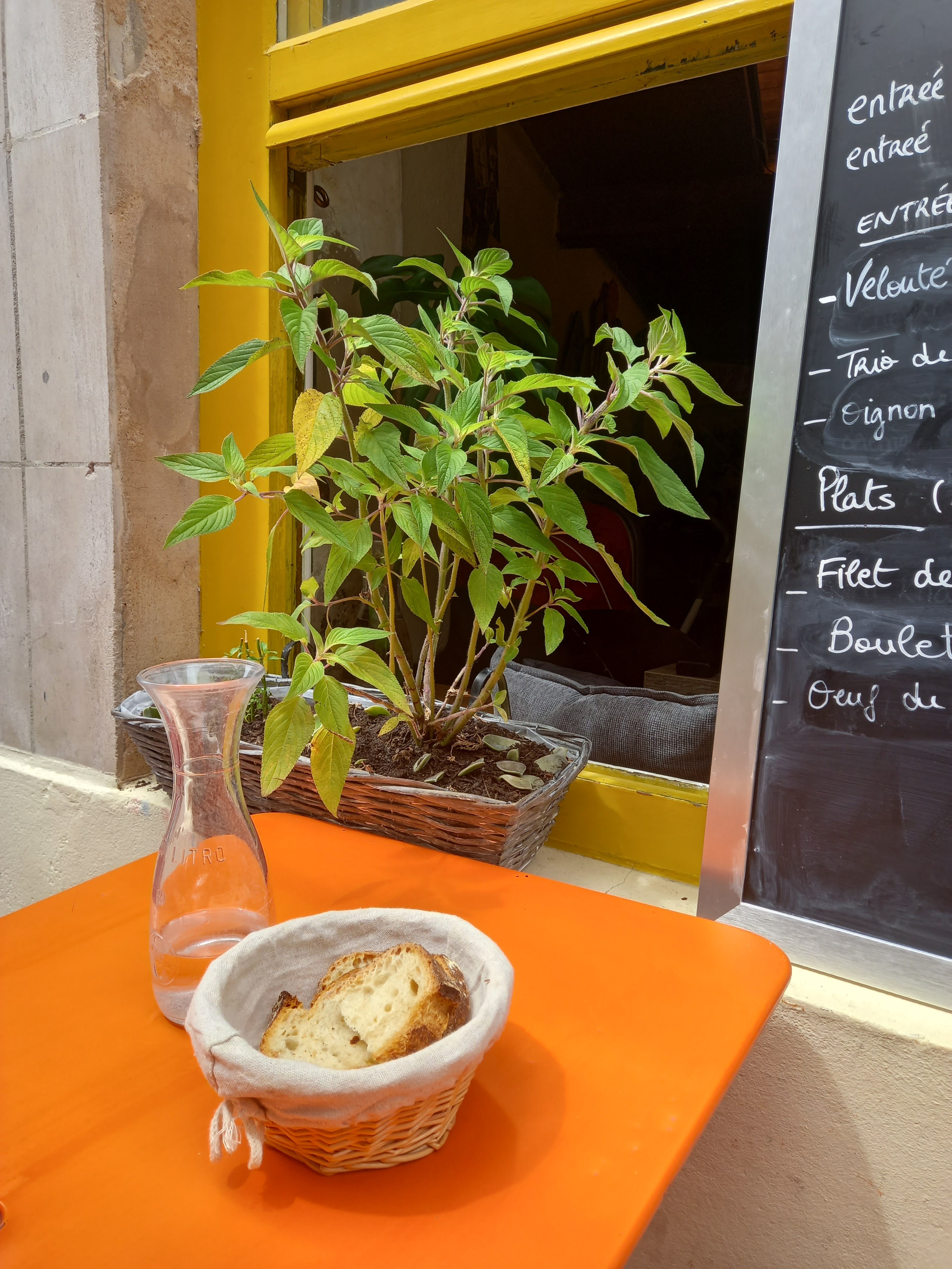 C'est bon mais sans surprise gustative (porc confit pomme de terre abricot) la carte n'est pas simple ; elle est expliquée par chaque serveur. Bémol pour le service vin, nous ne savons pas ce qui est mis dans le verre, puisque la serveuse vous apporte le verre plein, pas de carafe d'eau sur la table et pourtant serveuse qui s'ennuie soit elle mange du fromage au bar ou bien elle fume dans la rue. Le pain perdu est très bon. Il va falloir s'améliorer pour durer. 😉