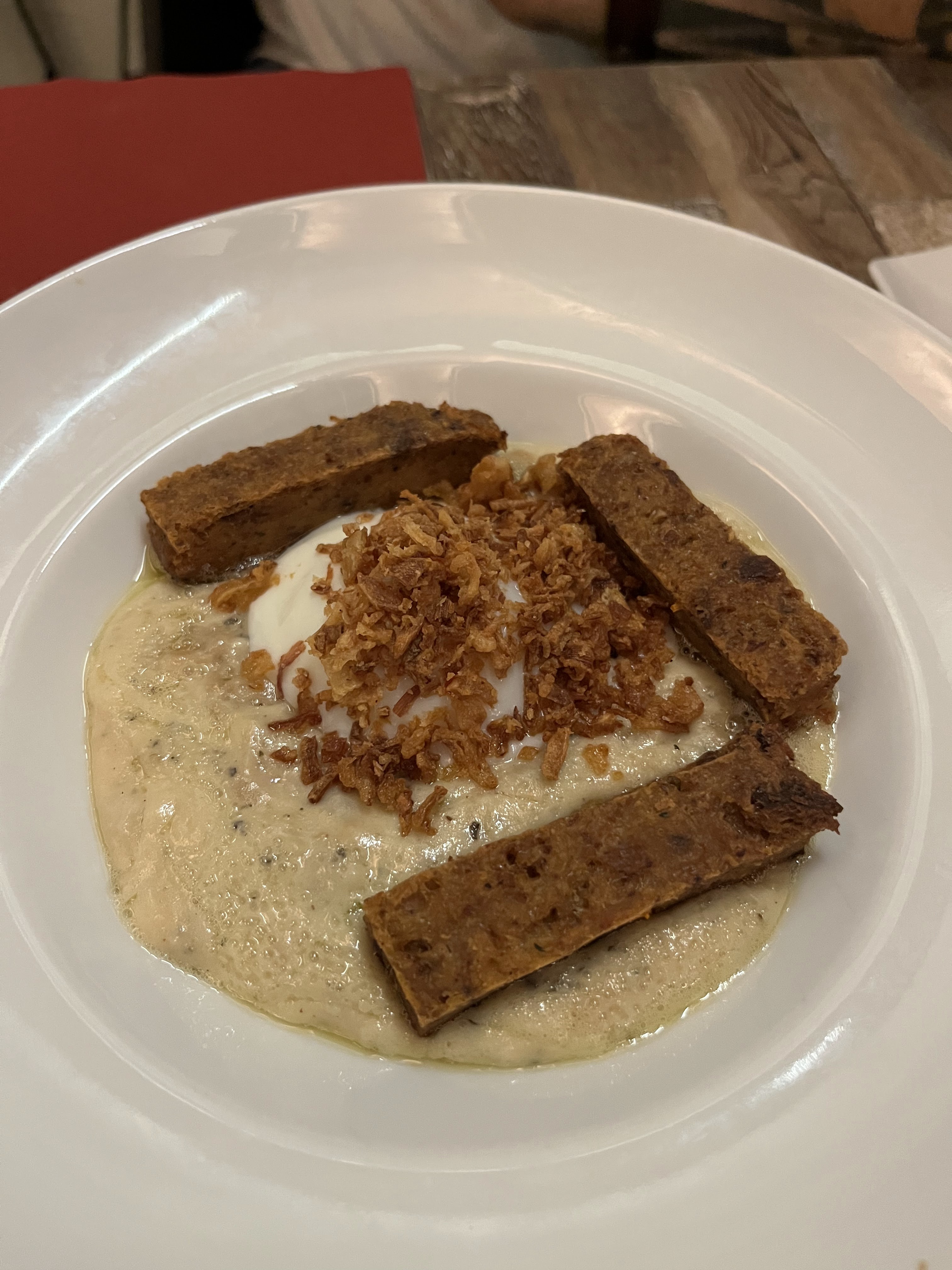 Un merveilleux restaurant avec des plats fantastiques et insolites et riches en saveurs. (L'association cèpes et figues était scandaleusement bonne). Discret mais axé sur la bonne nourriture avec plus d'options végétariennes qu'autrement. Tous les ingrédients sont bio du marché local et le patron/chef est clairement passionné par son menu et sa cuisine. Hautement recommandé.
