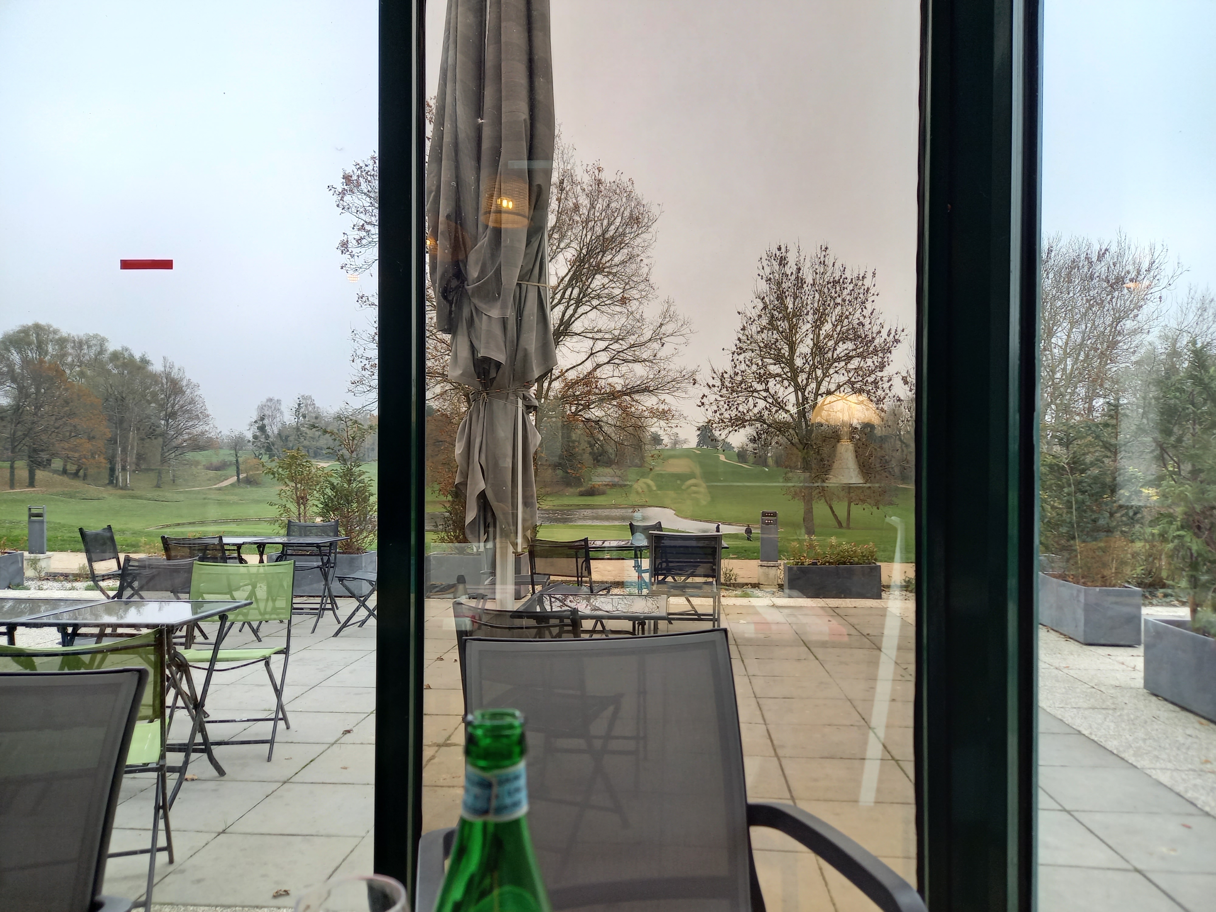 Lorsqu’on arrive au golf, on est tout de suite dans l’ambiance. L’entrée du local commun est très sale et indigne d’un établissement de ce standing. Huisseries en mauvais état. Vitres très sales et toiles d’araignées un peu partout. On arrive dans la salle de restaurant. Très bon accueil. On est tout de suite choyés. 2 plats du jours 2 desserts une eau gazeuse 72€ c’est un peu cher mais c’est bon. La vue sur le golf est bien sympa surtout quand le soleil pointe le bout de son nez. L’intérieur de la salle n’est pas nickel surtout si on lève les yeux. À moindres mesures mais un peu comme l’entrée commune du bâtiment. La blanquette de veau fut excellente et les profiteroles copieuse. Nous espérons une réaction sur la propreté car le lieu vaut le détour.