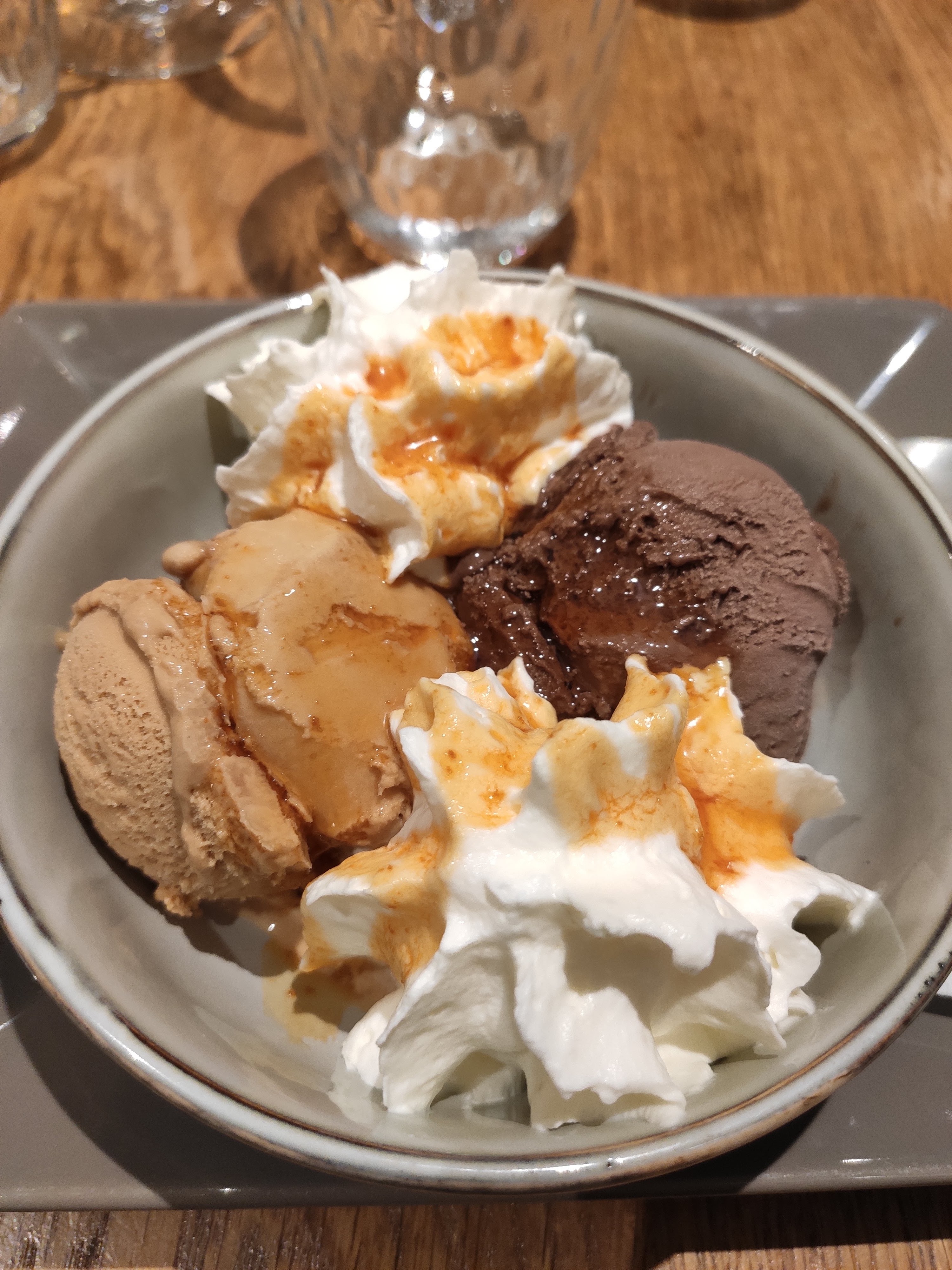Délicieuse cuisine 😋 Les crèmes glacées artisanales pourraient aller plus loin. Belle texture mais trop léger en vanille et pistache trop artificielle mais les éclats rattrapent un peu le coup.