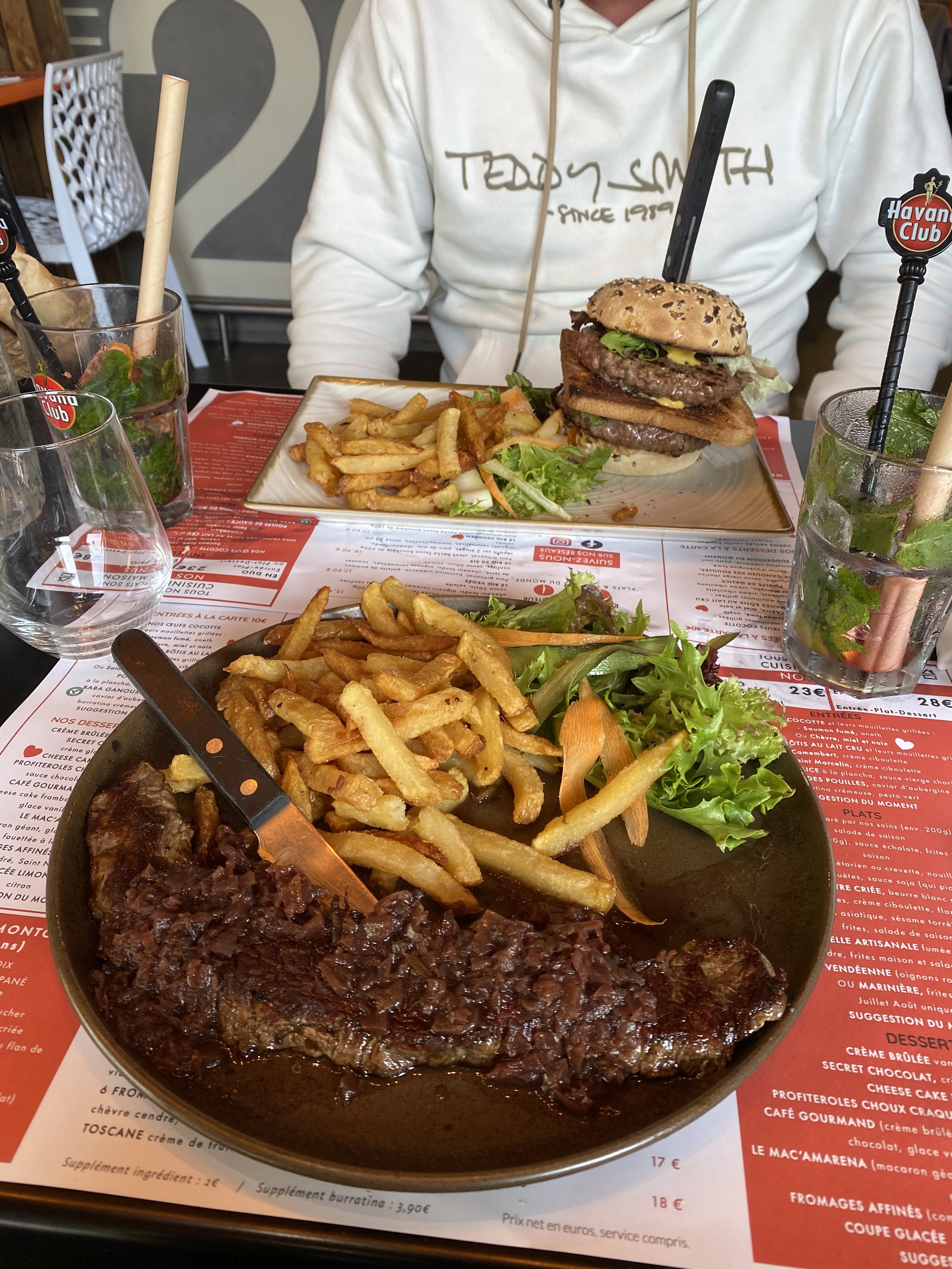 Bon restaurant avec un personnel très professionnel et très accueillant mais burger demandé saignant et reçu bien cuit mais très bon quand même. Ribs trop cuits et parts irrégulières. Café gourmand excellent. Merlot Démon Noir 2021 vendu 27€ la bouteille, mais à 5€ dans le commerce, dommage. Beaucoup de plats avec supplément ce qui augmente la facture.