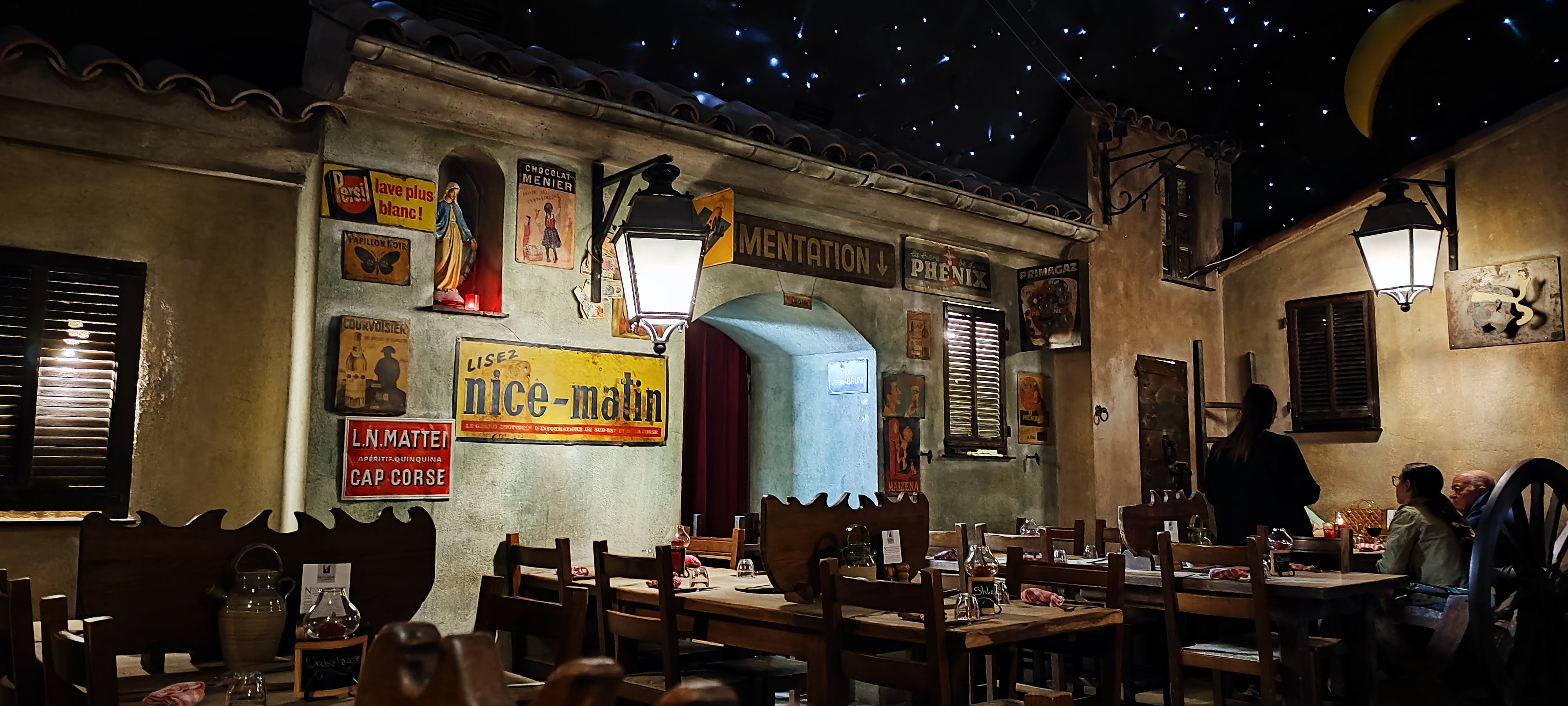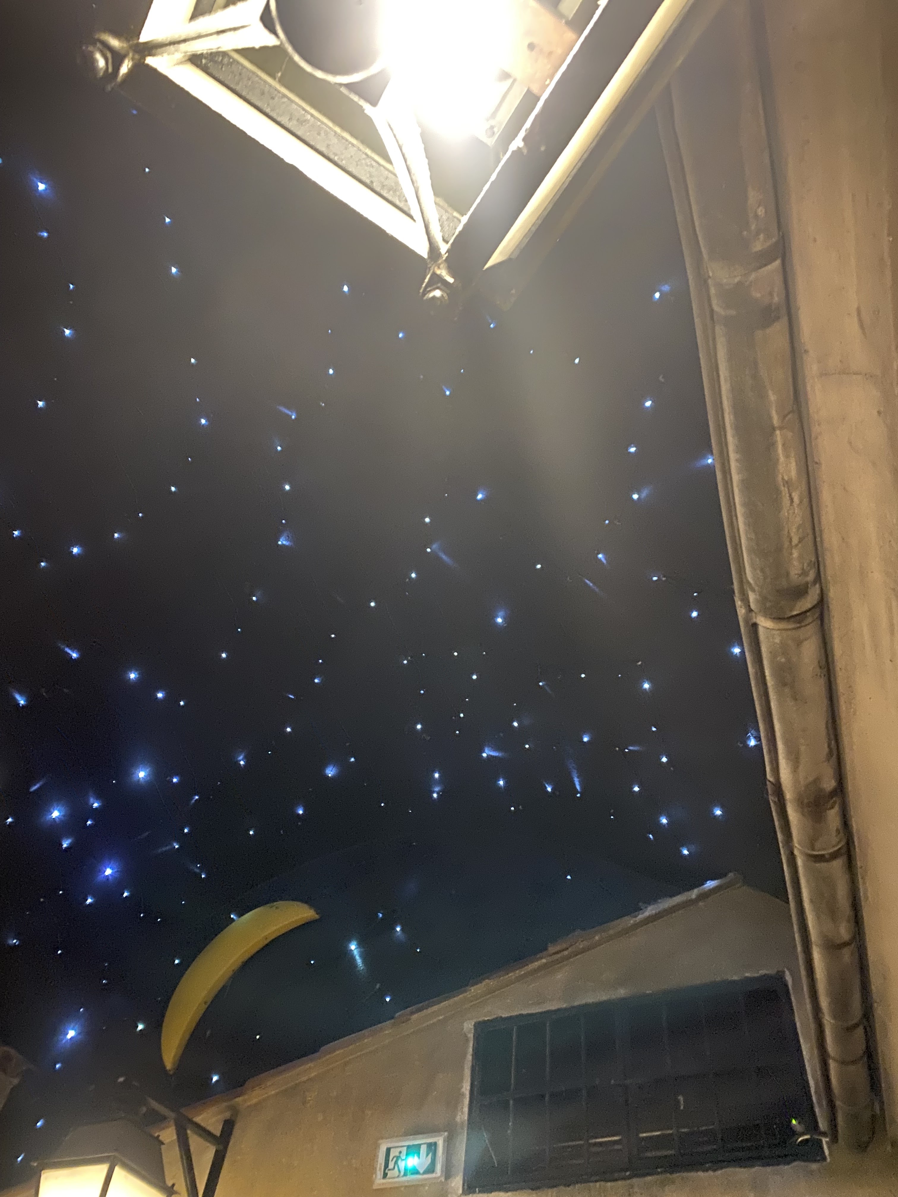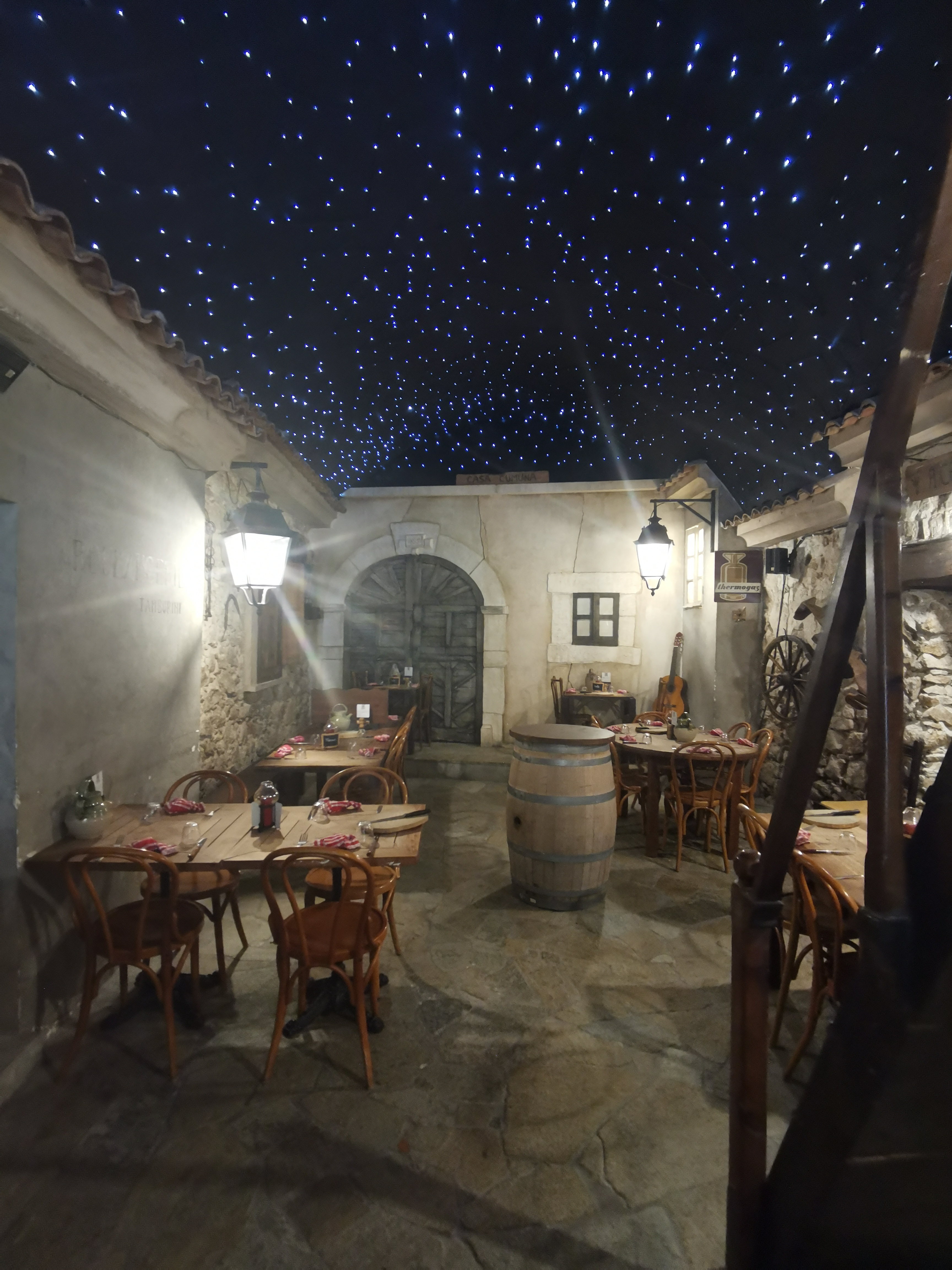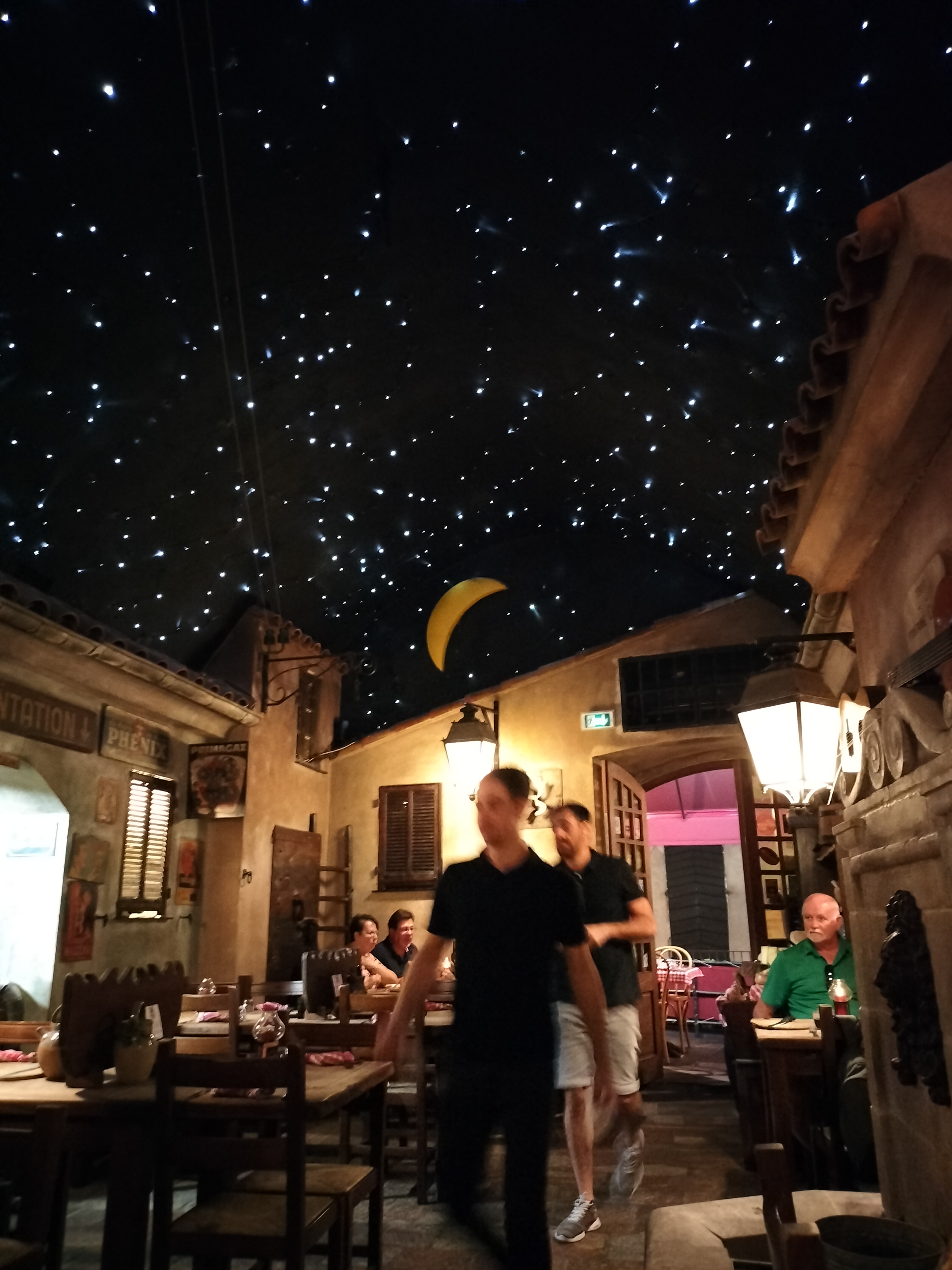 Très atypique. Bonne ambiance. On y mange comme à la maison. 2 entrées qui donnent sous un ciel artificiel étoilé. 1 pour la restauration avec accès à une fontaine à eau. 1 pour un bar.