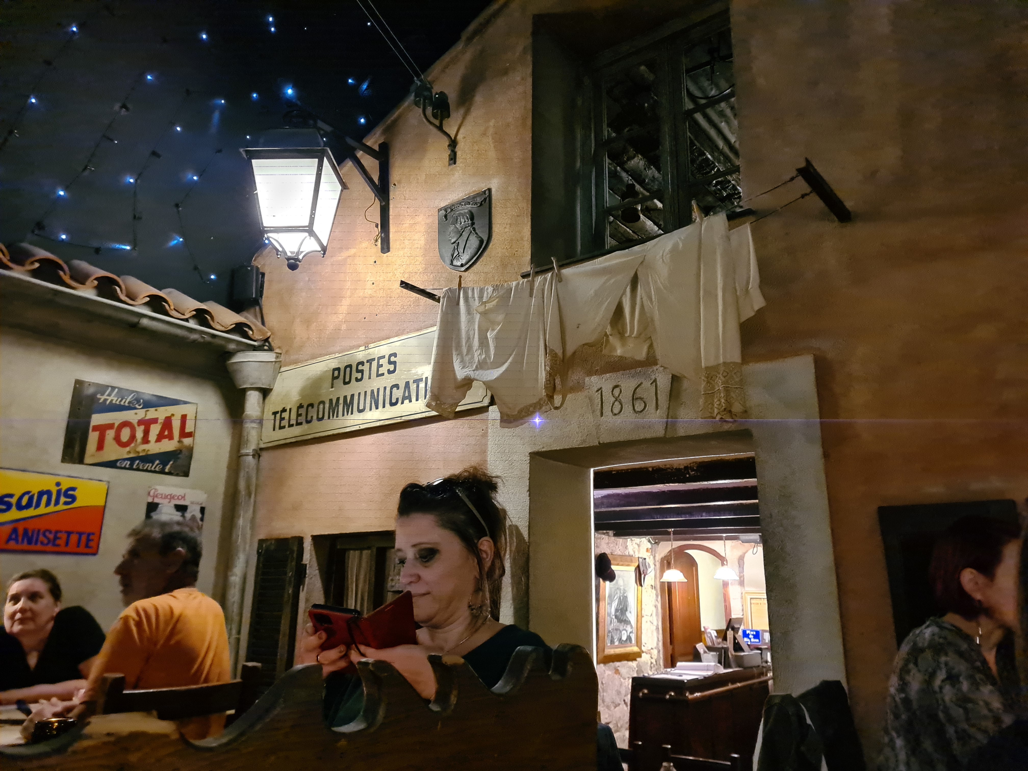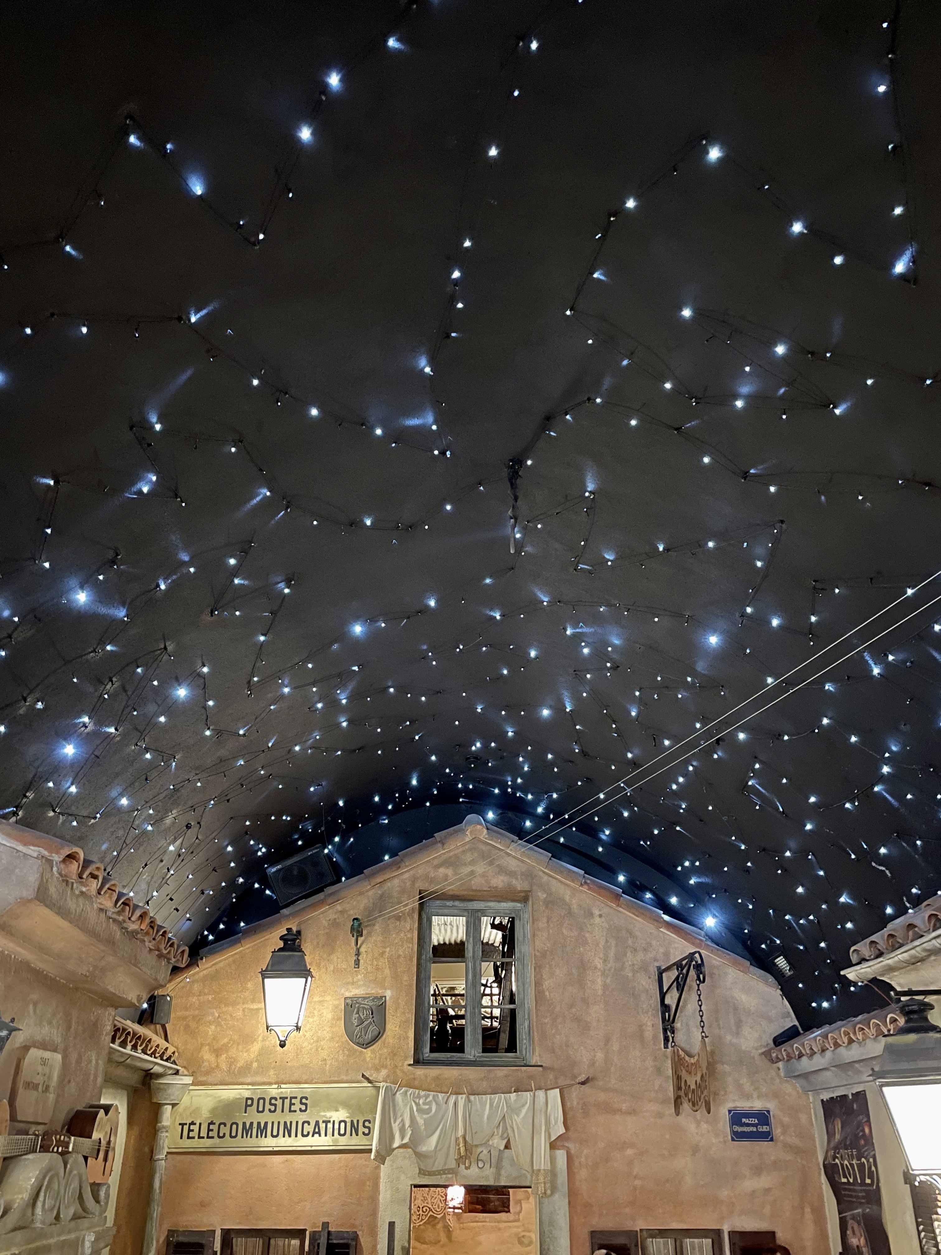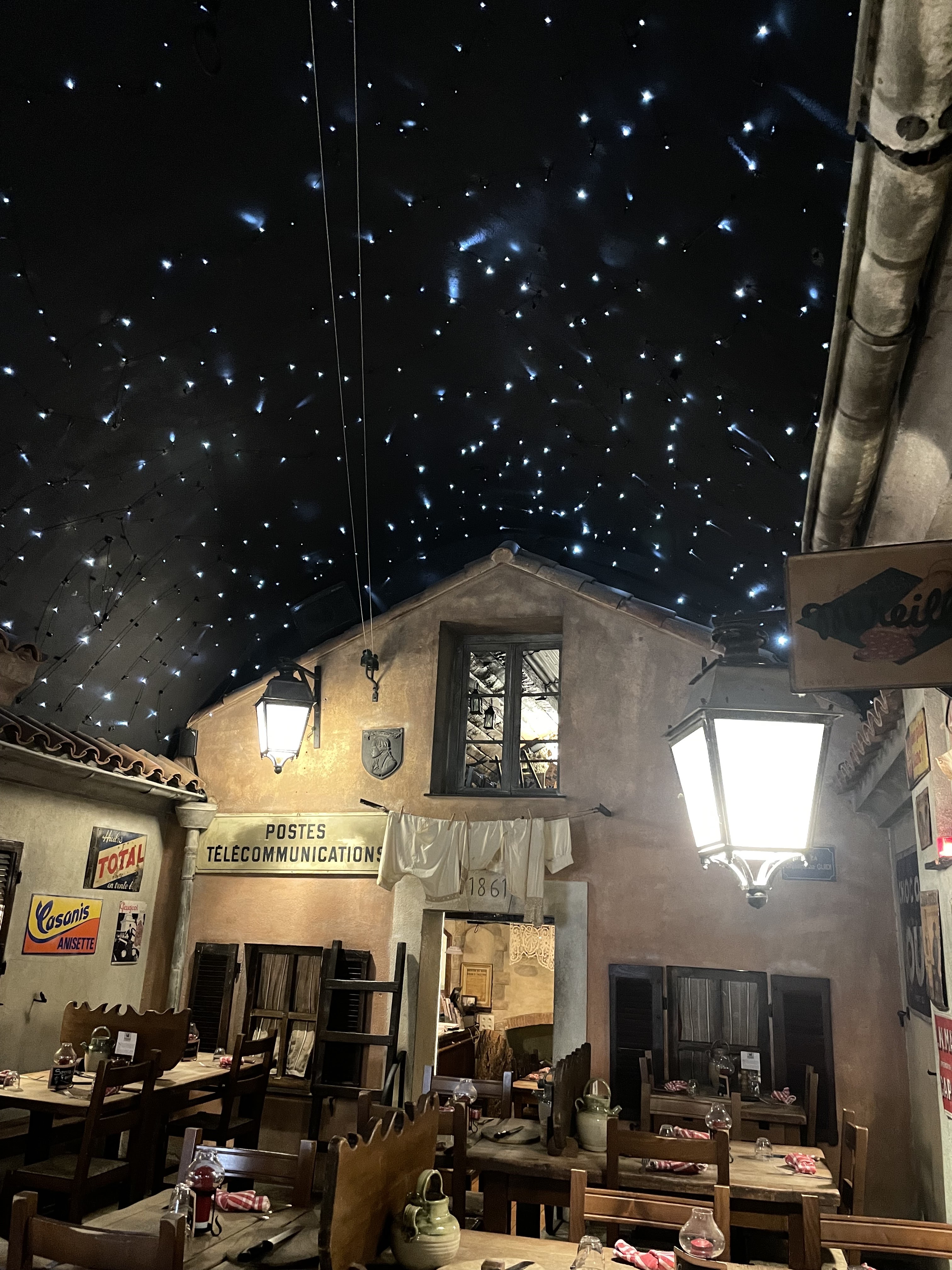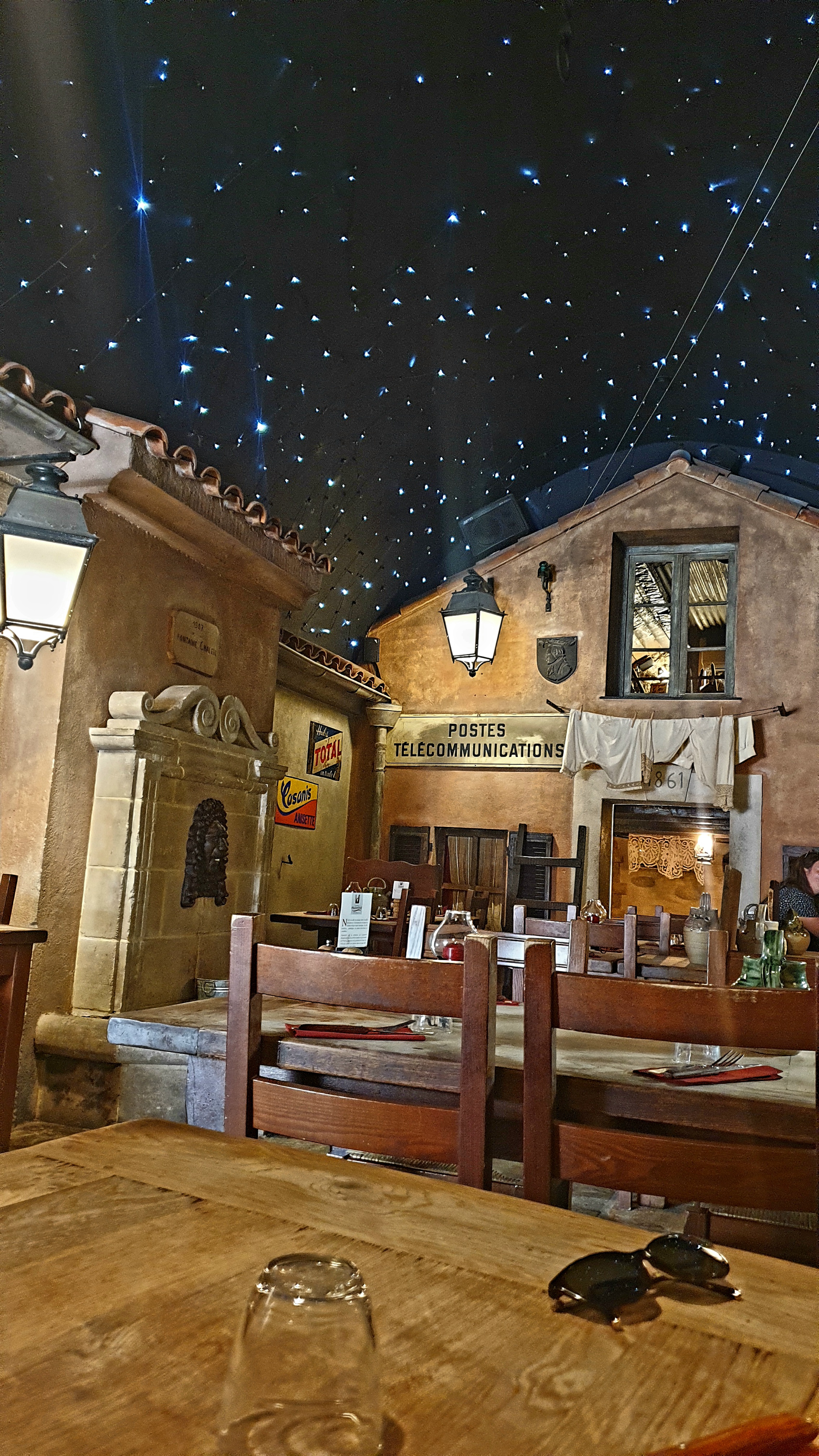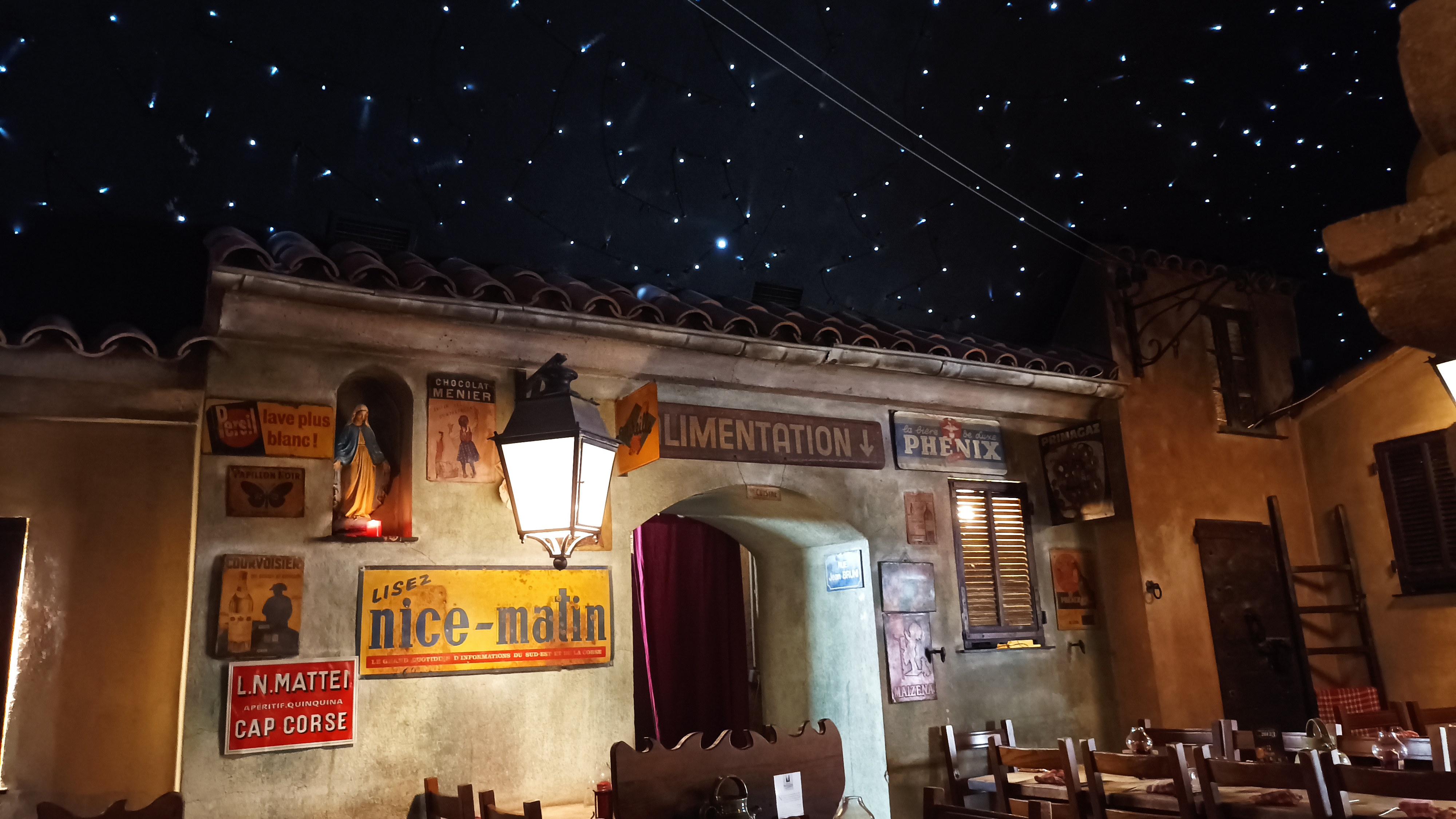Très atypique. Bonne ambiance. On y mange comme à la maison. 2 entrées qui donnent sous un ciel artificiel étoilé. 1 pour la restauration avec accès à une fontaine à eau. 1 pour un bar.