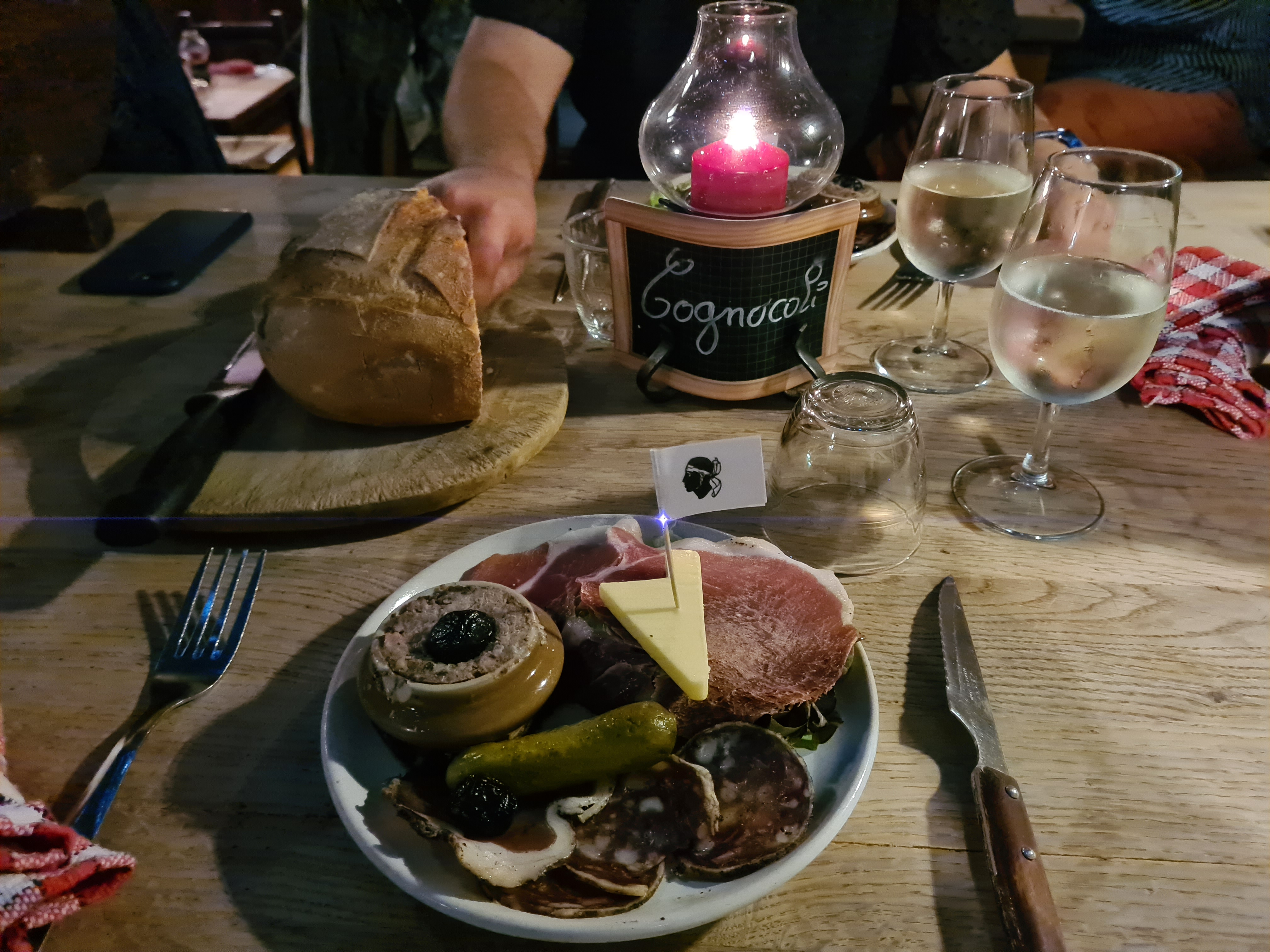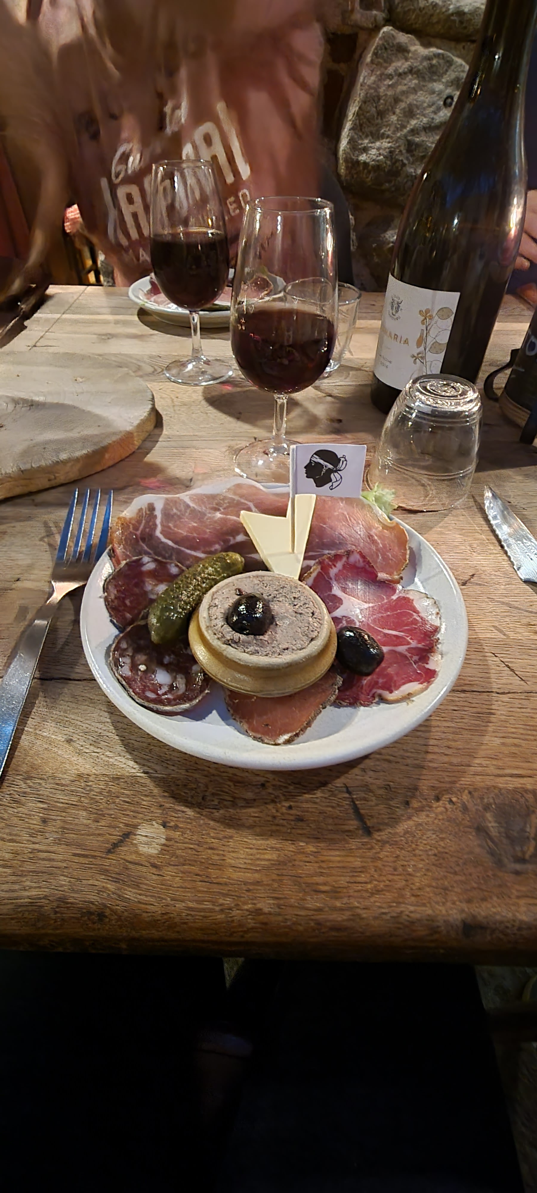 Nous avons juste pris une bouteille de vin et une belle planche de charcuterie ! Le service était top, l’endroit est atypique. Le repas avait l’air succulent ! Je recommande vivement cette institution Corse ! J’ai déjà hâte d’y revenir.