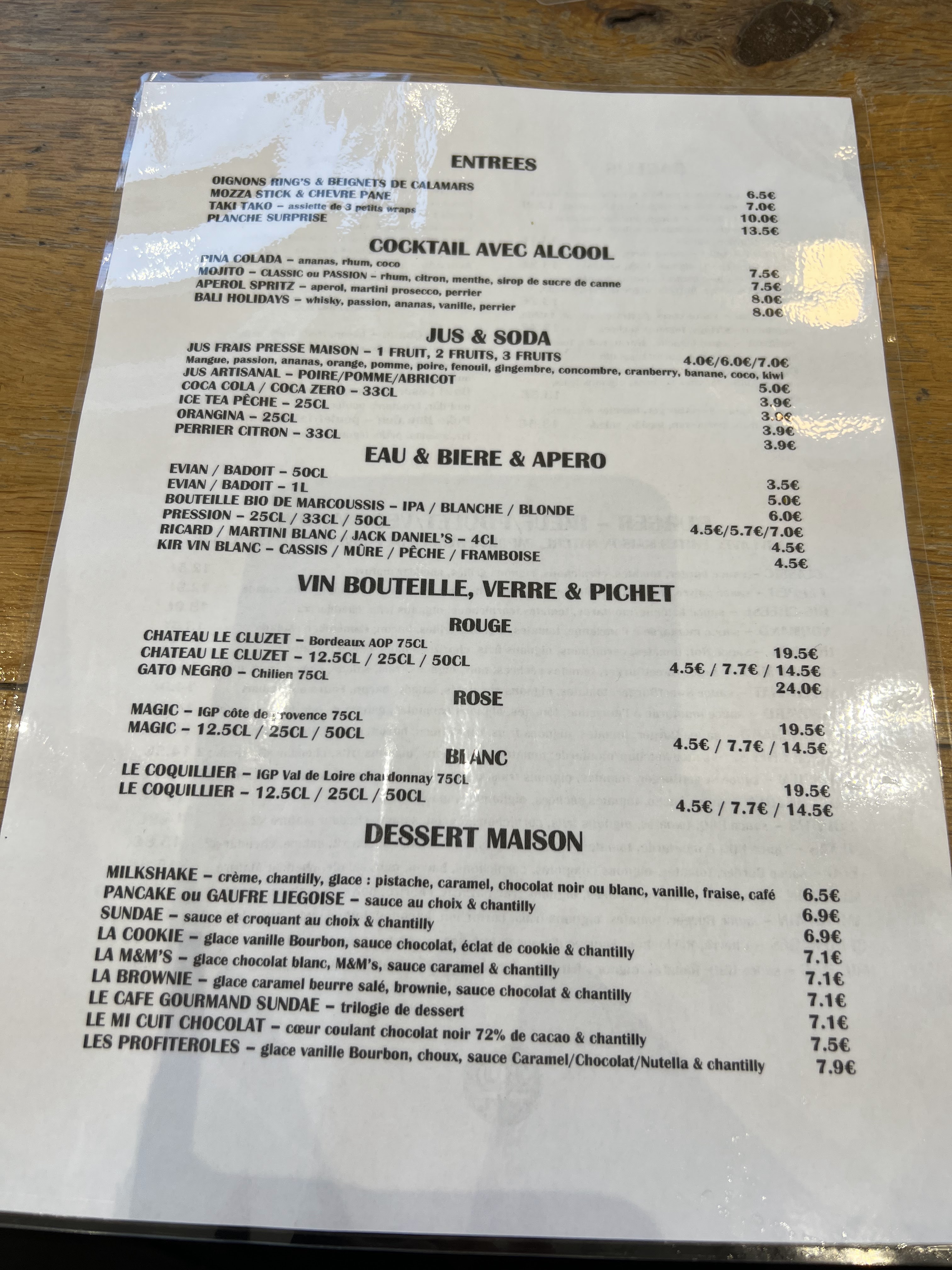 Acceuil et service par la patronne très aimable et sympathique. Cocktails ( Mojitos pinacollada et virgin )très bon, burger bons cuissons respectées frites bonnes. Profiteroles bonnes mais très petites et café gourmand 3 mignardises ( panacotta, mini tropeziennes et tarte beurre salé) très bons. Cadre très sympathique prix correct sauf peu être le vin un peu excessif.