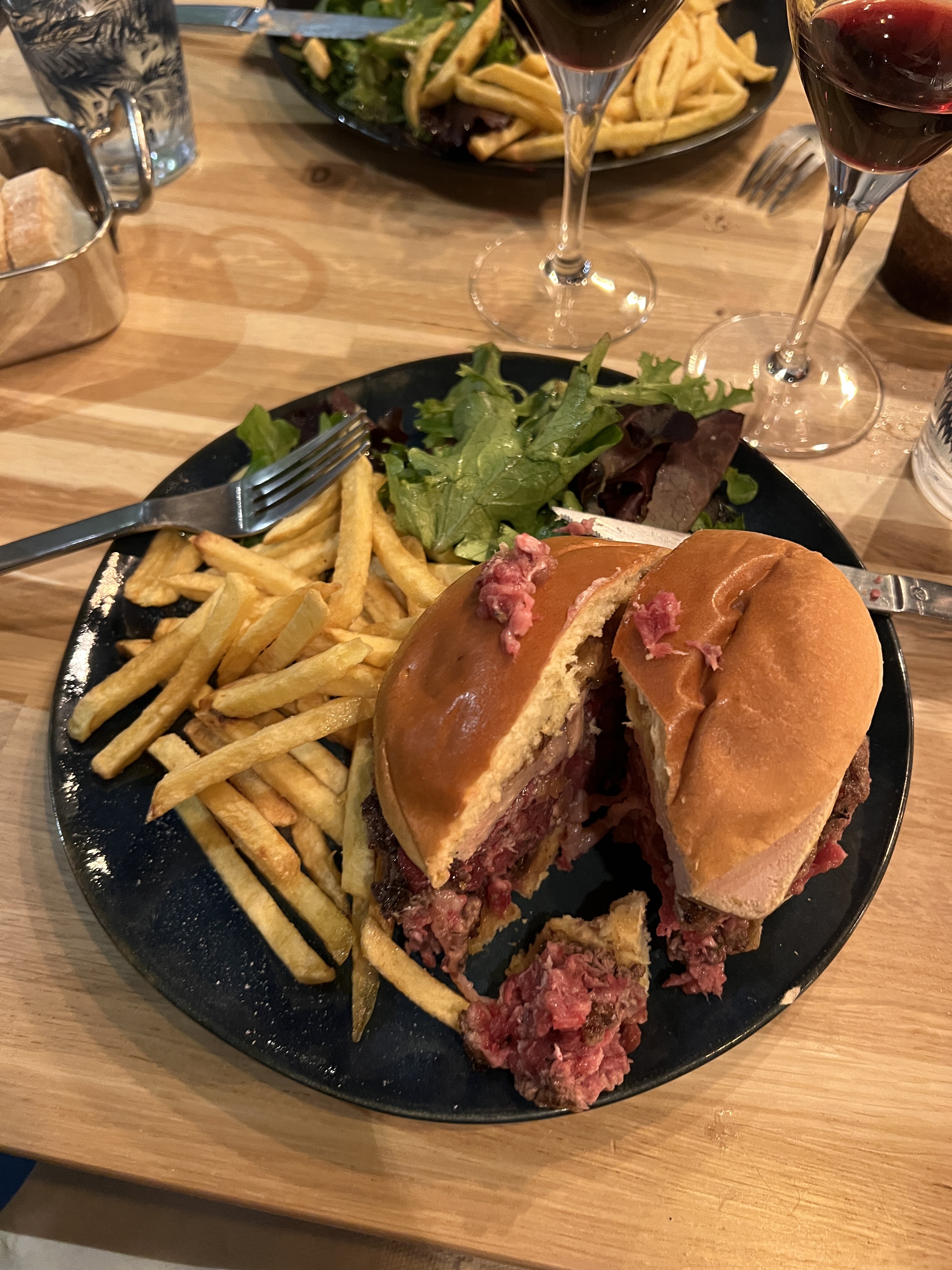 Pour notre première nuit à Paris, nous avons vu les critiques sur cet endroit et il avait l'air tellement bien que nous avons décidé d'y aller. Nous avons commandé 2 steaks moyens, 1 moyen saignant et 1 hamburger moyen. Les steaks étaient très bien faits ! Nous ne pouvions pas encore les couper pour les manger. Et ils nous ont facturé 5 £ pour chaque verre d'eau chaude et ils nous ont facturé du ketchup… même si nous avons commandé des frites !!!! Je ne recommanderai jamais ce restaurant.