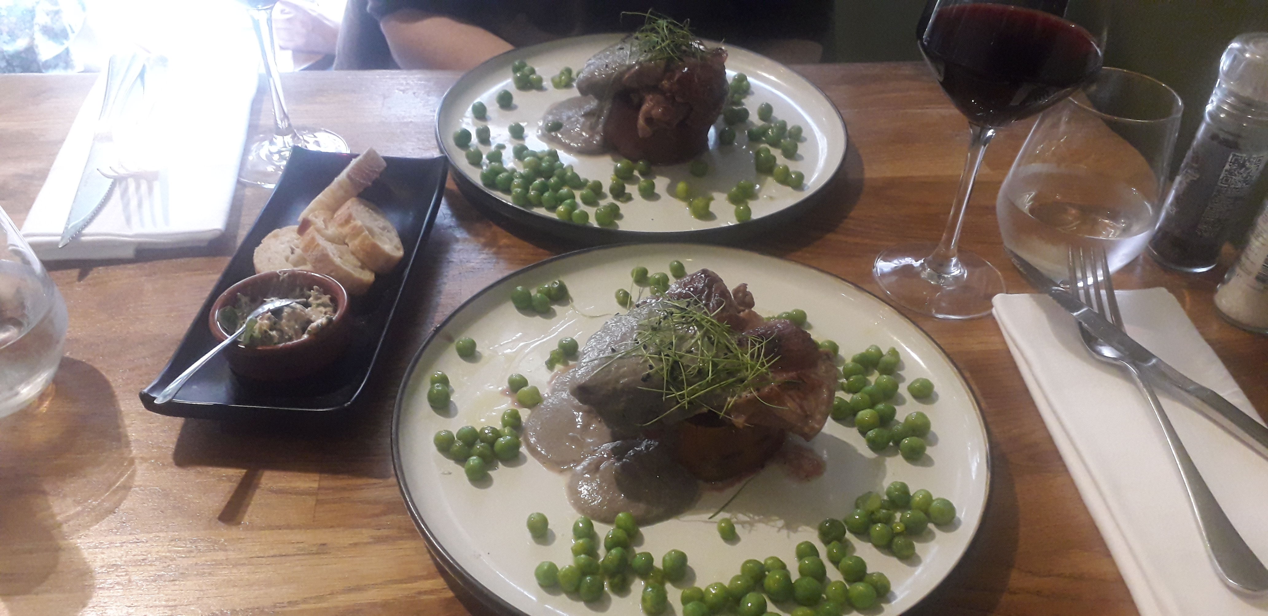 Bière ambrée pression en pinte, bien fraîche, bonne entrée en matière. Poitrine purée de pommes de terre et carottes : viande assez insipide et plat à peine tiède... Dommage. Macaron glacé en dessert, globalement très bien. Bémol malheureusement à cause de cacahuètes torréfiées mais surtout salées qui gâchent le tout. Bilan très moyen...