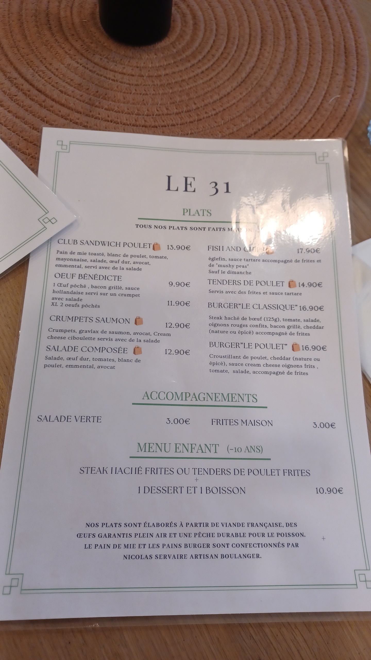 Nous avons brunché au 31 un dimanche matin, accueil très chaleureux, personnel très sympathique et de bons conseils. Plats typiques anglais, très bons et copieux. Très bon rapport qualité prix, nous vous recommandons ce lieux