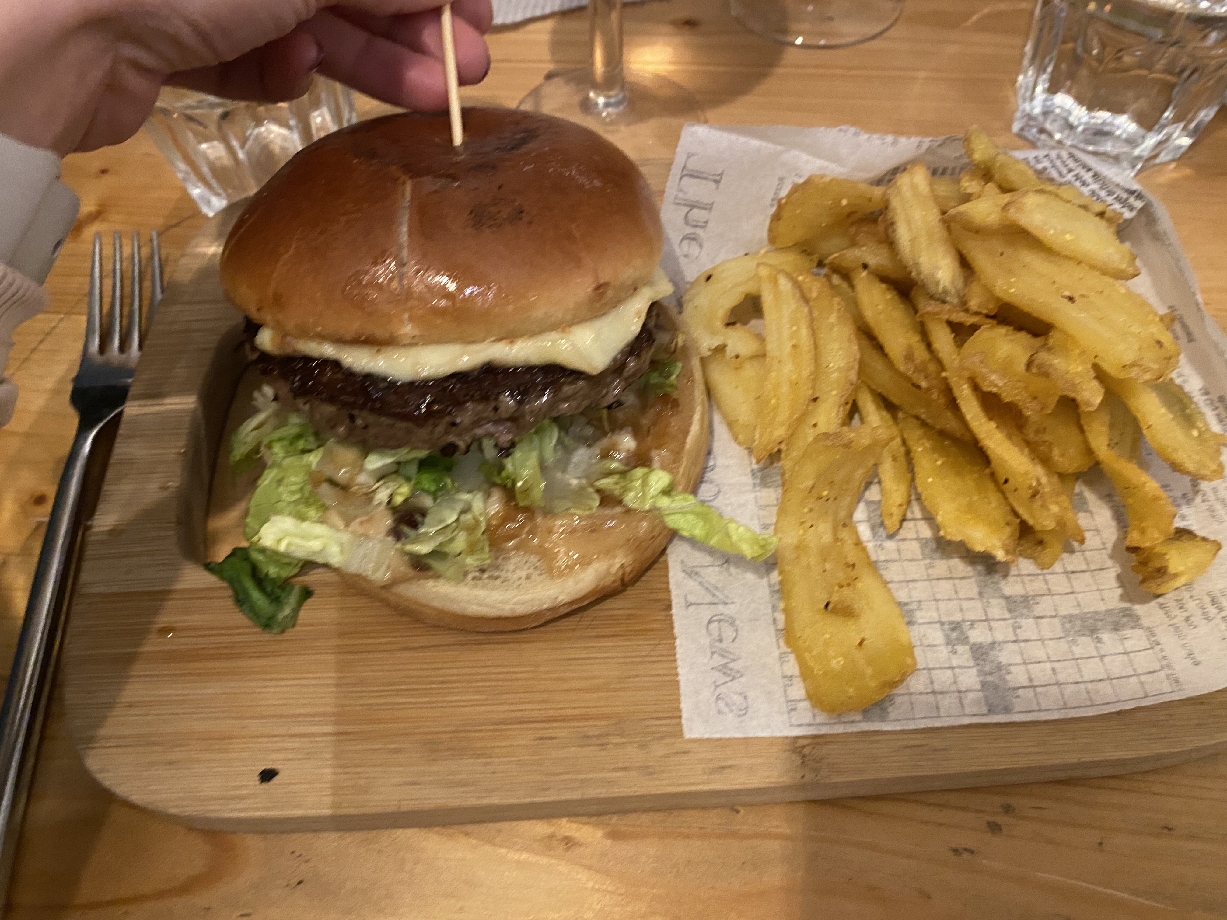 Excellent burger ! Les patates étaient folles : très bien cuites avec la peau, croustillantes mais fondantes dedans, peu salées (positif). Le burger était très bon : pain au sesame, steak haché façon bouchère cuisson respectée, bonne sauce, pas sec. Seuls petits bémols : pain peut-être un peu épais sur le dessus, et un peu sec sur le haut (trop toasté ?), et il y avait des oignons alors que j’avais demandé sans. Mais cela n’a gâché en rien le plaisir, serveur (patron ?) très sympathique .