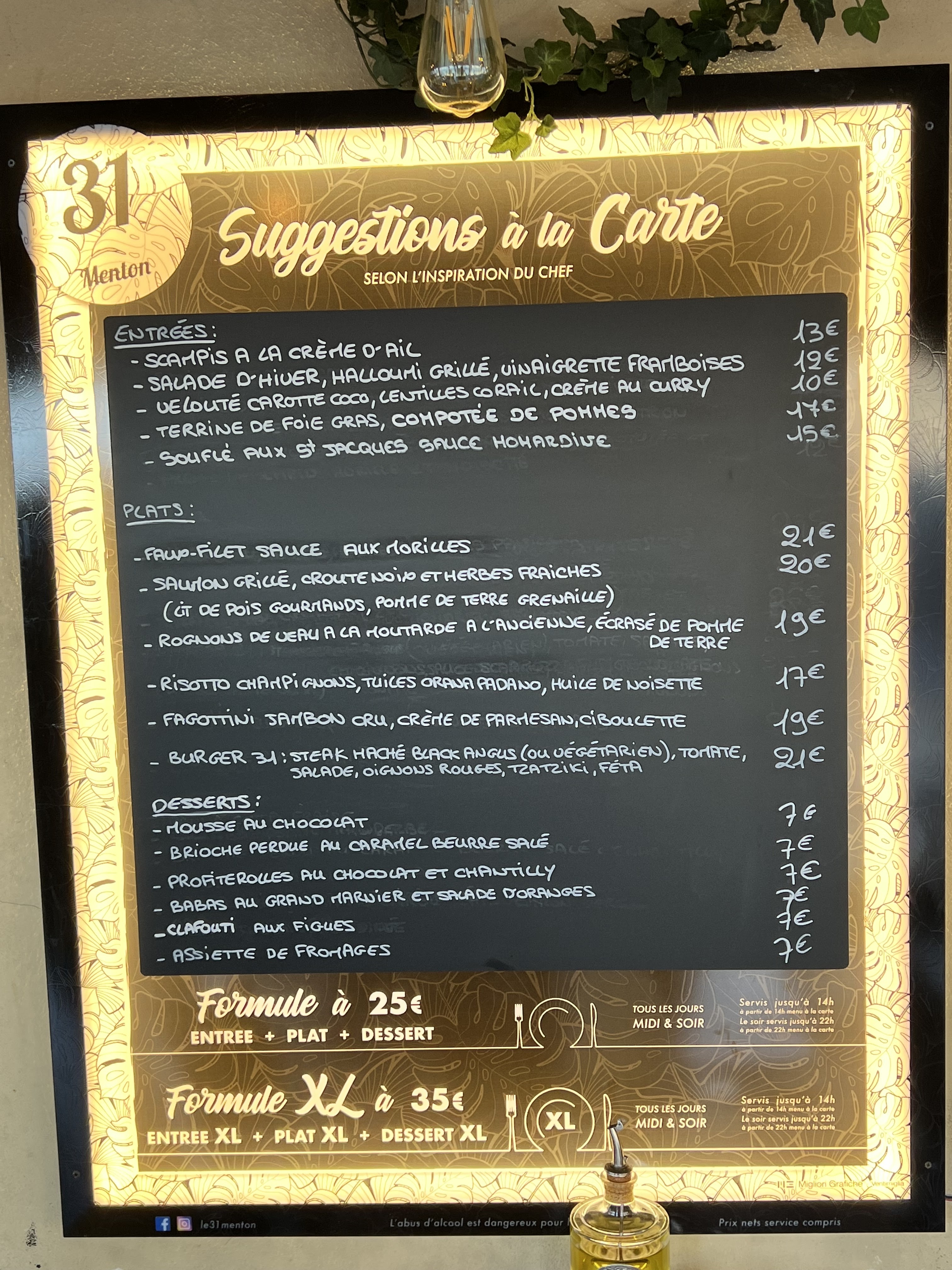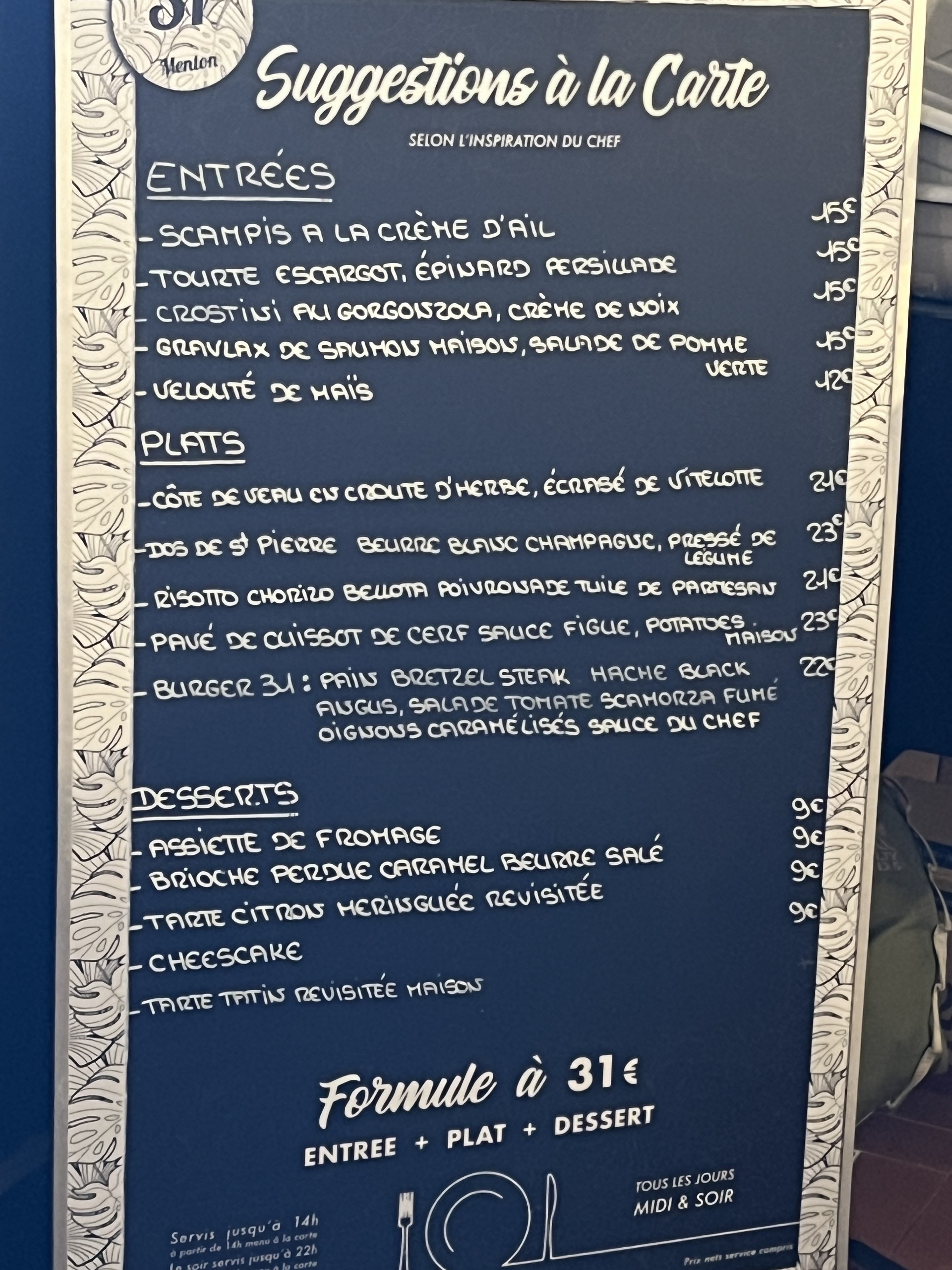 Ne chercher pas ailleur !! De l'entrée au dessert vos papilles seront éblouies avec une note d'humour et de gentillesse par notre hôte !! Si vous avez la chance d'avoir encore les scampis en entrée sur l'ardoise, la sauce est juste à tombée, n'hésitez pas plus longtemps. Ardoise avec produits frais. Menu à 25€ entrée plat dessert. Les mentonnais sont enfin respectés et apprécieront !! Je recommande et reviendrai!!