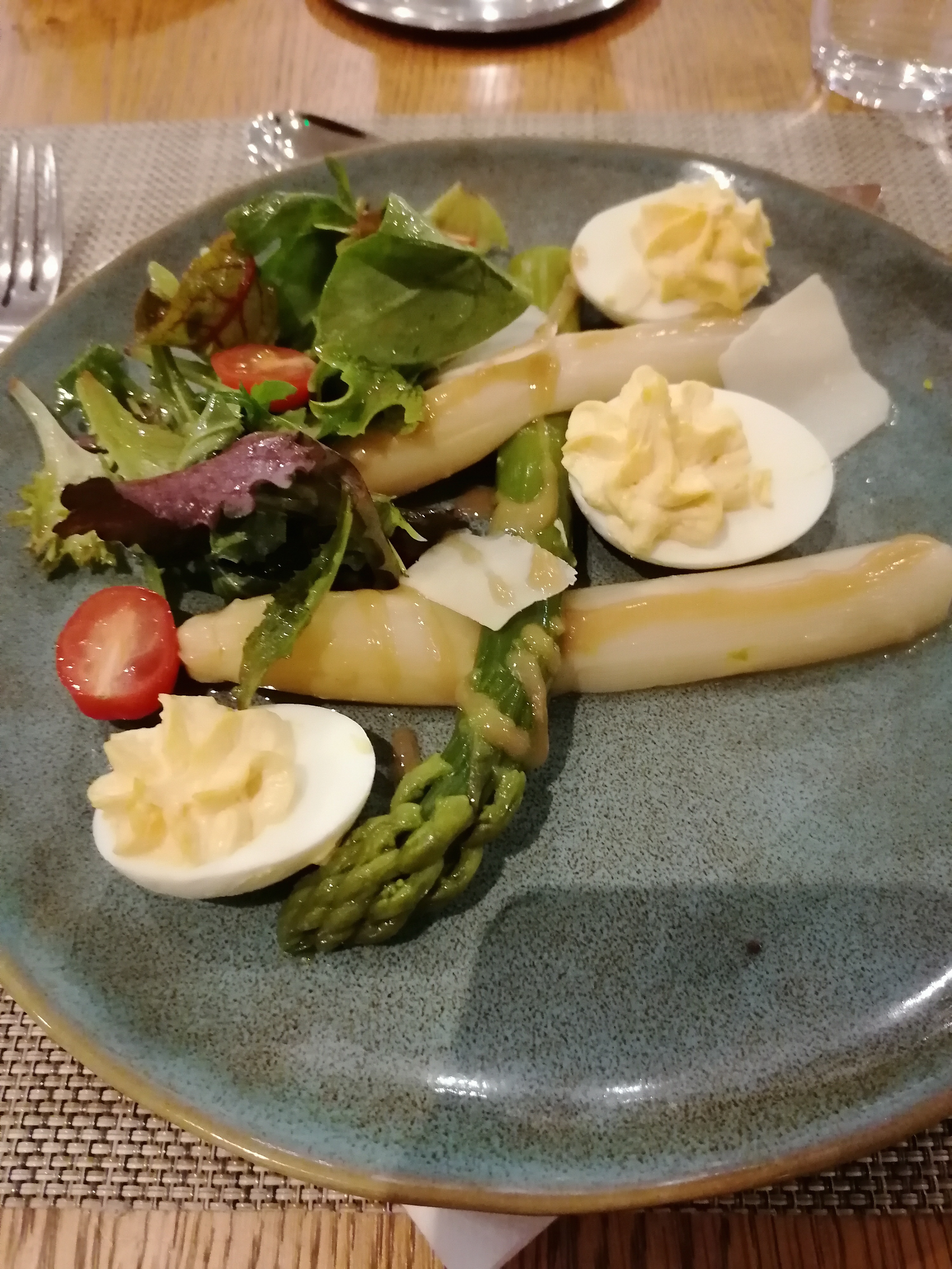 Restaurant de l'hôtel certes . Mais c'est très bon et le personnel d'une gentillesse à toutes preuves . Alors merci ! Gaspacho d'asperges et œuf croustillant Cabillaud et piperade.. Tarte fine aux pommes ..et le tout avec un igp des Landes à prix doux ..