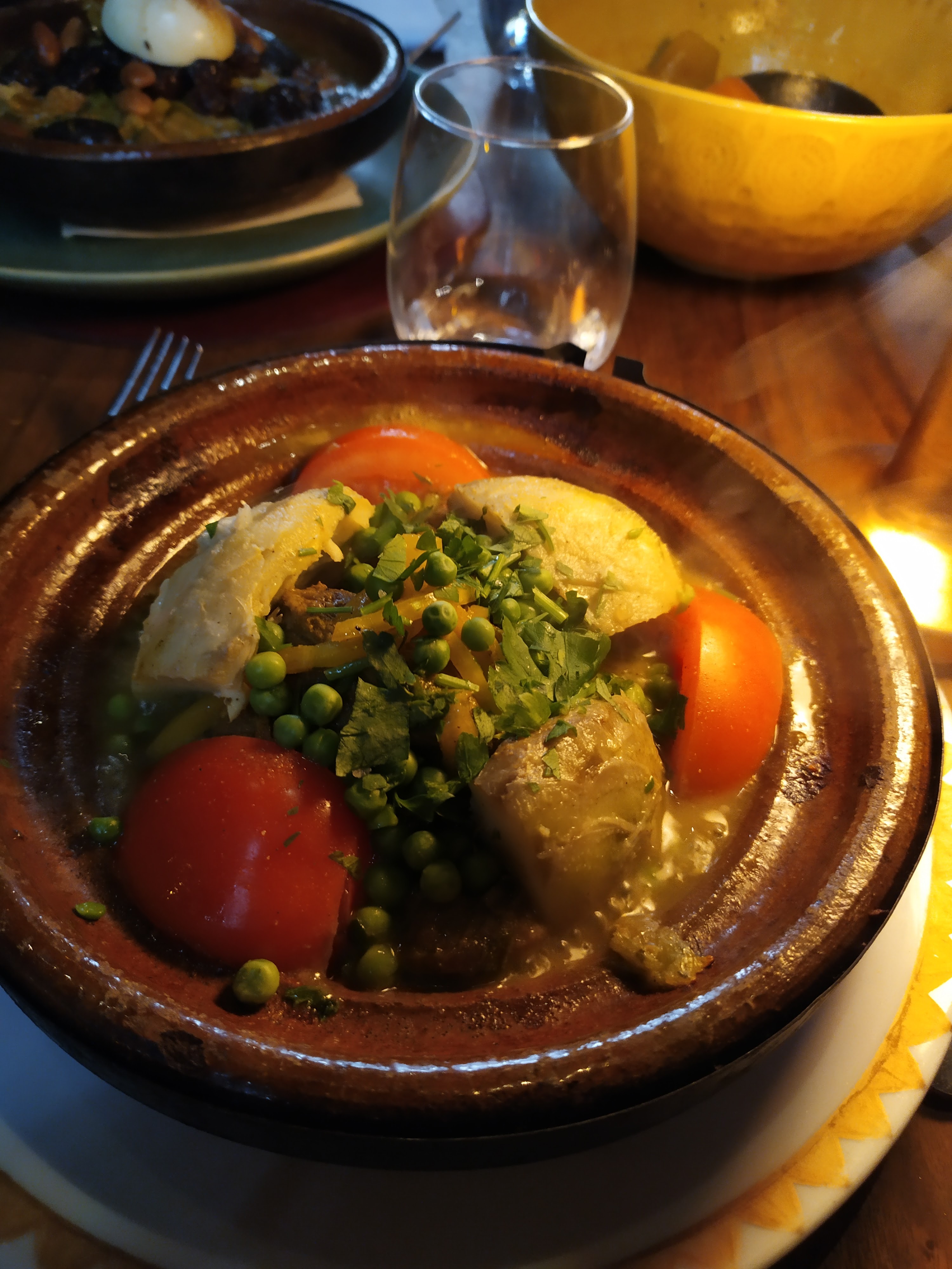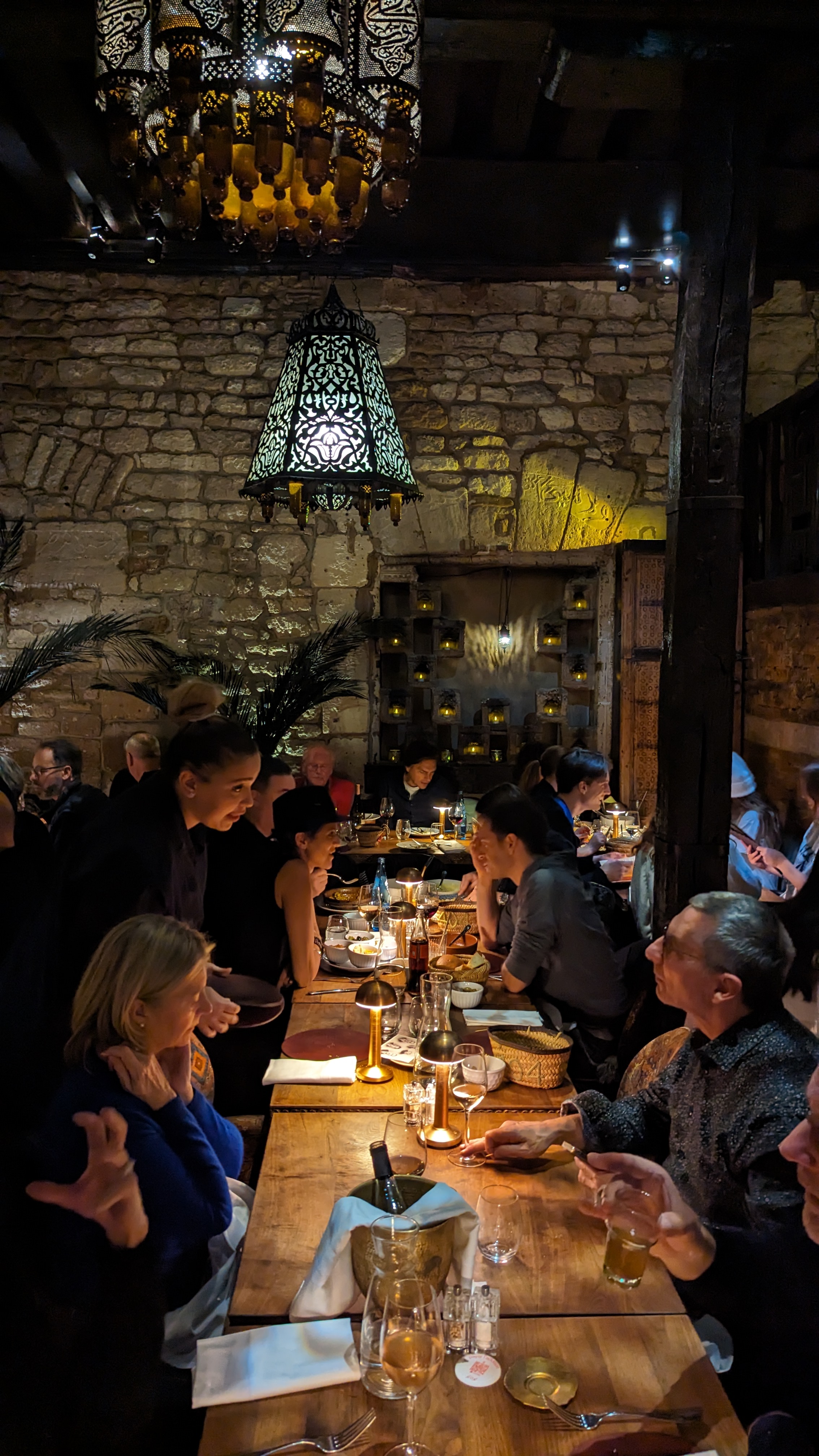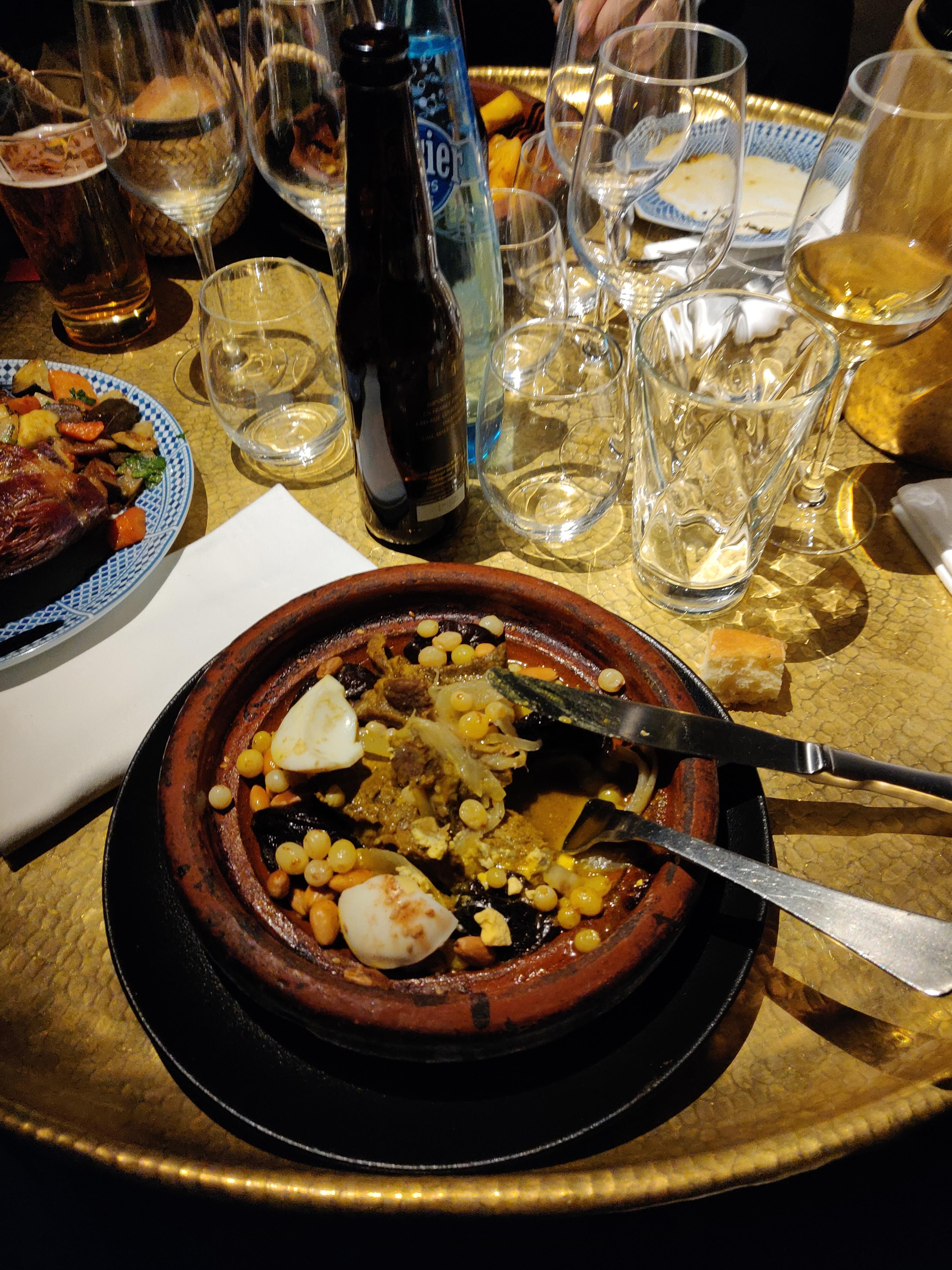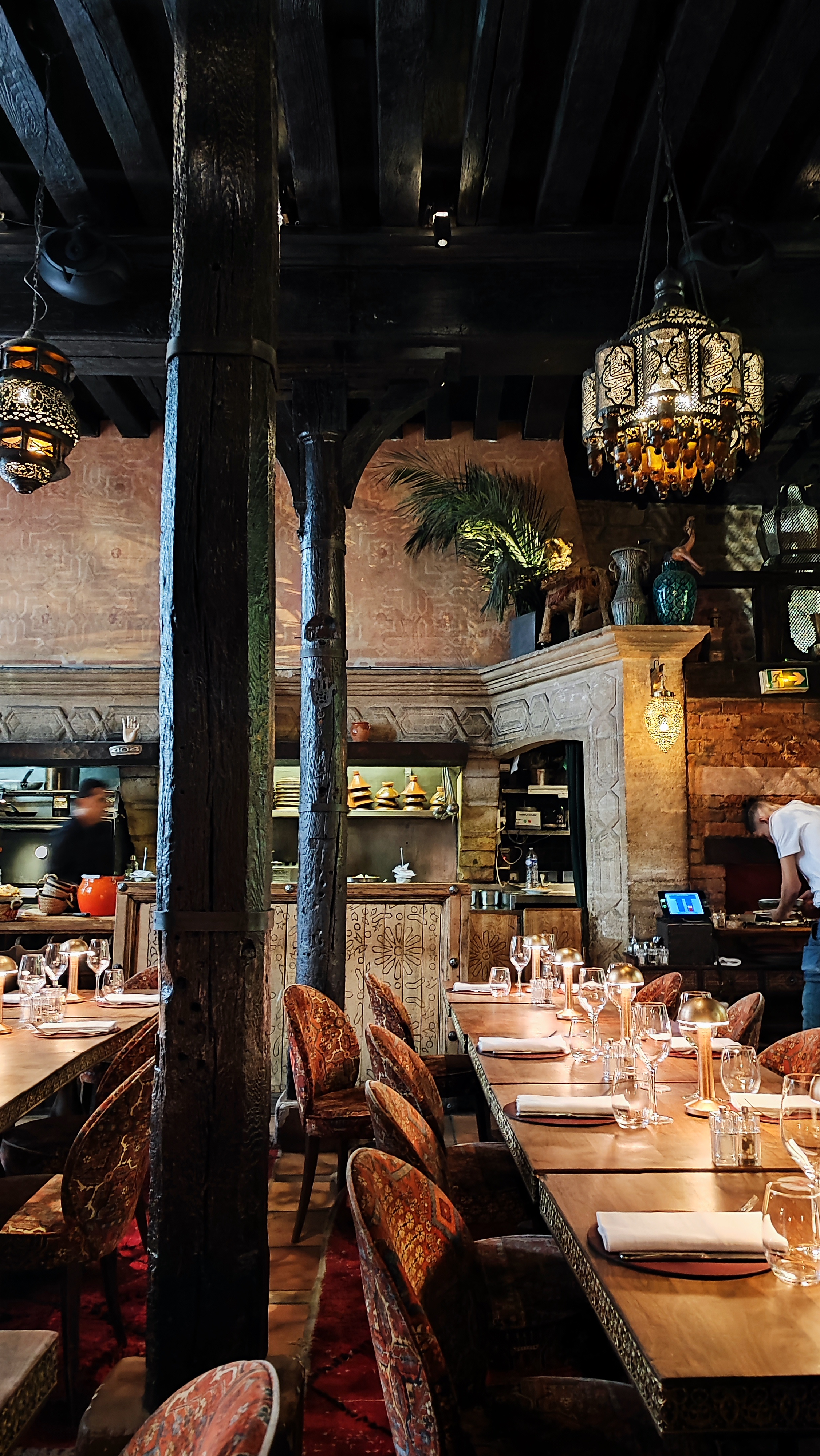 Très belle expérience, très dépaysant tant sur le décor du restau, le soir avec les lumières c’est sublime que les plats proposés ainsi que les odeurs qui nous transportent vraiment ailleurs. De plus, le personnel est très sympa. A noter qu’il s’agit d’un concept d’une table partagée ce qui gâche un peu le repas quand même… nous étions un couple au milieu d’une table de six donc de deux autres couples et clairement on ne s’entend pas et c’est une proximité pas très agréable… Rapport qualité prix très bon et couscous extrêmement copieux, le plat pourrait facilement être pour deux personnes. Viande cuite au feu de bois très bonne. Tagine de poulet aux poires incroyable. Très belle recherche du sucrée salé réussie.