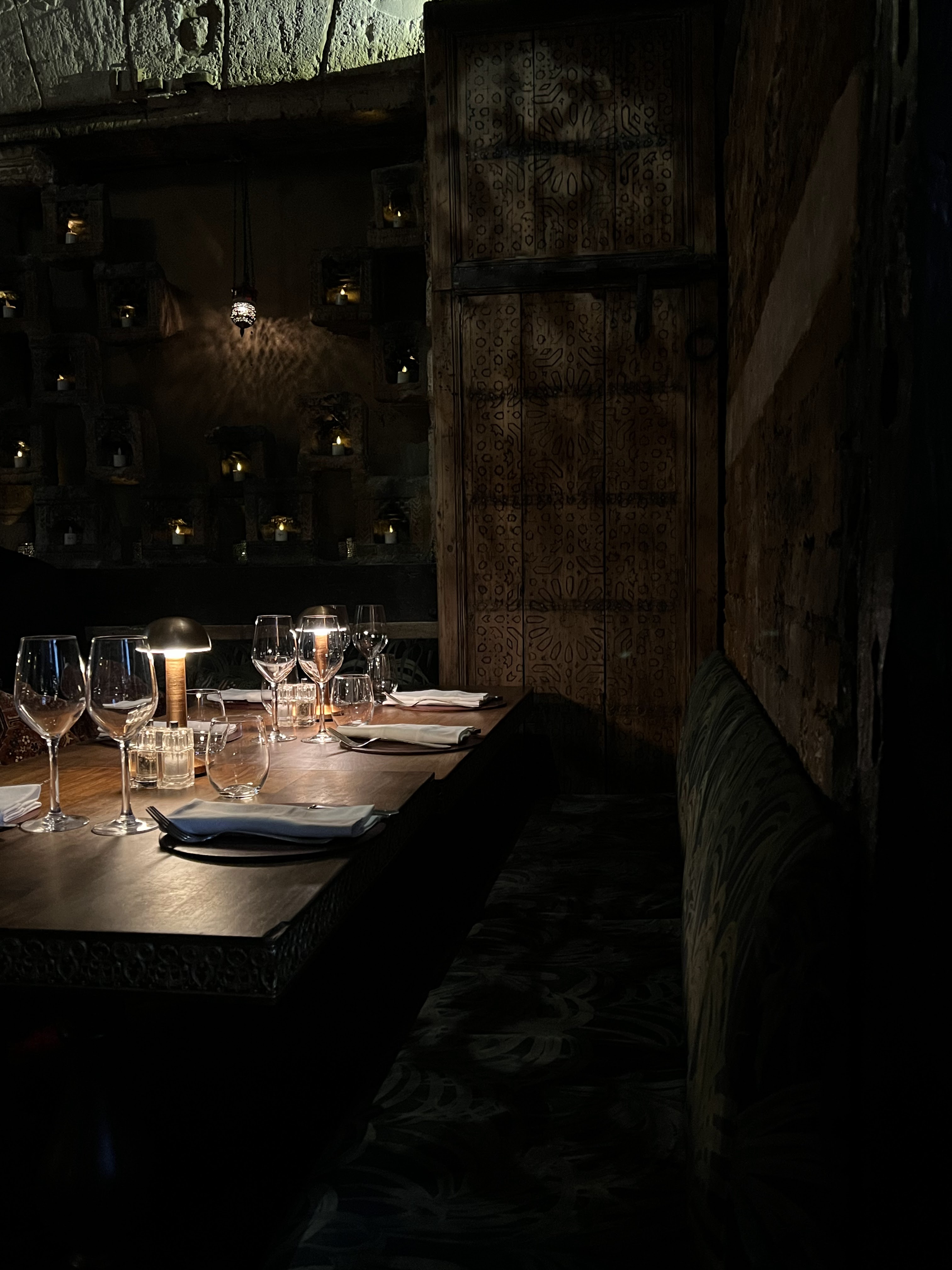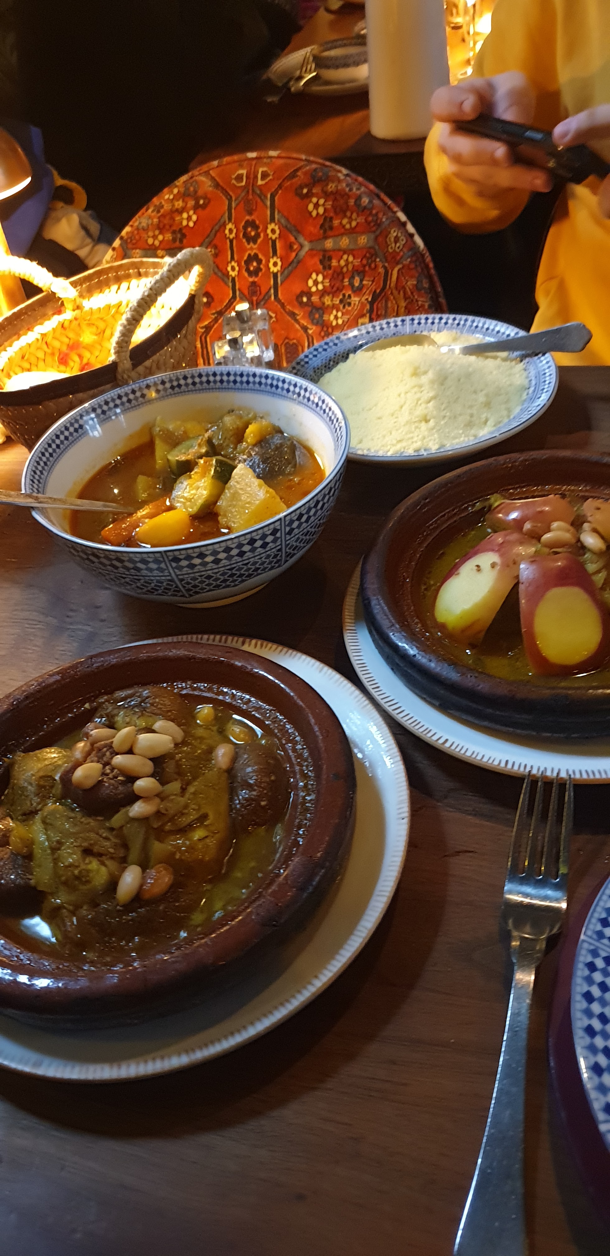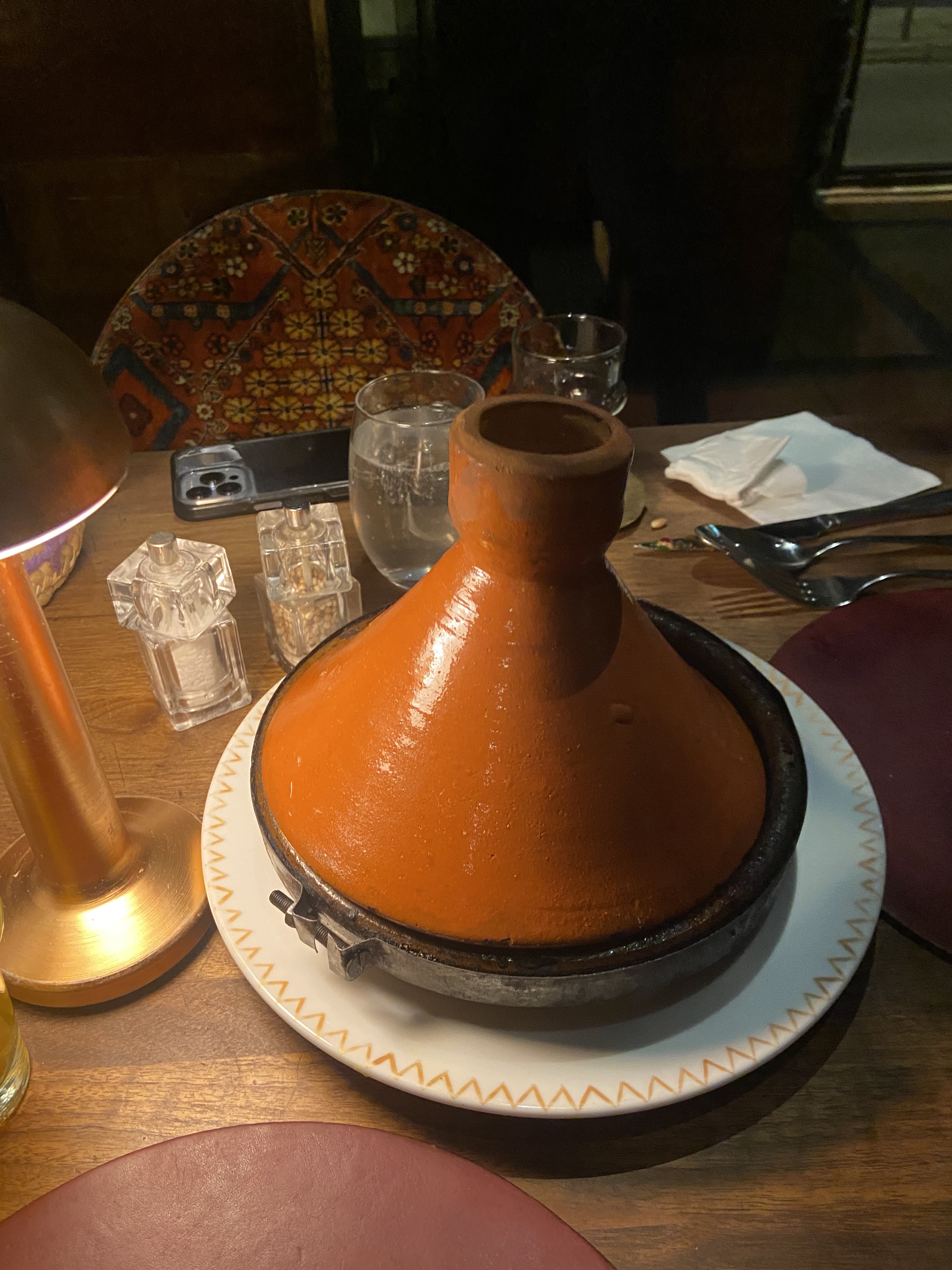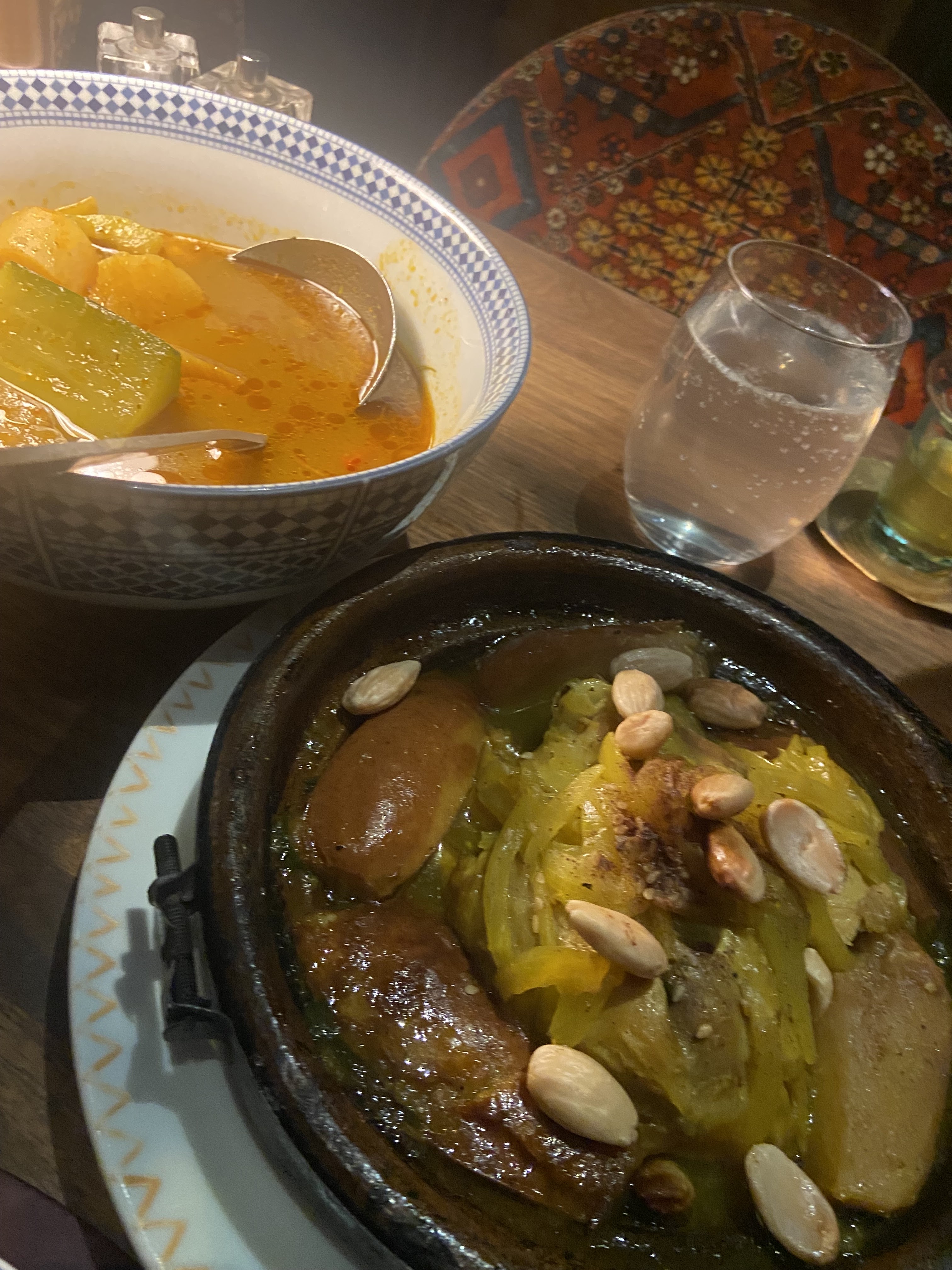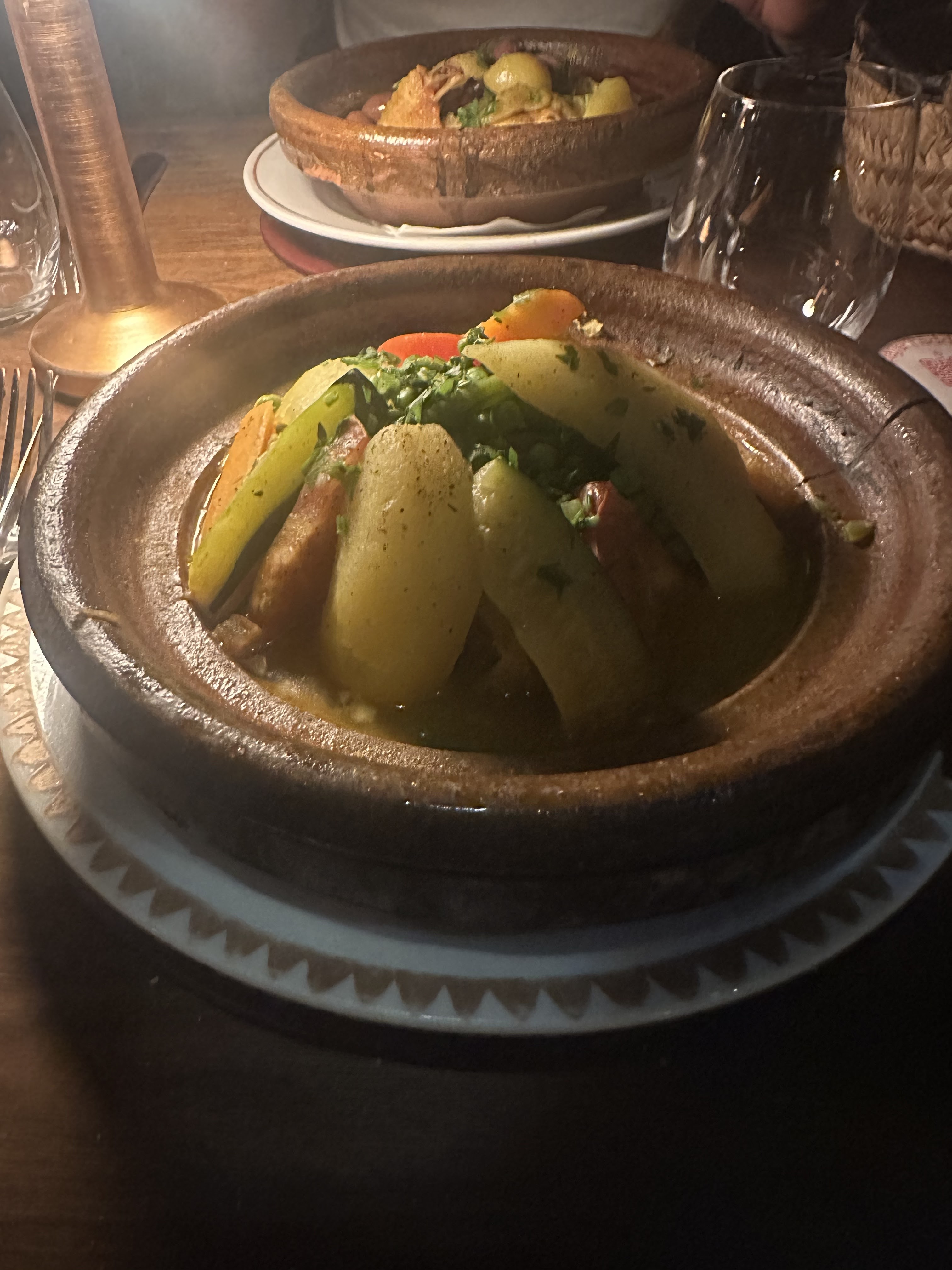 Très belle expérience, très dépaysant tant sur le décor du restau, le soir avec les lumières c’est sublime que les plats proposés ainsi que les odeurs qui nous transportent vraiment ailleurs. De plus, le personnel est très sympa. A noter qu’il s’agit d’un concept d’une table partagée ce qui gâche un peu le repas quand même… nous étions un couple au milieu d’une table de six donc de deux autres couples et clairement on ne s’entend pas et c’est une proximité pas très agréable… Rapport qualité prix très bon et couscous extrêmement copieux, le plat pourrait facilement être pour deux personnes. Viande cuite au feu de bois très bonne. Tagine de poulet aux poires incroyable. Très belle recherche du sucrée salé réussie.