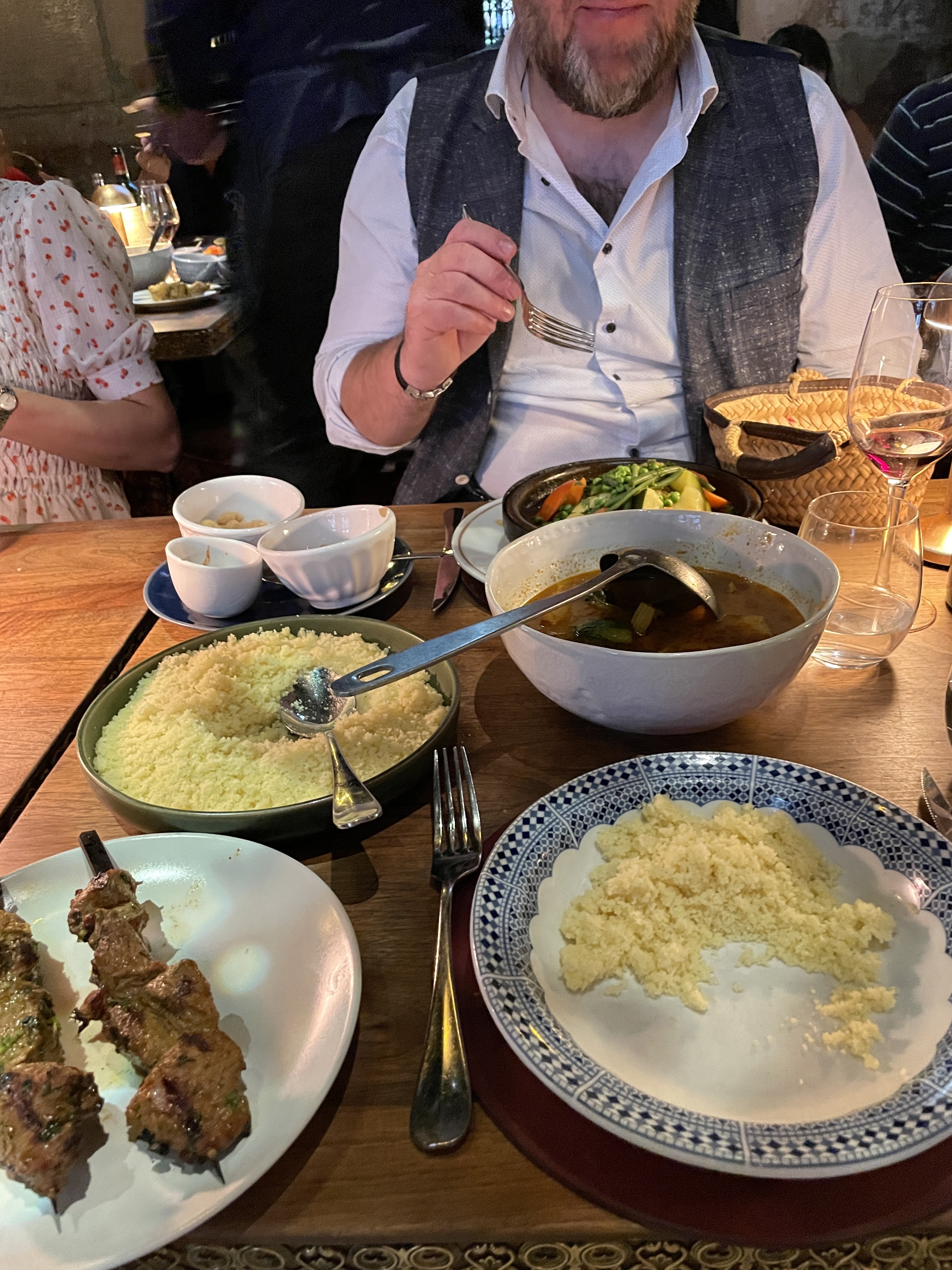 Personnellement j'évite les restaurants qui vous serrent comme dans une boîte de sardines. Lors de ma première visite j'ai commandé le couscous méchoui, 400g d'agneau braisé que je n'ai pas pu finir (sur la photo) c'était vraiment bon ! Lors de ma deuxième visite nous étions 3 donc nous avons commencé à commander 1 entrée, 2 couscous puis la serveuse nous a demandé de commander 2 entrées + 2 couscous/plats ou 3 couscous/plats.. du coup le braisé n'avait plus le même goût 😶 Est-ce une pratique normale à Paris ?
