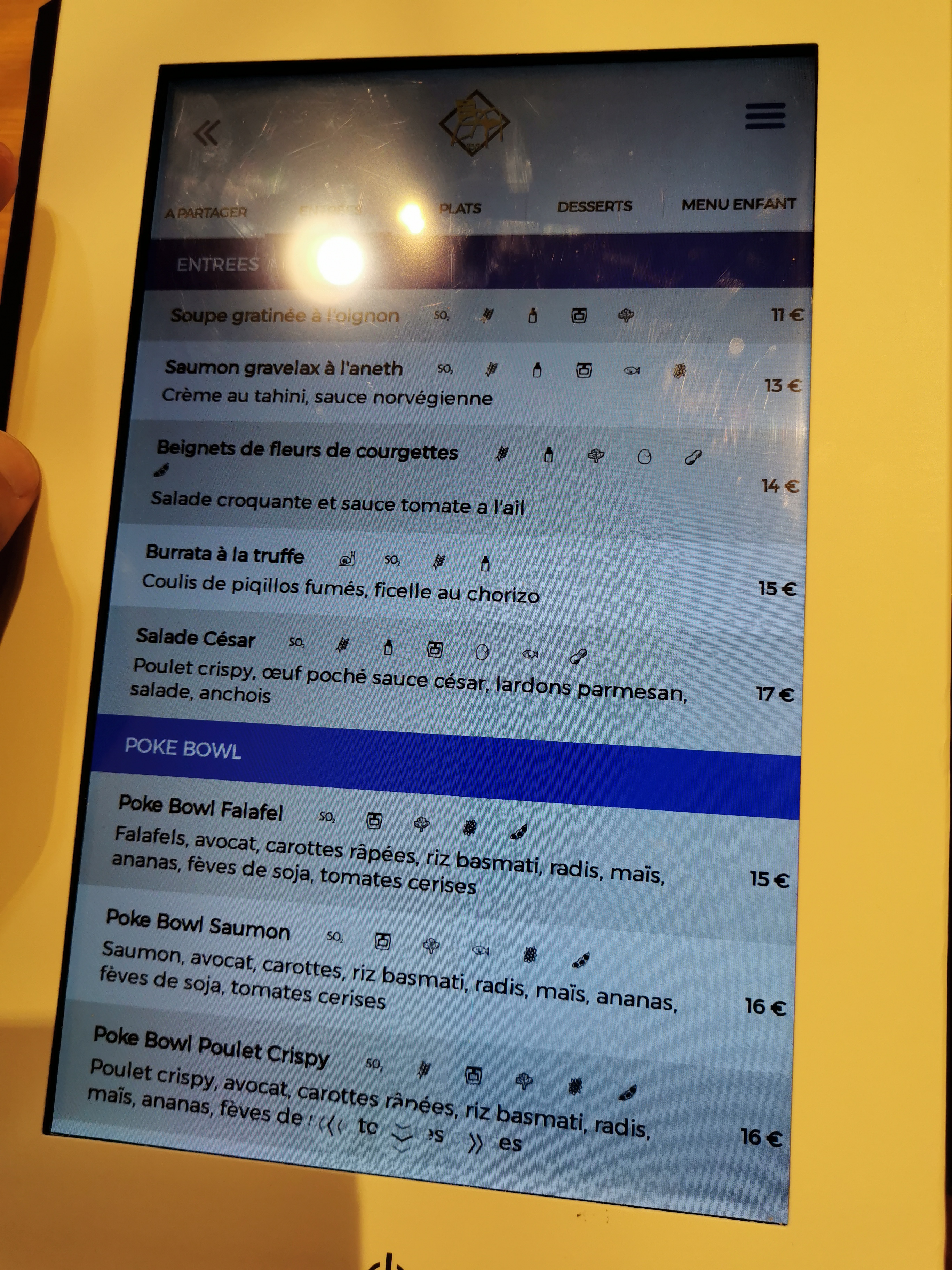 Que dire ... Le prix profite de sa localisation niçoise ainsi que de l'été finissant ainsi que de la marque Novotel. Pas excessivement cher mais au dessus de ce qui se pratique pour ce qui est consommé. La cuisine est correcte. Les plats commandés sont en adéquation avec les attentes. La carte des vins est bien fournie et à prix raisonnable. Mais l'ambiance... A peine arrivé, on me donne une tablette sur laquelle je navigue avec mon doigt. Et on m'installe à une des tables réservées aux personnes dînant seules. Ce qui nous éloigne du coeur du restaurant, helas plus animé que le côté couloir où on m'a placé Ça démarre mal... Mais arrêtez avec votre sentiment de modernité avec ces codes à photographier ou ces tablettes à explorer. La flemme et l'incompétence de managers médiocres en sont elles arrivées à ce point qu'une carte ou à la limite une ardoise ne puisse être écrite ? Cette idée sortie des enfers que l'électronique remplacerait une bonne carte à l'ancienne ne peut provenir que d'un orifice excrétant le plus honteux de l'être humain. Bref passons. Une carafe d'eau ne m'a pas été proposé. On m'a par contre rapidement fait goûter mon vin alors que je sirotais ma bière, offerte par l'établissement. Le temps que je choisisse mon menu, au moins 4 visites ont été faites à ma table me demandant si j'avais choisi. J'adore qu'on me fasse sentir qu'au plus vite je pars, au mieux c'est. C'est un choix de direction et je n'en veux pas aux serveurs qui ont été adorables ! Du coup j'ai pris mon temps pour manger. L'entrée était bonne, du poisson perroquet en marinade qui eut été parfait avec une cuillère que je n'avais pas. Je ne l'ai pas demandée car je ne souhaitais pas embêter les serveurs qui ont été particulièrement prévenant en me prêtant un câble pour recharger mes écouteurs. Le plat était très bon, très bien préparé, avec des tagliatelles fraîches et c'était délicieux. Un digestif m'a été offert par les serveurs qui, encore une fois, ont été adorables. En gros c'est dommage ! Emplacement parfait, serveurs bons, mais des choix qui visent à ne pas mécontenter plutôt qu'à satisfaire. L'expérience restera donc moyenne.