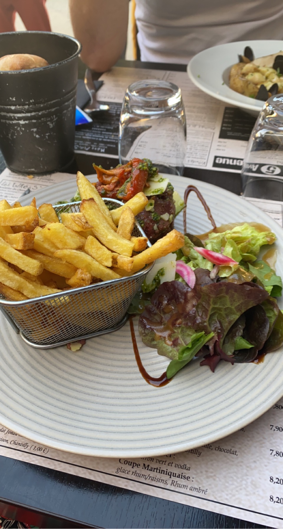Des pommes allumettes ne sont pas des pommes frites ! Servies trop cuites, d'une couleur marron prononcée alors que la table d'à côté, elles étaient presque jaunes Quant au Tartare , rien ne va , taille de coupe de la viande trop grosse (pourtant au hachoir réfrigéré) et préparation trop huilée et sans épices. Dommage , la viande paraissait bonne ..... Heureusement, la demoiselle et le jeune homme étaient charmants !