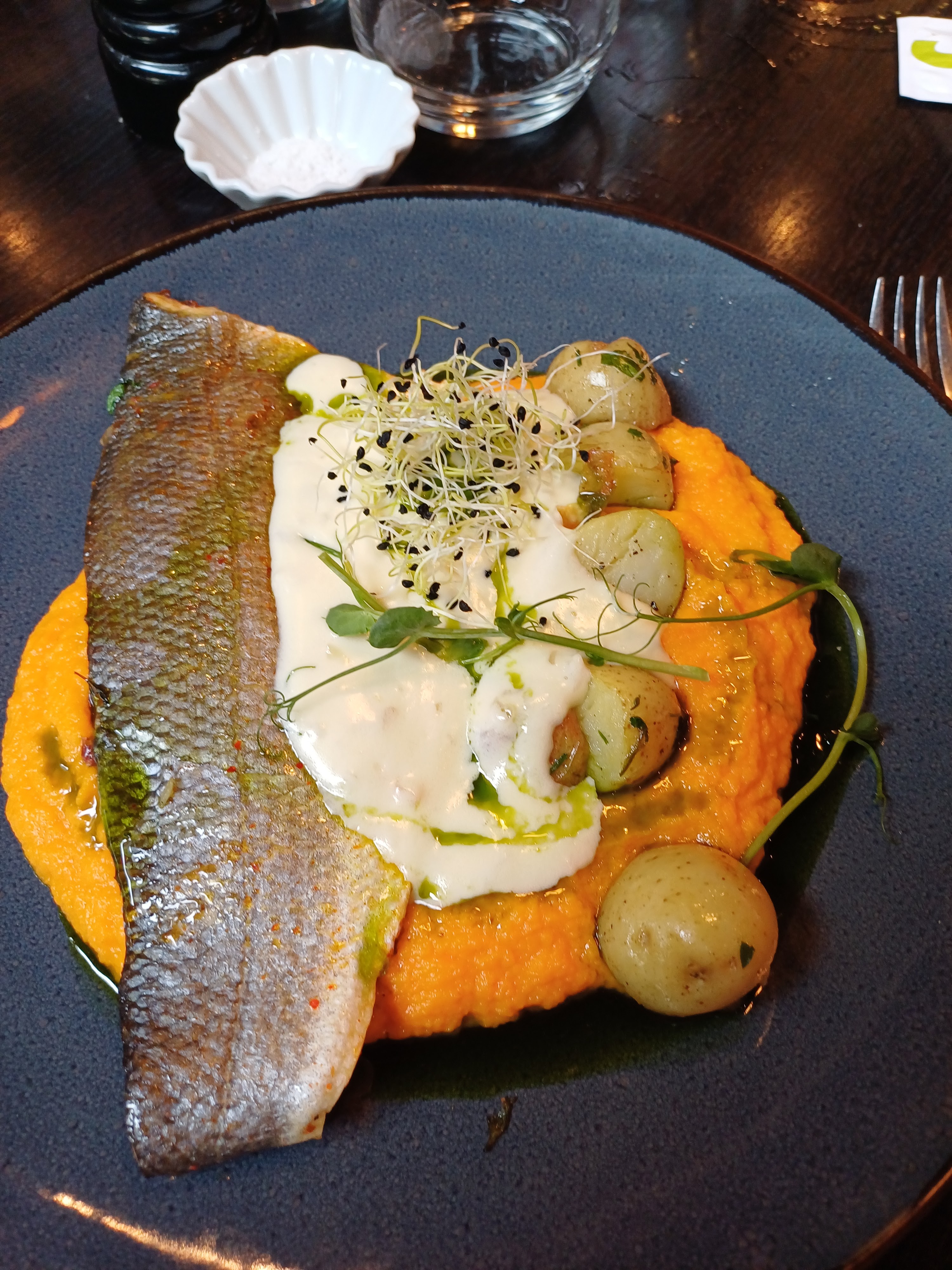 Le bar est annoncé comme fraîchement péché, à notre demande. Mais on se retrouve avec un filet de bar qui ne fait pas la taille de pêche réglementaire française, donc difficile de croire à du poisson frais. Au pire j'aurais pris autre chose à la carte si on m'avait dit que non, et j'aurais mieux apprécié mon repas