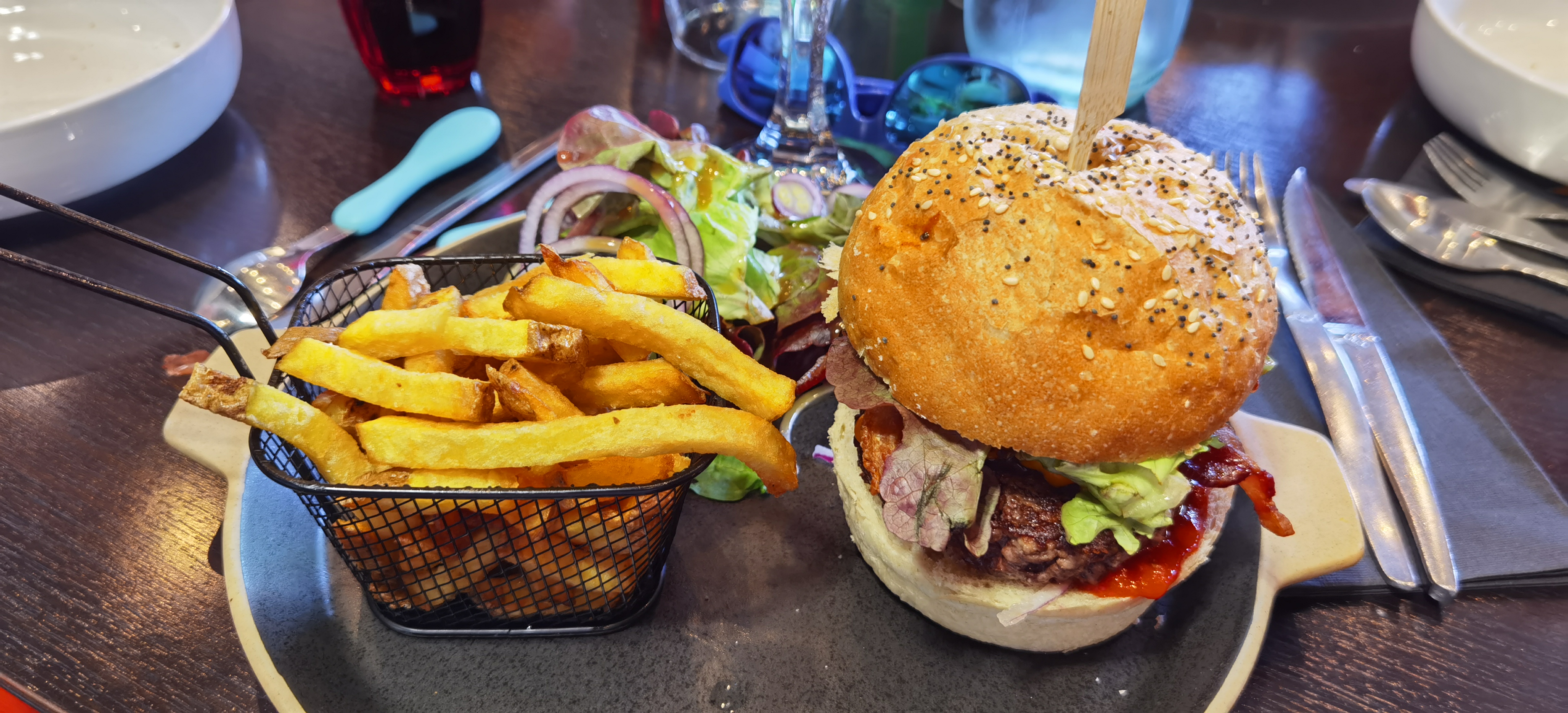 Repas pris en famille avec notre fille un midi, service rapide. Le repas était correct, mon mari a prit des moules, moi une salade qui méritait pas le prix et ma fille un burger pas super bon et ecoeurant.