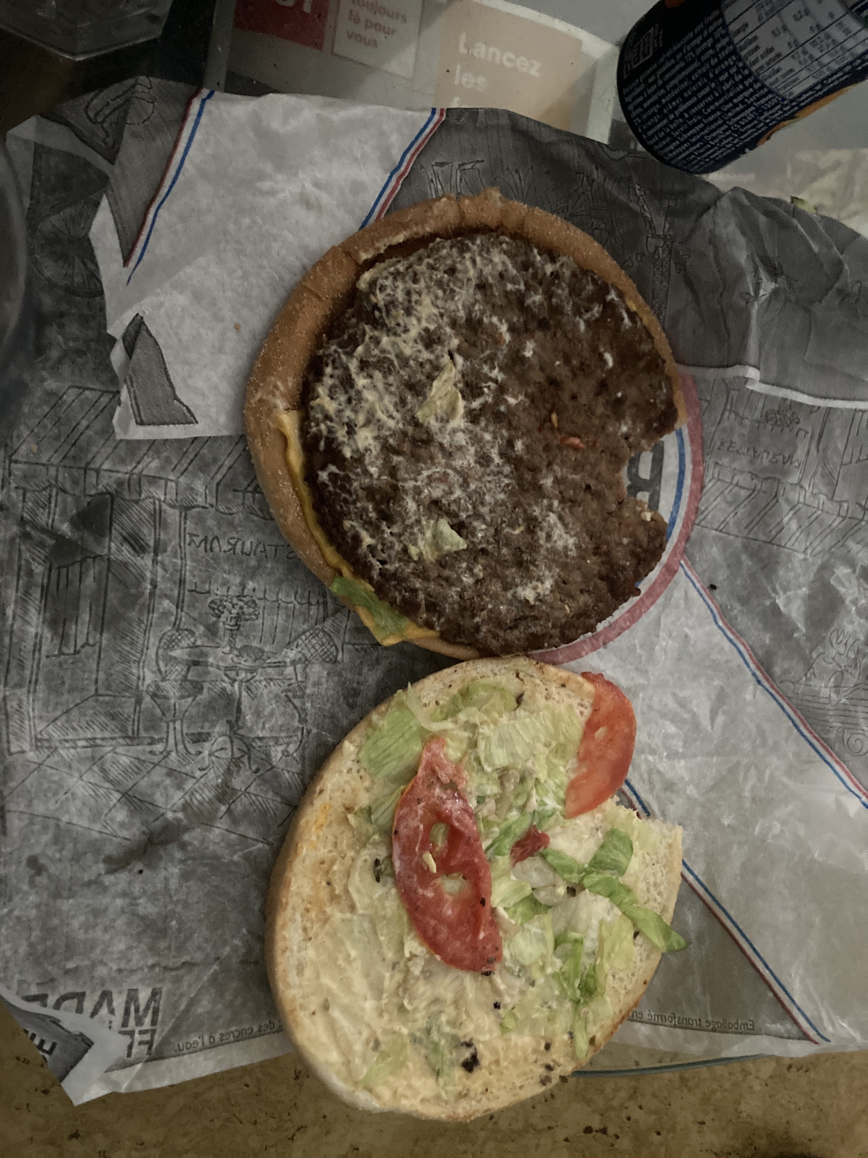 Frite molle, viande pas fraîche. J'ai même retrouver un bout de plastique dans la viande
