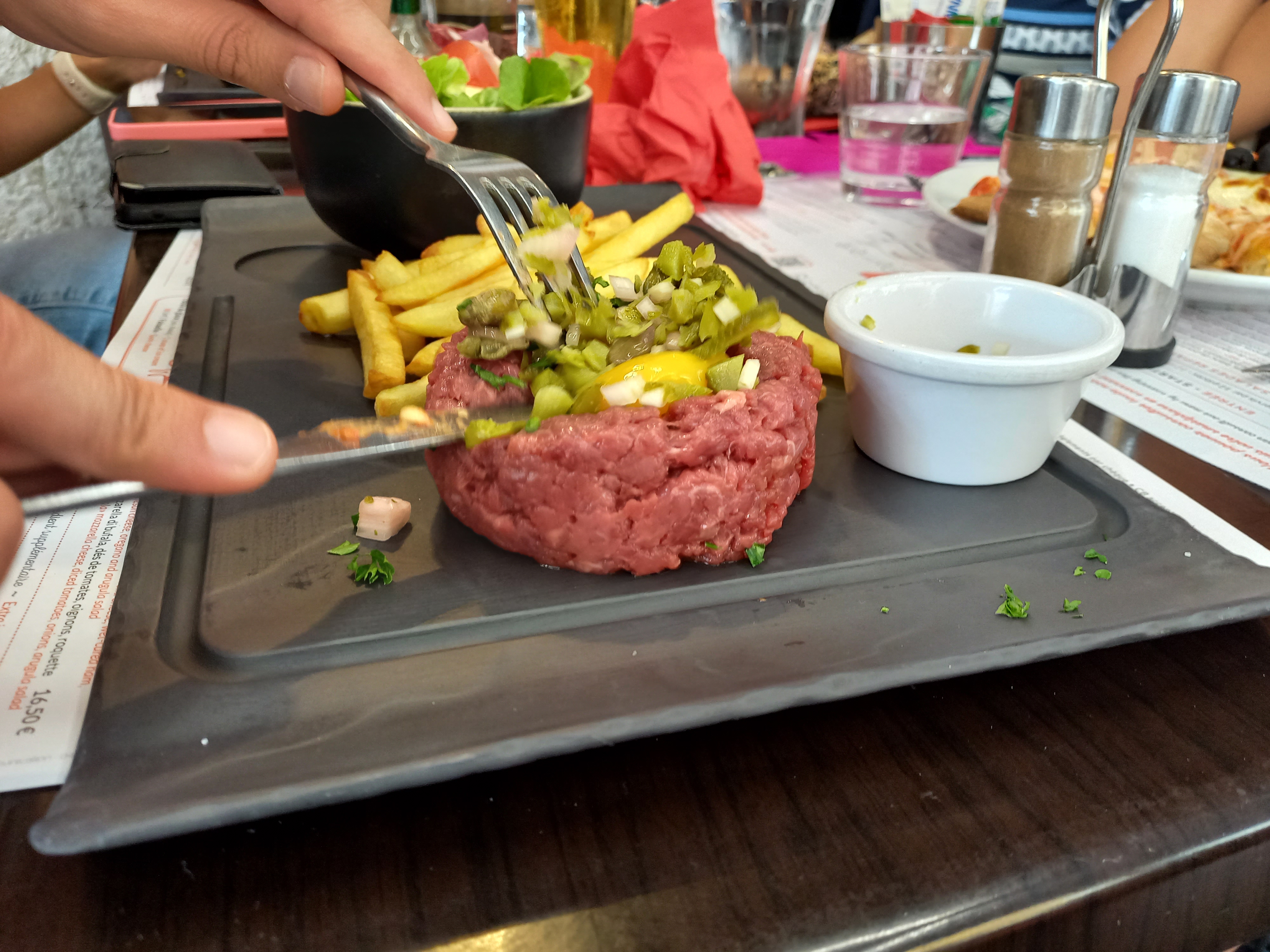 Nous sommes venu à 3 ce soir, 2 tartare de bœuf à l'italienne et 1 moules frites, accueil sympathique serveur agréable et rapport qualité prix correct aucun problème sur les propositions dans l'assiette seul bémols le Spritz servie au 3/4 du verre alors que la table juste à côté était servi rempli..