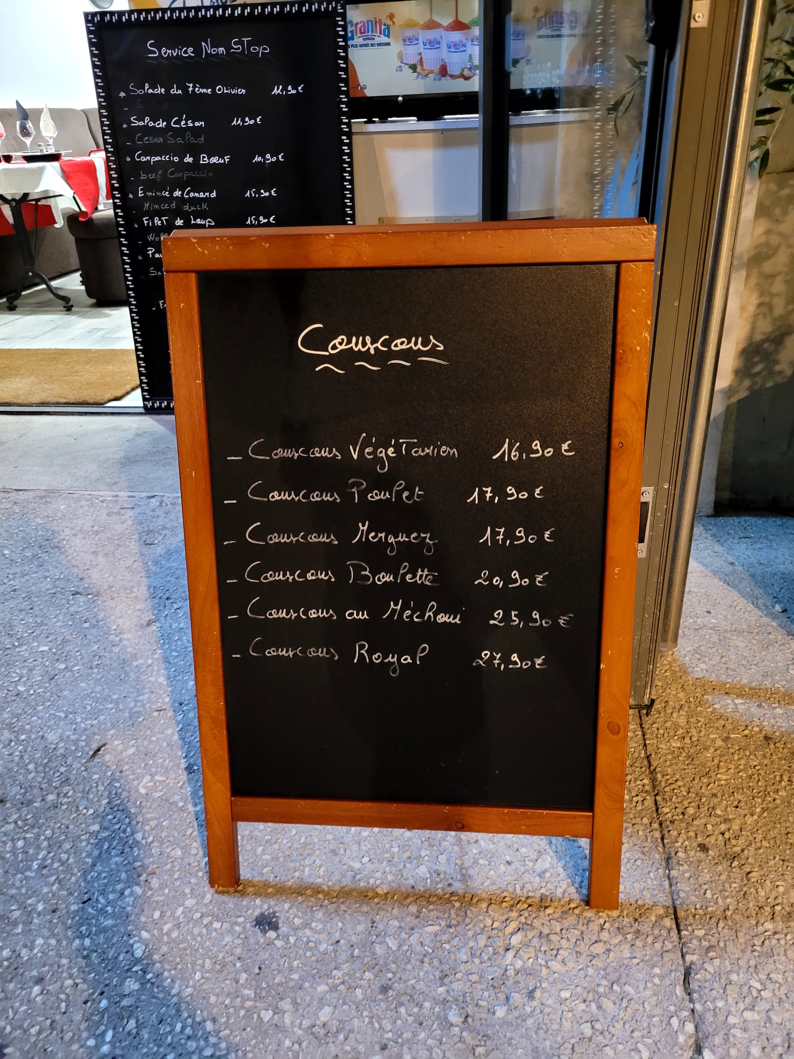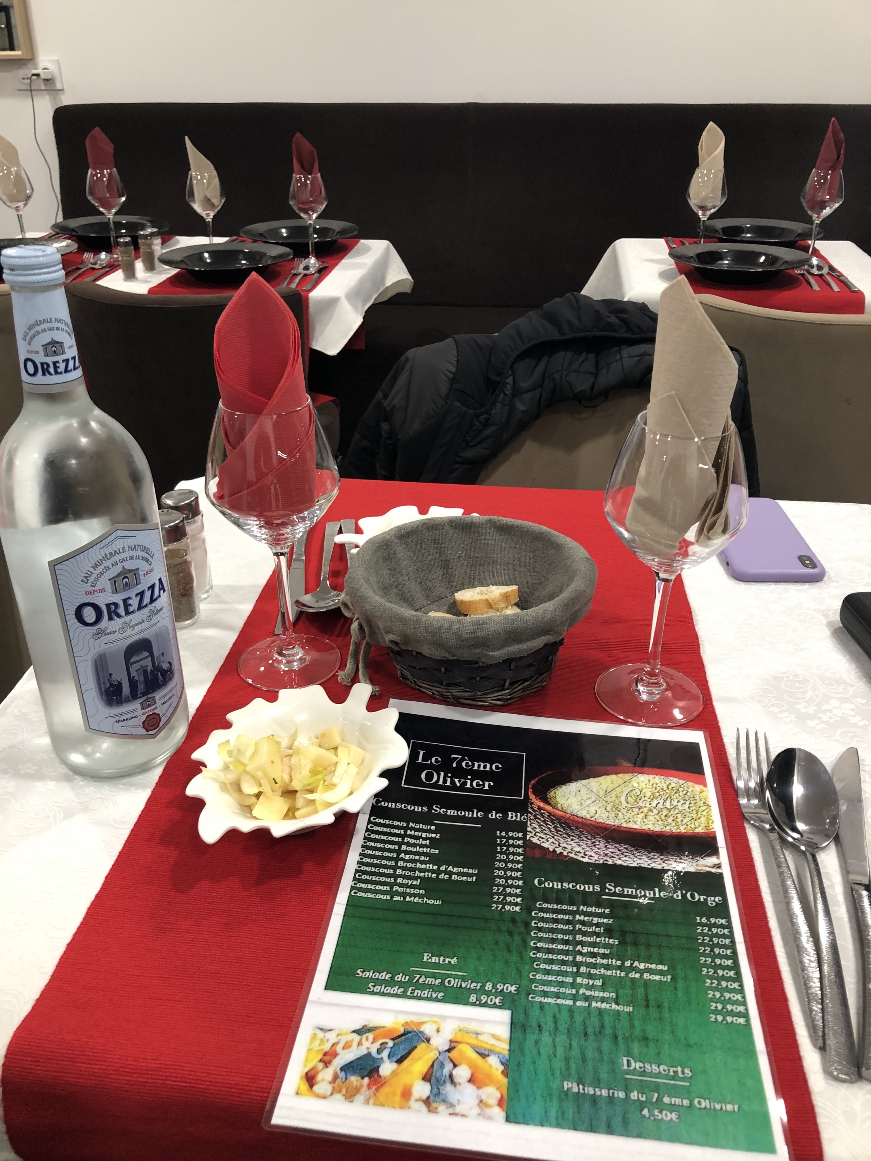 Nous sommes accueillies par une personne qui visiblement n’est pas de la profession. Il dresse la table sans savoir ou mettre les couverts … pas de serviette. Nous commandons 5 couscous , passable , harissa sortie directe du tube dans une coupelle , peu de légumes réchauffés au micro onde … pois chiche dans l’huile … le serveur qui devait être là pour dépanner de la soirée , il nous a demandé à plusieurs reprises si tout allait bien en regardant le match de foot. Pas de propositions de dessert , ni thé ou café. Cerise sur le gâteau, la machine à CB est en panne , il refuse le paiement par chèque. Une de nous se dirige vers le distributeur le plus proche qui ne fonctionne pas. Après de multiples négociations, nous repartons avec le « dépanneur » de la soirée qui n’avait de cesse de s’excuser … de ne pas être capable de répondre aux besoins de la clientèle. Nous finissons par aller tous ensemble au premier distributeur , puis au deuxième et le réglons dans la rue. Une honte …!