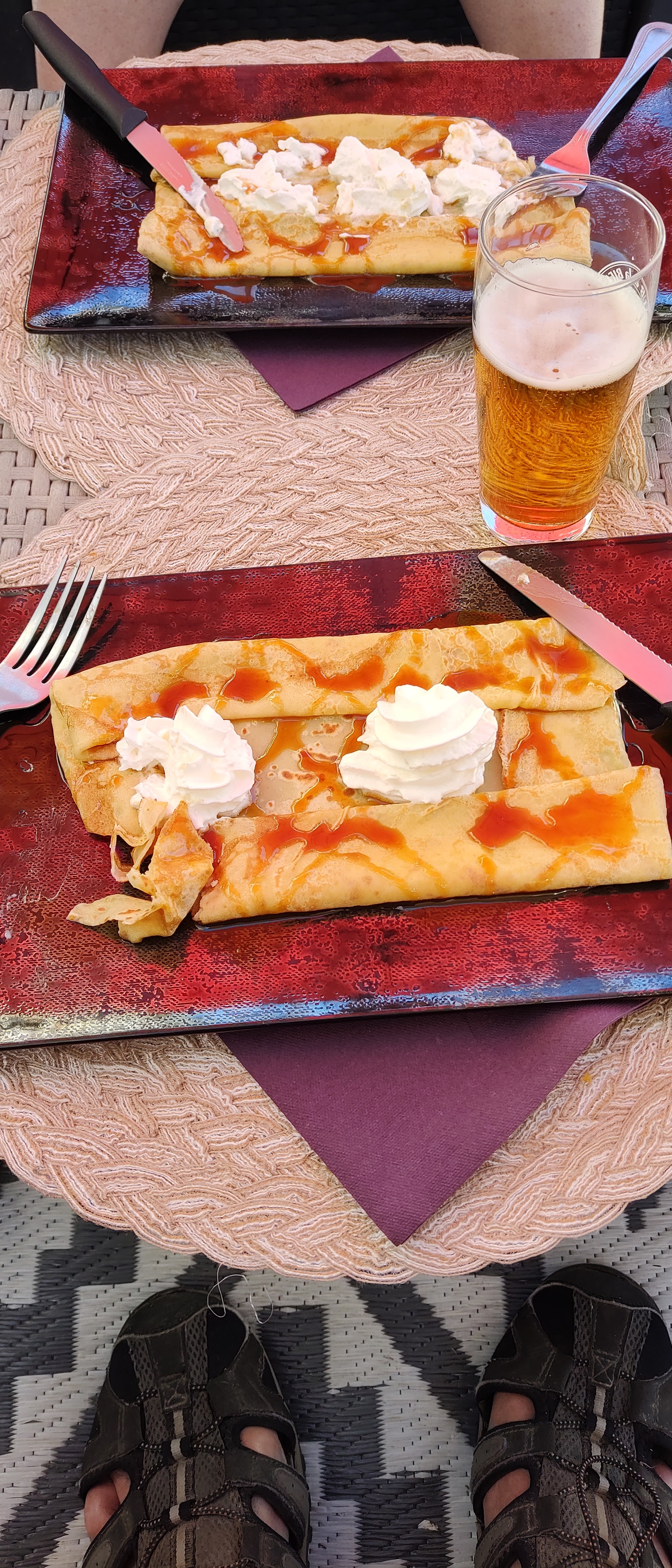 Des crêpes savoureuses et fraîches. Délicieux! Crème fouettée en bombe aérosol. Belle terrasse de jardin. Service amical.