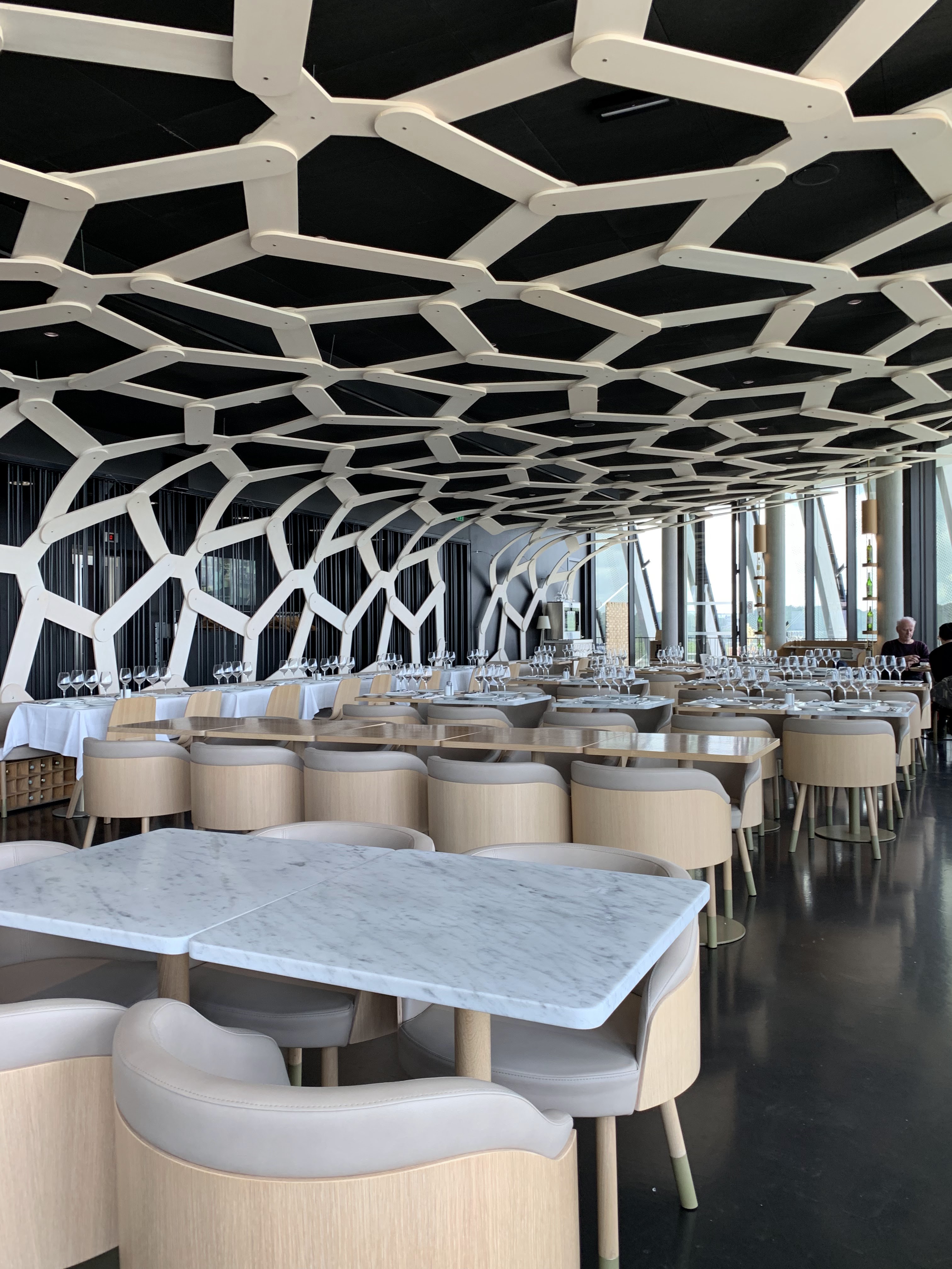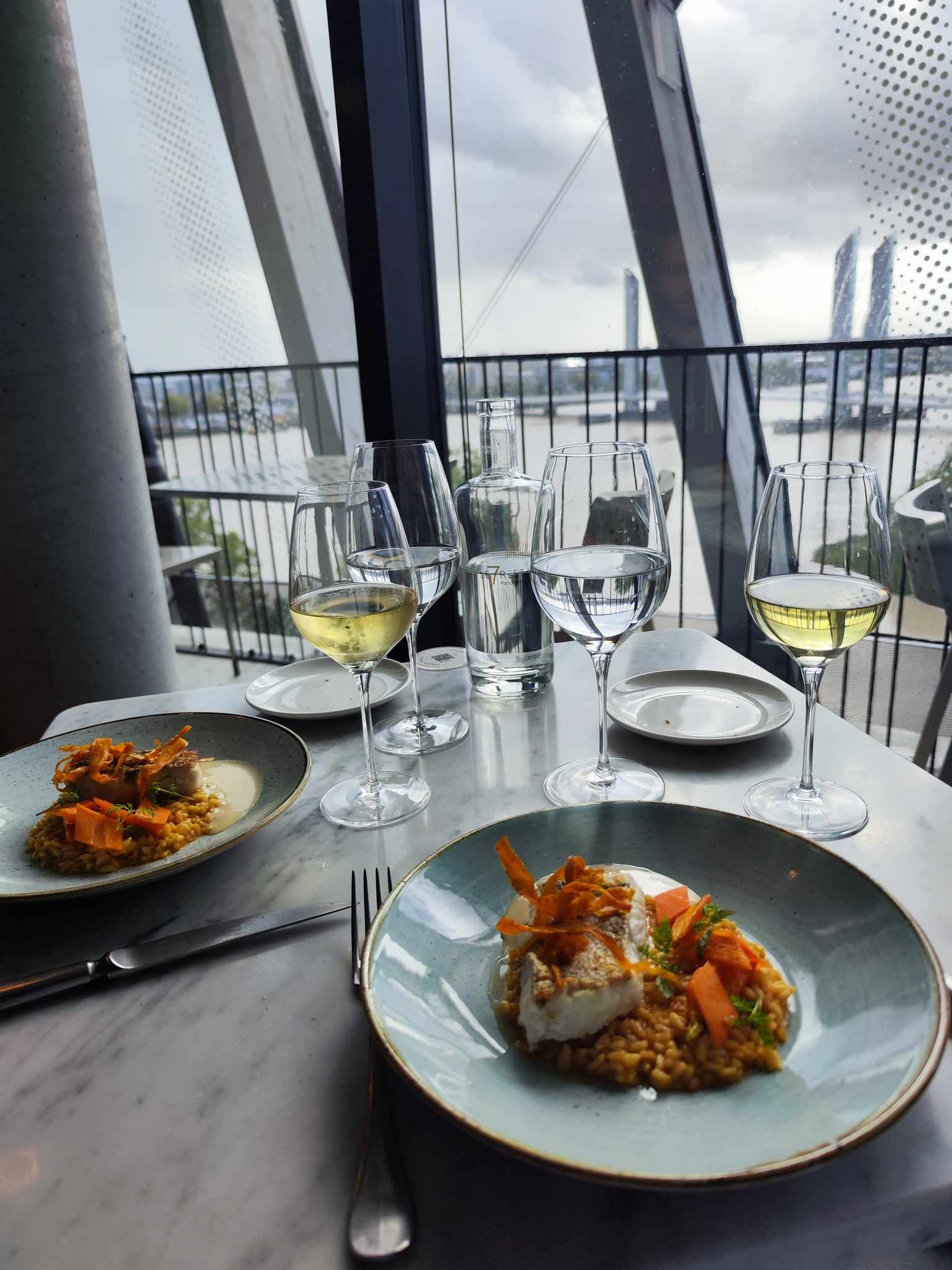 Tres bon restaurant, perché au 7ème étage de la cité du vin. Un grand côté vitré nous permet d’admirer la vue sur la ville (même si ce n’est clairement pas la plus belle vue de bordeaux ). Les serveuses sont très gentilles et serviables. Du bon vin et surtout de très bons plats. Des options végétariennes ! Le dessert à la cacahuète est excellent!