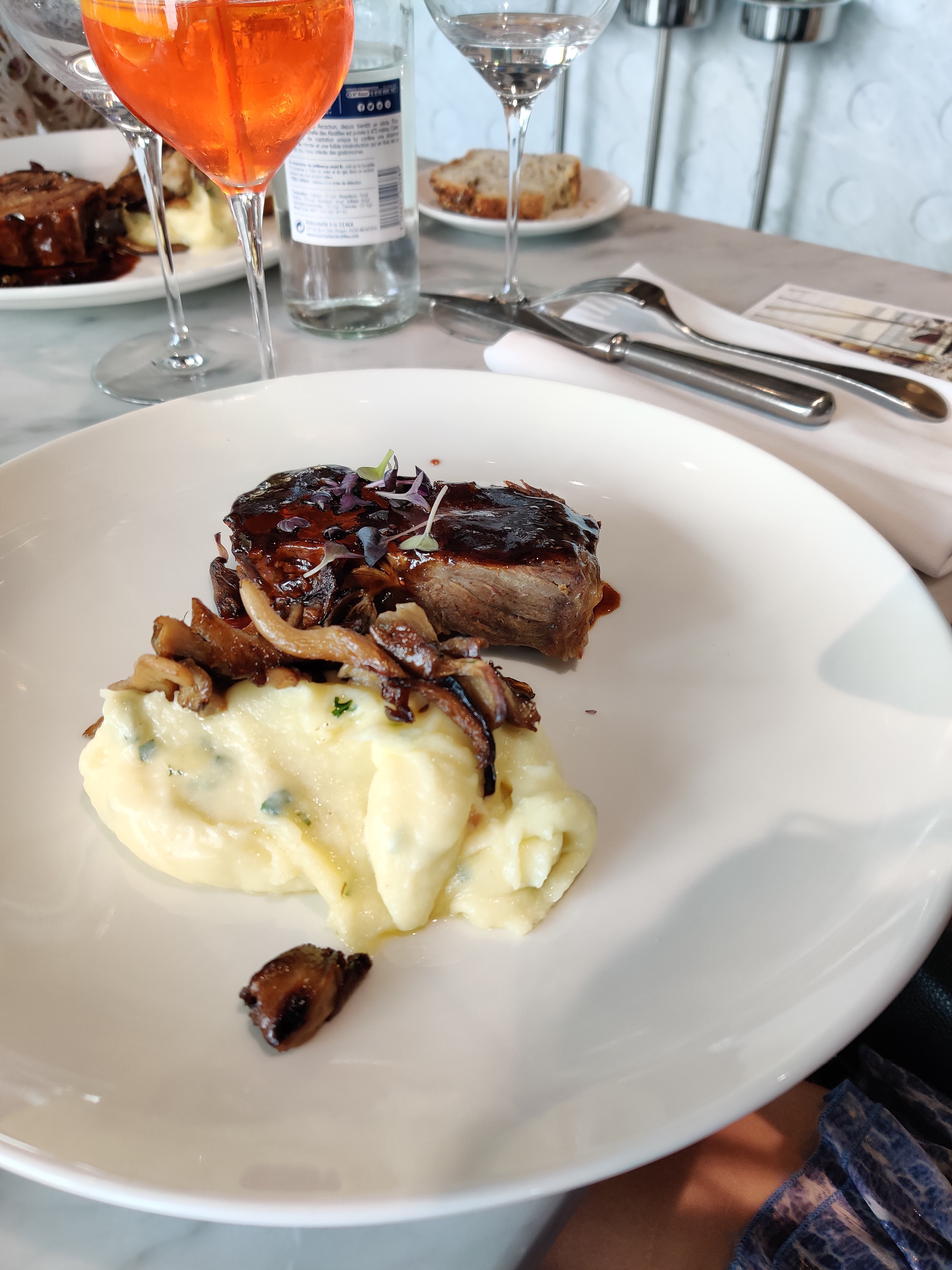 Nous étions au restaurant, c'est un beau lieu avec une belle vue. Le repas était bon mais assez simple. Le plus triste est que le serveur n'a pas su nous conseiller sur... le vin 🍷 un comble...
