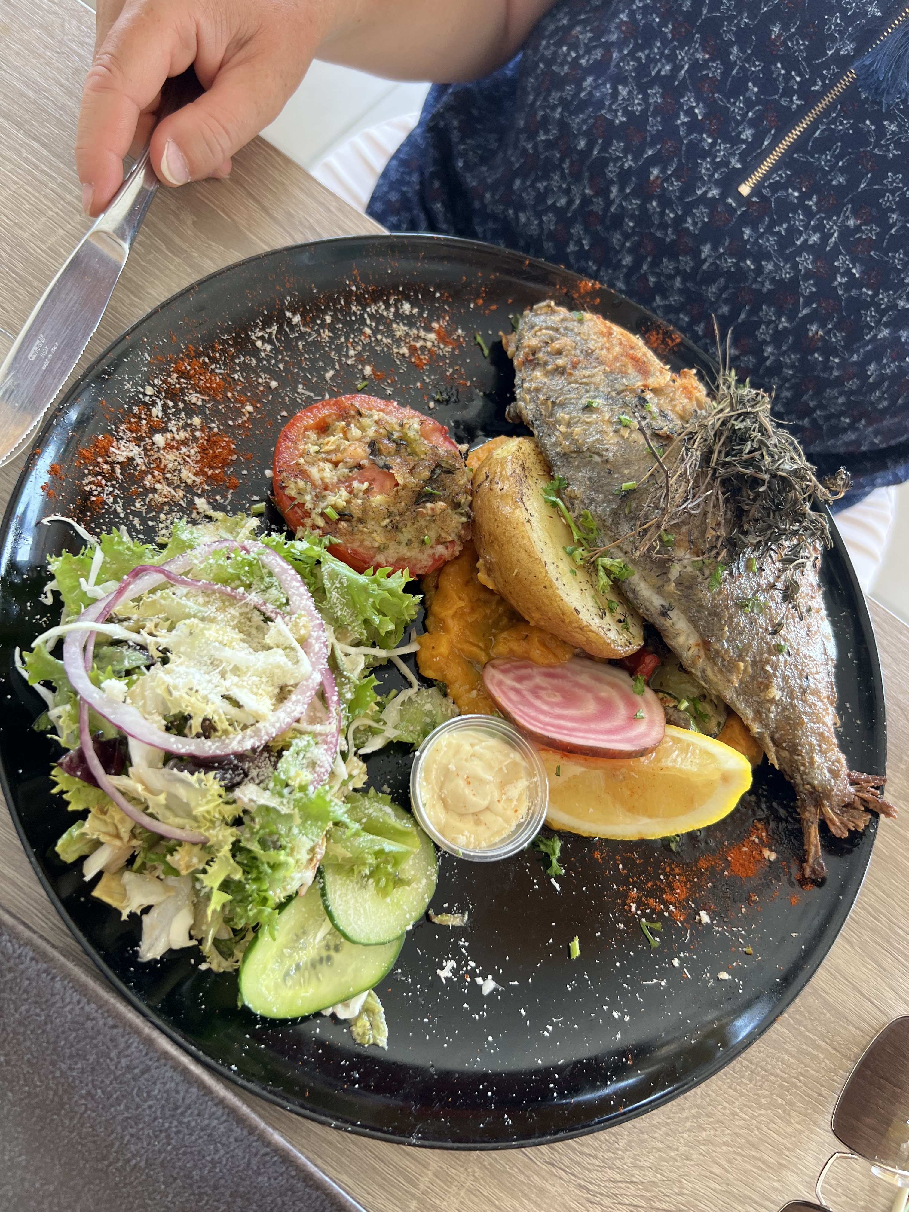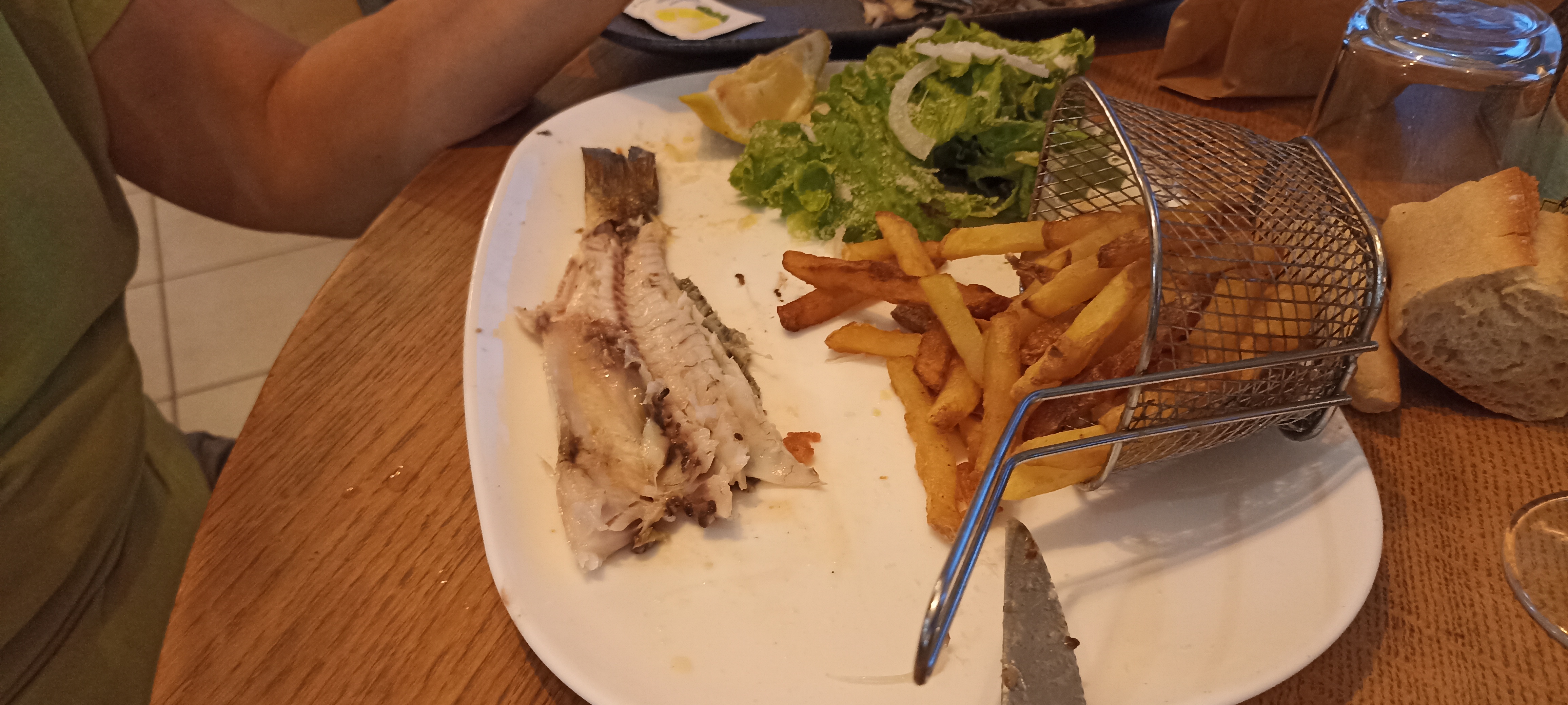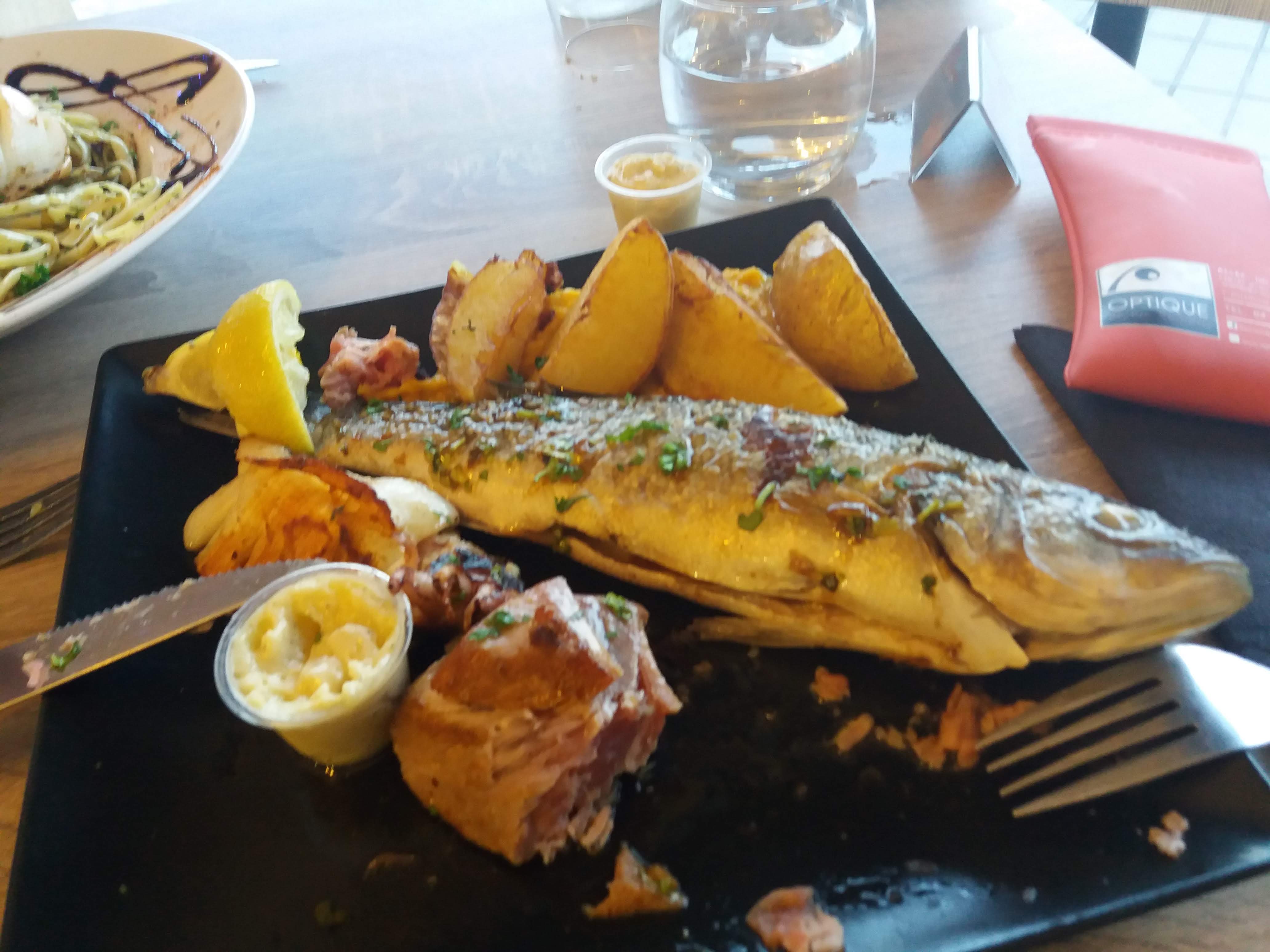 Daurade fraîche de 400g, vue sur le port et serveur super sympa qui nous a indiqué les meilleurs points de vue de la ville. Merci 😎