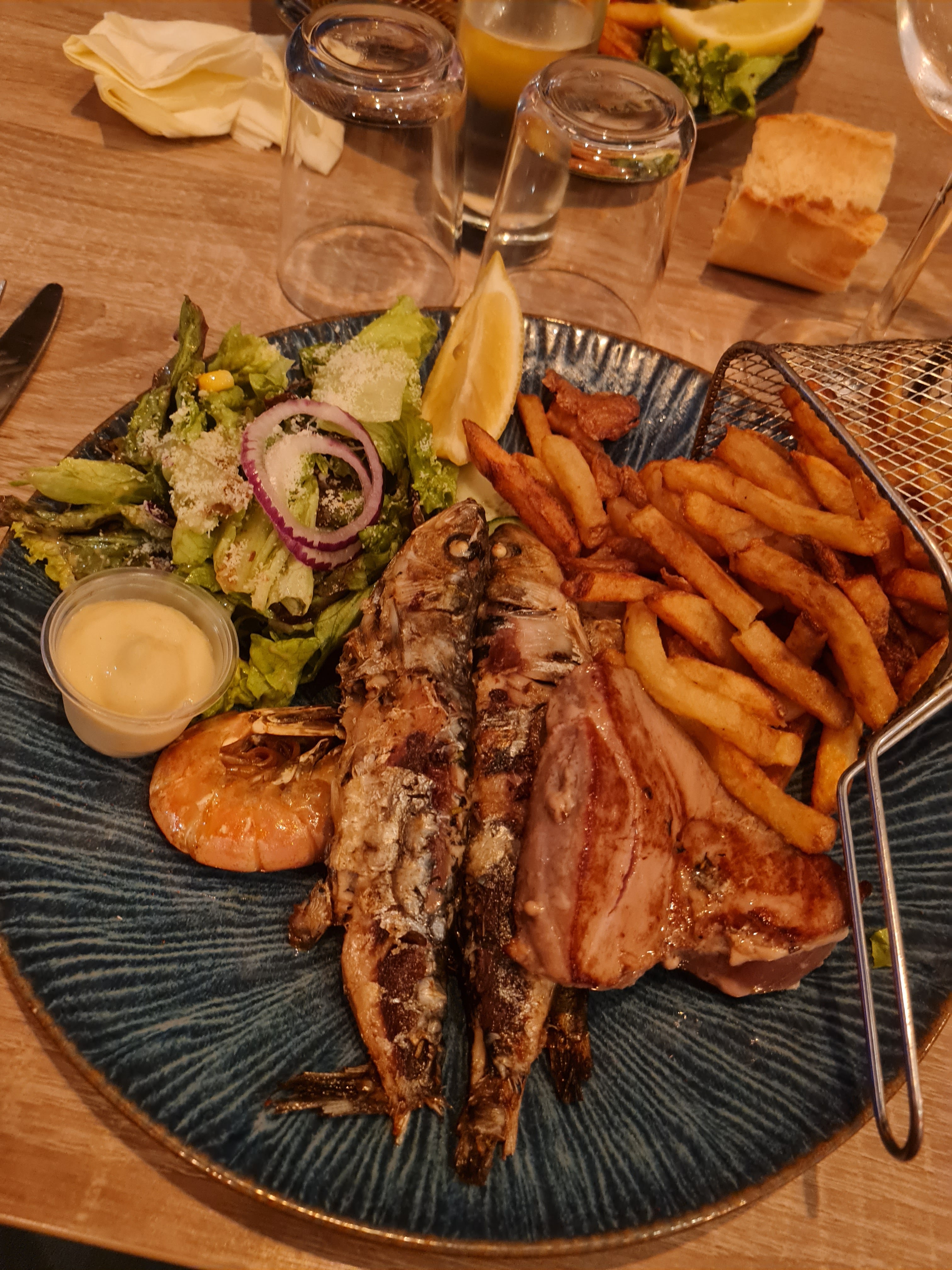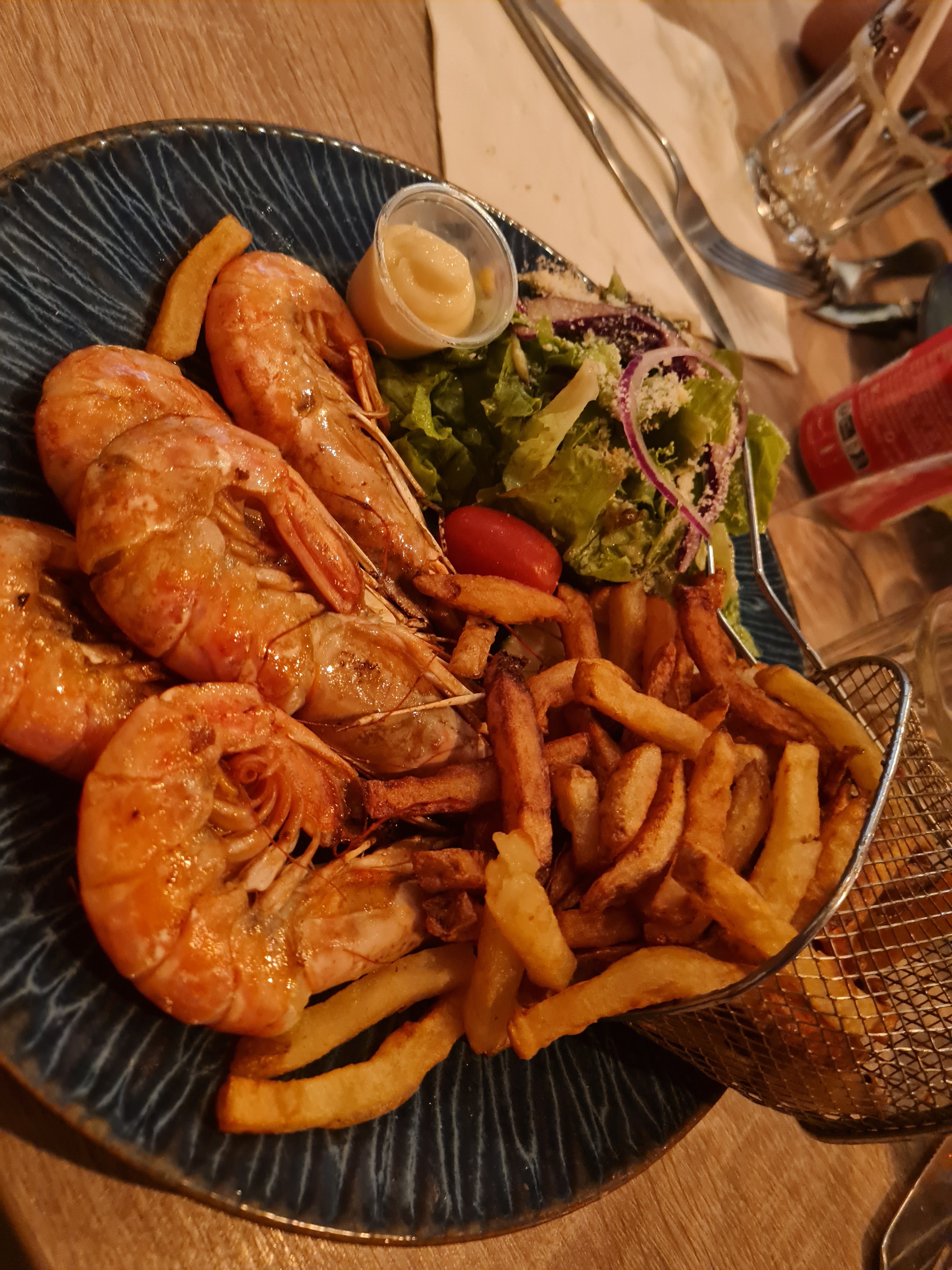 Petite carte avec que des produits frais. Ma conjointe a adoré les gambas avec la sauce aioli. Personnellement j’ai mangé une entrecôte frites (maison), rarement comblé de la sorte ! Je recommande à 100% 😄
