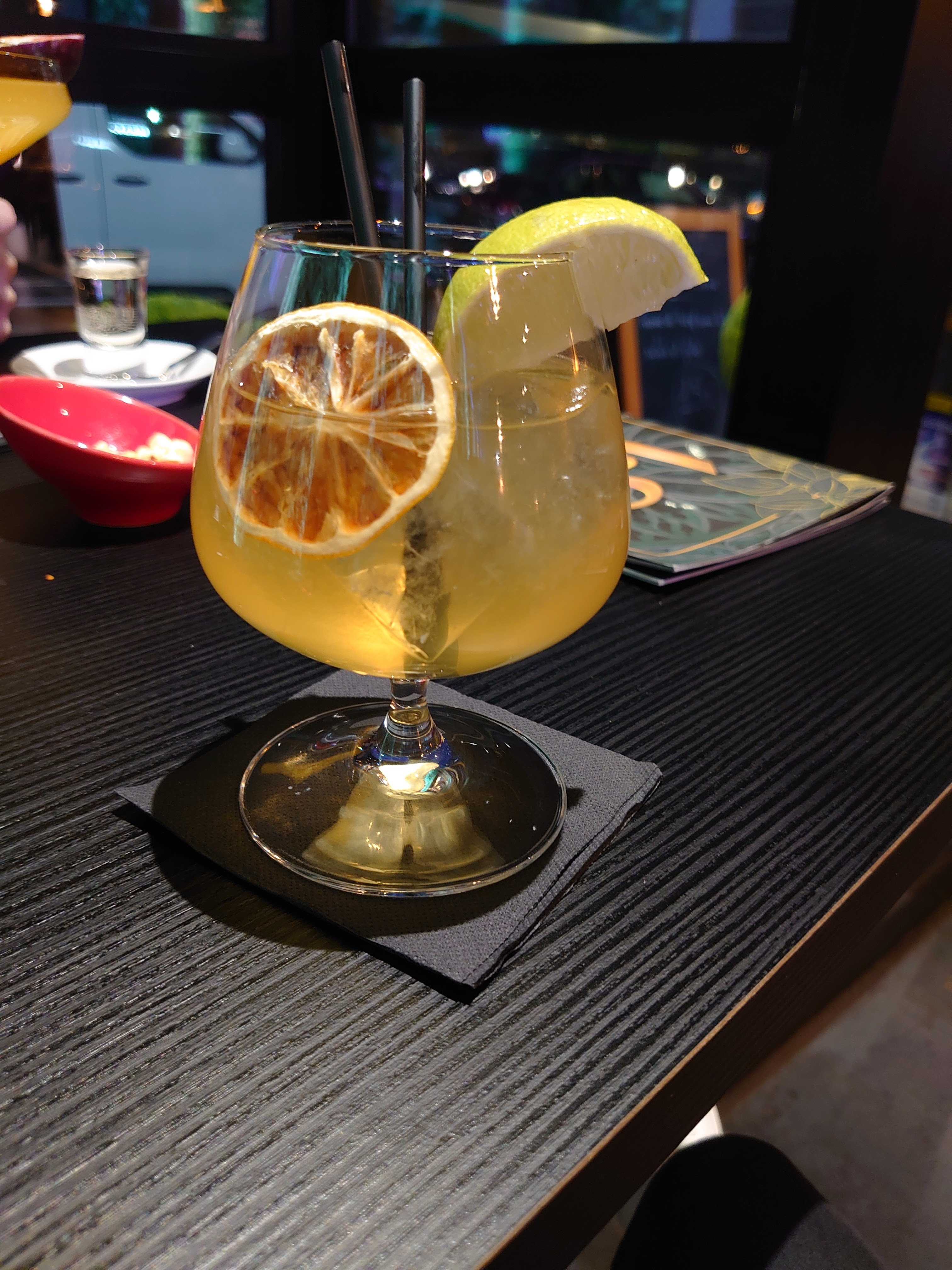 On a passé une bonne soirée nous sommes arrivés aux environs de 21h sachant que le restaurant fermait à 23h cependant le serveur nous a annoncé les couleurs on nous disant que la cuisine fermait bientôt il nous a proposé de commander malgré ça nous avons pris deux cocktails et une entrée qui étaient tous deux très bon on a prix un cocktail avec alcool et un autre sans celui sans alcool était juste excellent et la personne m’accompagnant était totalement du même avis concernant le sien nous n’étions venus que pour prendre un cocktail mais j’ai été tenté par une entrée et le serveur a été très serviable et après avoir passé ma commande en moins de 10 min je l’avais reçu c’était très goûteux et la présentation était très bien aussi