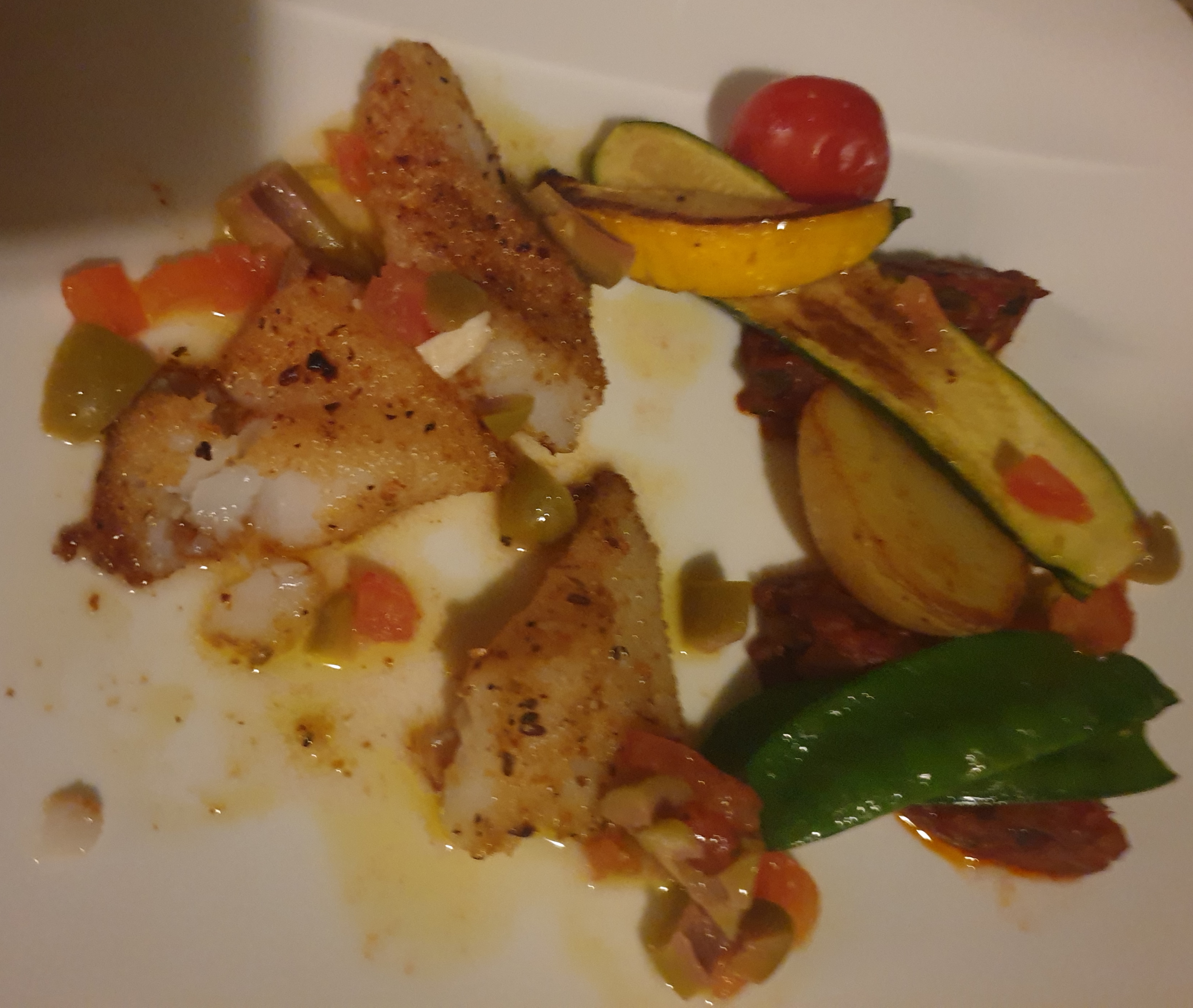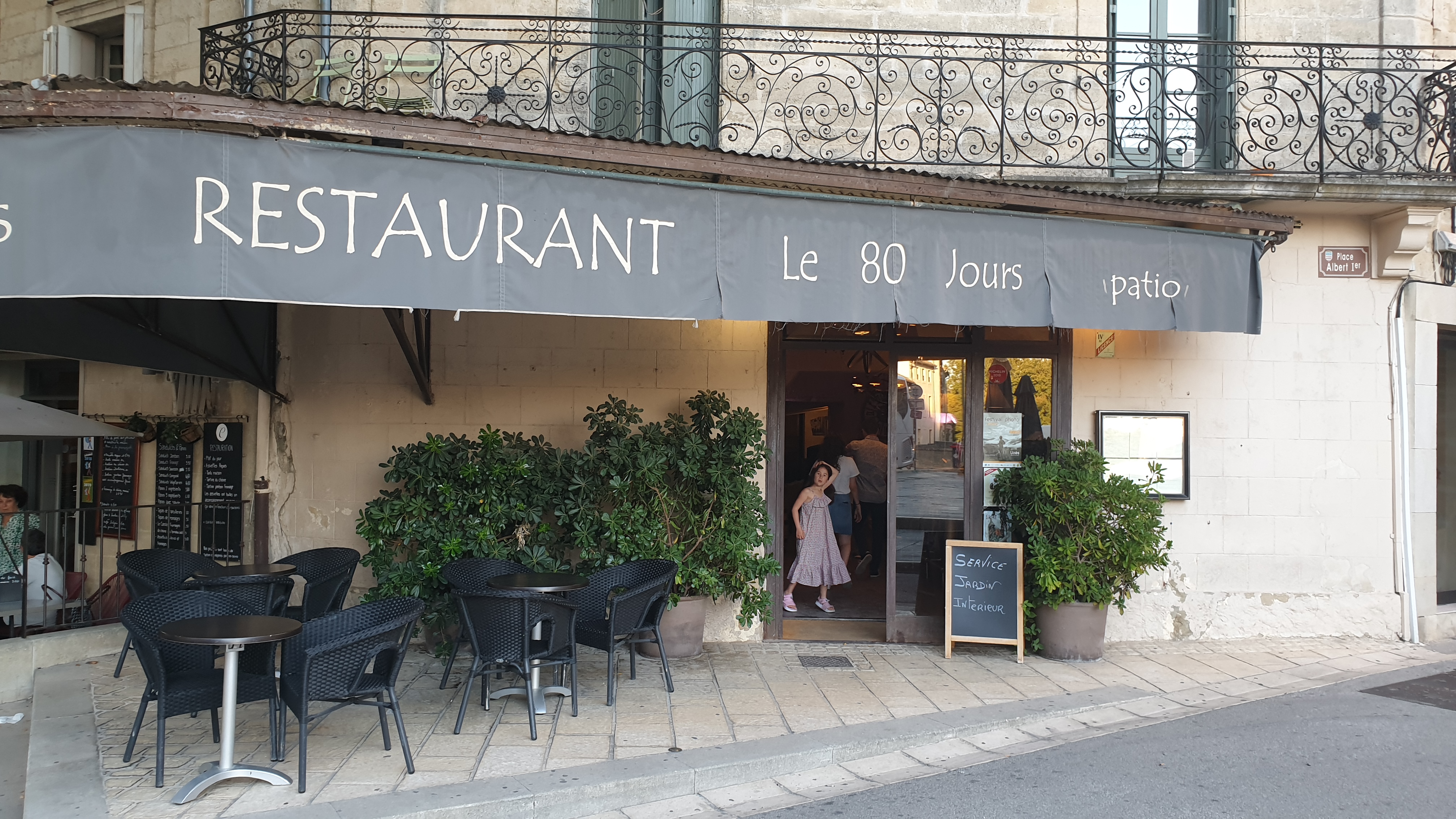 À notre arrivée personne et à notre départ un couple : serait ce un signe ? Nous sommes allés au ‚80 jours’ car nous avions entendu dire que c’était une valeur sûre d Uzes. Peut-être avions nous trop d’attentes car au final nous sommes déçus. Le plat : dos de cabillaud grillé avec des pommes de terre en écailles. Le poisson était roulé dans une feuille de brick, il était bien cuit ; à côté il y avait quelques légumes al dente (très) sans trop d’assaisonnement : à notre goût c’était fade. Le dessert : un nougat glacé La glace était bonne, j’en aurais mangé plus. Enfin : plat dessert 38 euros et les portions ne sont pas des plus généreuses.