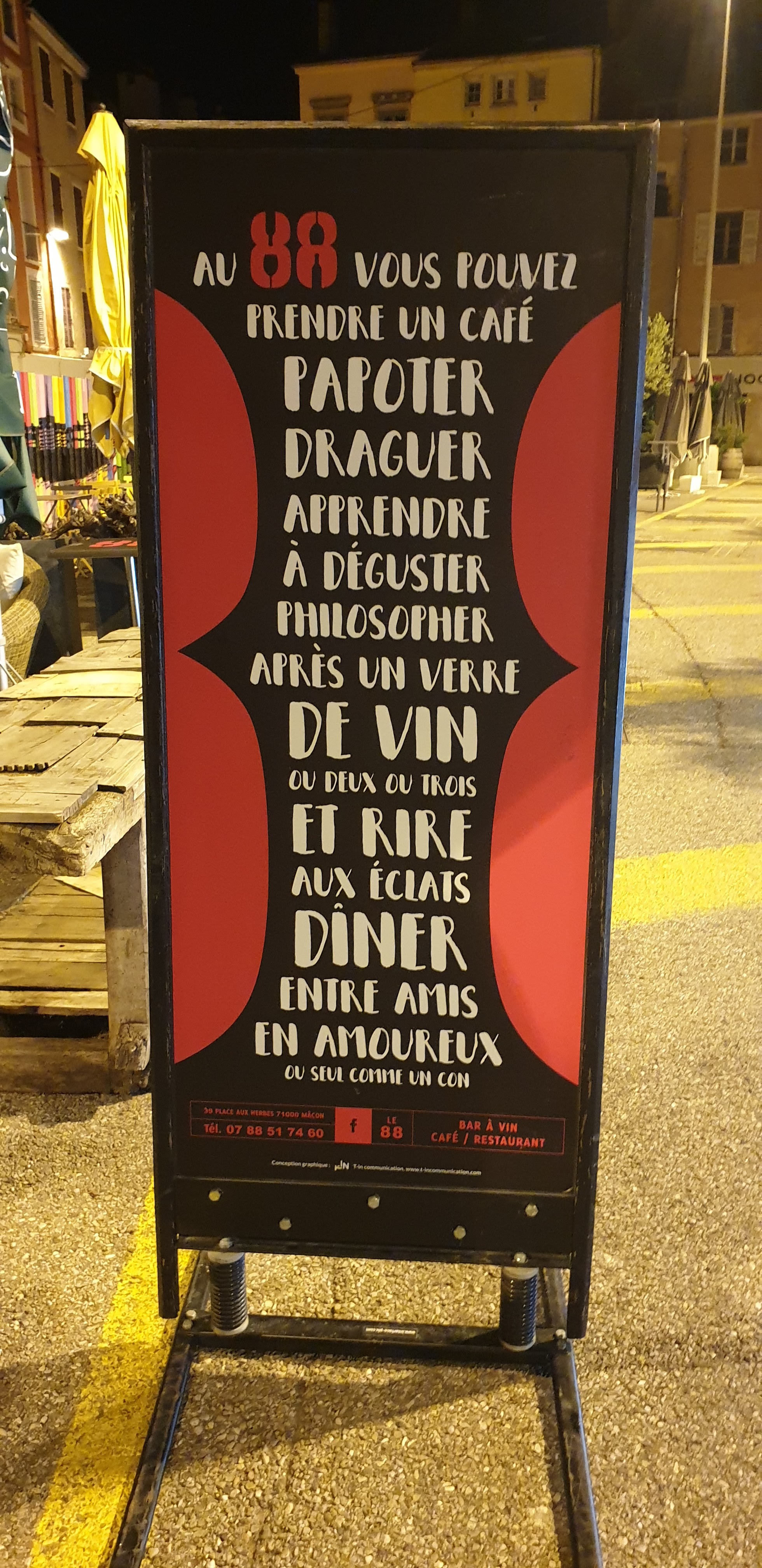 Un lieu incontournable tenu par un tenancier exceptionnel. Passionné des bons produits, Momo au commandes du 88 vous fera voyager parmi sa carte des spiritueux incroyable, vous comptera l'histoire régionale à travers les vins mâconnais...un cadre chaleureux a l'intérieur, une déco design et contemporaine à l'extérieur..des produits frais dans l'assiette..bref idéal pour passer un délicieux moment