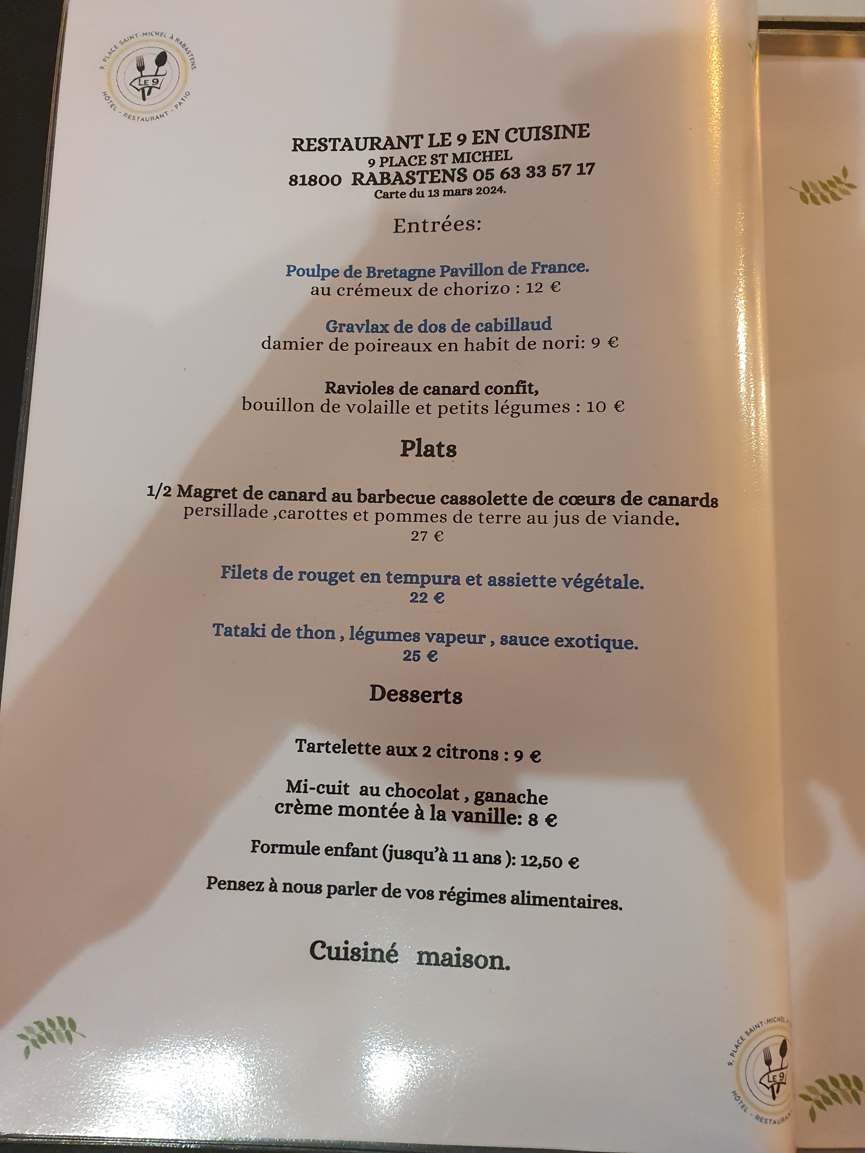 Le 9 en cuisine est un nouveau restaurant sur Rabastens avec un service de qualité et des gérants très sympathiques, à l'écoute de ses clients. Niveau cuisine, le tartare était très bon avec une viande fraîche et un accompagnement généreux. Je vous recommande ce restaurant où le lieu est aussi agréable que le service.