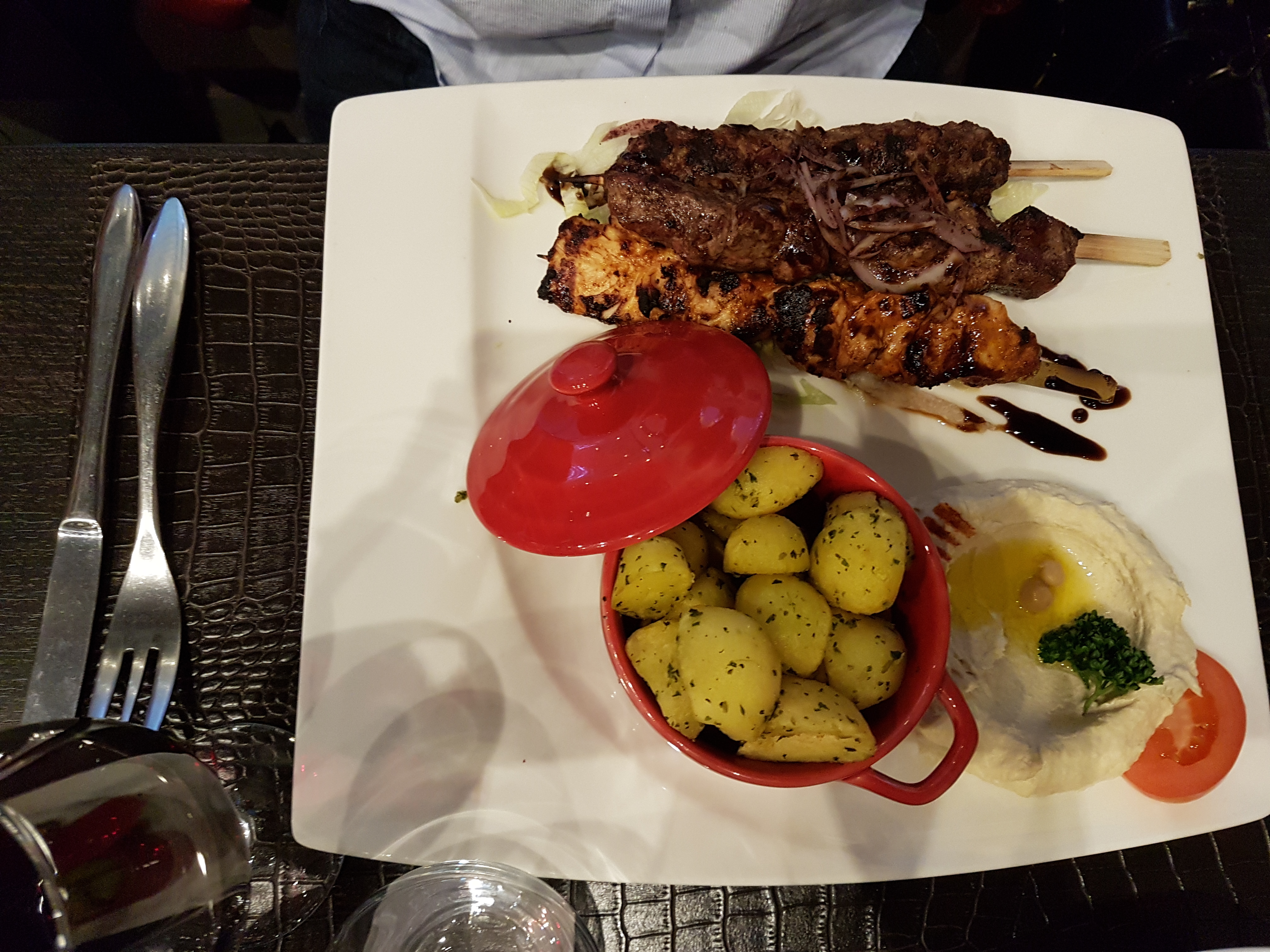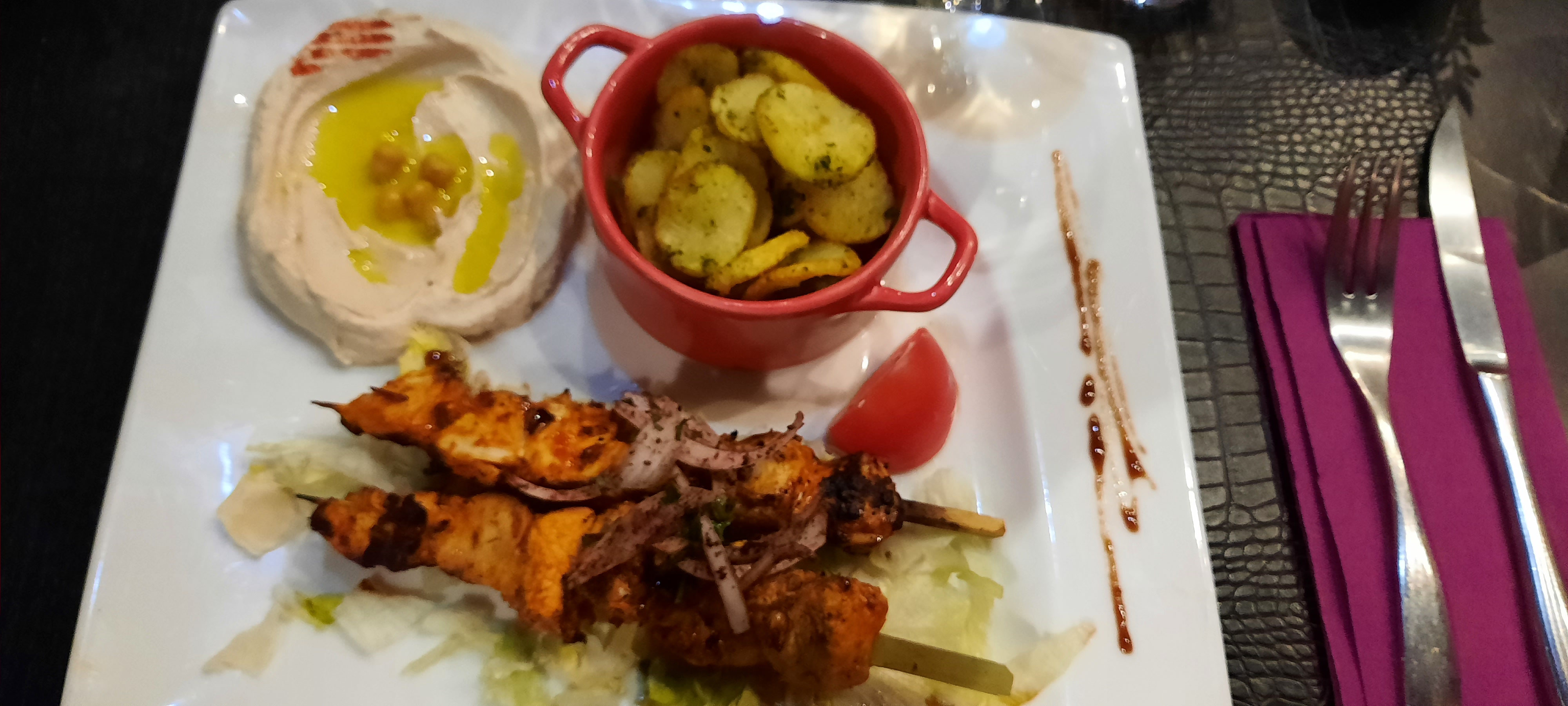 Nous avons mangé le samedi 3 juin, en terrasse : 4 adultes. Les plats proposés au chapitre mezze sont excellents. Ils sont accompagnés de 2 brochettes (kefta et poulet) qui pourraient être moins mini, comme la quantité de riz un tant soit peu ridicule pour 4. Sinon, un cadre agréable et un service rapide.