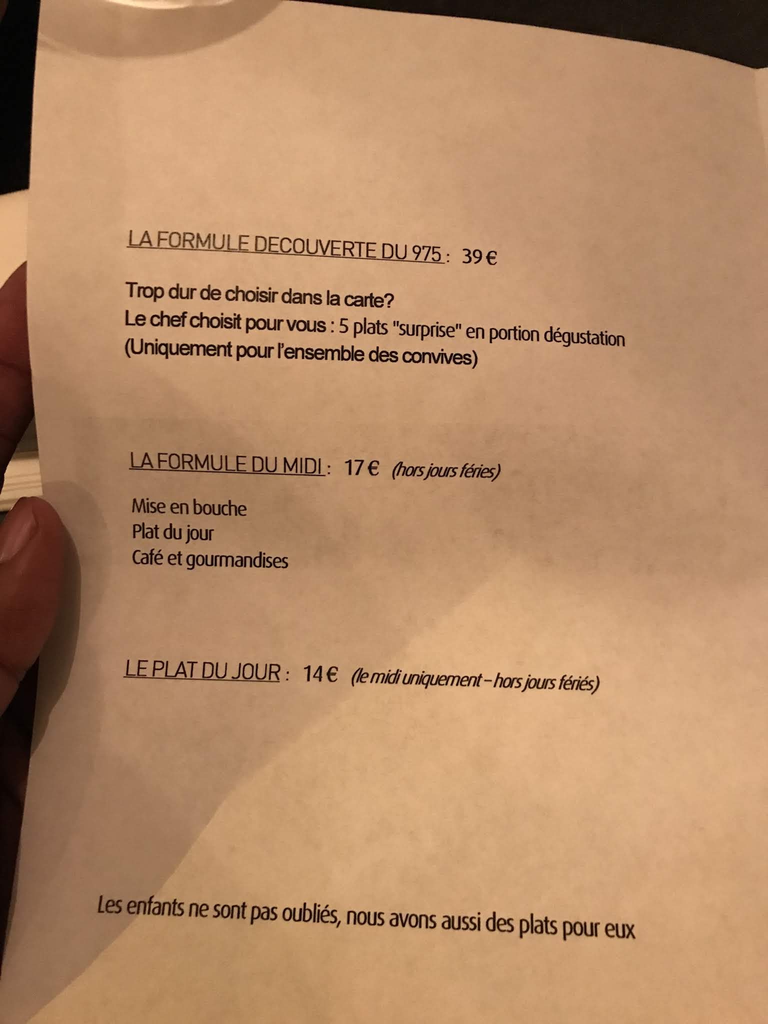 Nous sommes venu au 975 sur recommandation d’une collègue de Sylvie mon épouse. Il y règne une ambiance particulière, la cuisine ouverte permet de voir les Chefs réaliser leurs recettes en direct, concentration, précision, dressage’’precis’’ des produits a la pince pour ne pas les alterer. Les plats sont copieux, chauds, tous ont une identité graphique executée a la perfection, les sauces et jus sont divins, emulsionnés au mixeur plongeur au moment, ce qui traduit savoir faire et professionnalisme. Une mention pariculière pour l’accueil, la rapidité, la convivialité et l’efficacité du service, ‘’on attends pas’’ de plus il y a une réelle sinergie entre la cuisine et la salle, on perçois du plaisir quand les Maitres d’ Hotel posent les assiettes sur table tellement elles sont esthétiques et combien ils savent que vous allez vous régaler. Nous recommandons sans réserve.