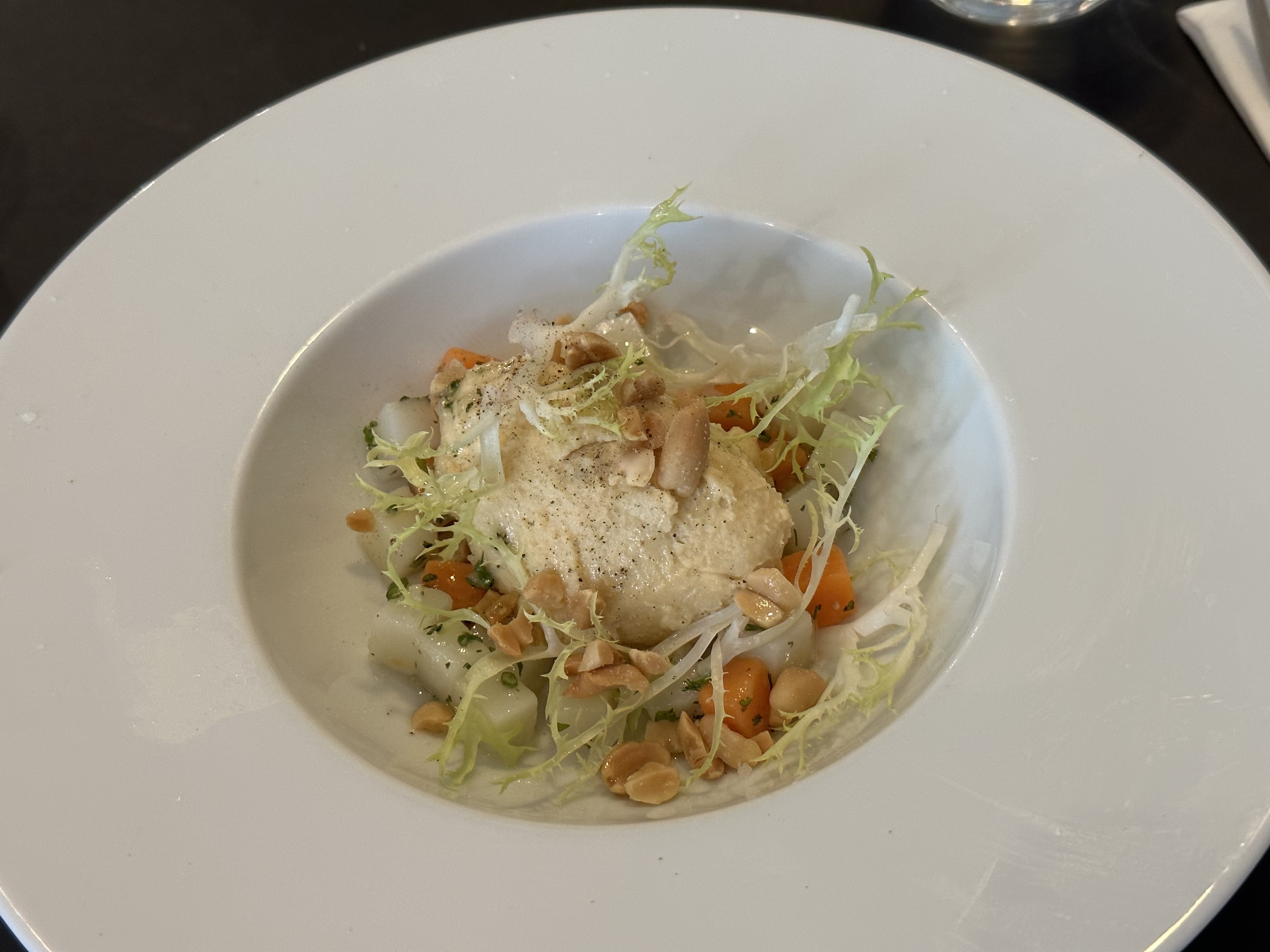Cet endroit est un incontournable à Paris. Je recommande vivement leur menu déjeuner à 23 euros. Quelle aubaine ! Le 975 orchestre un salon français innovant avec une touche asiatique umami. Cela reflète peut-être l’héritage japonais du propriétaire. La soupe de légumes racines en entrée avec œuf poché et mousse est une pure perfection. La purée de légumes est un mélange umami onctueux et crémeux. Et l’œuf… oh mon Dieu, c’est l’œuf poché le plus aéré, fluide et succulent que j’ai jamais mangé. Perfection, perfection, perfection ! Tu devrais juste venir ici pour cet apéritif. Le suprême de poulet en entrée est également DÉLICIEUX ! Poitrine de poulet juteuse et tendrement pochée baignée dans une purée de crustacés de couleur orange, accompagnée de coupes de carottes bouillies colorées et de bébé romanesco, garnie de jeunes feuilles d'endive et de noix de cajou concassées. Chaque bouchée est un délice. Attention, ce commentaire vient de quelqu'un qui n'est pas un fan suprême du poulet. Pour le troisième plat, j'ai choisi le plateau de fromages, salade et confiture de pêches plutôt que le dessert mousse au chocolat. Ce n’est rien de remarquable, mais j’aime qu’ils offrent autant de variétés dans ce plat de clôture. L'intérieur est simpliste et moderne, rien de dramatique, mais ils prennent très au sérieux la nourriture. N'oubliez pas de faire un arrêt dans ce restaurant lors de votre voyage à Paris ! Un incontournable.
