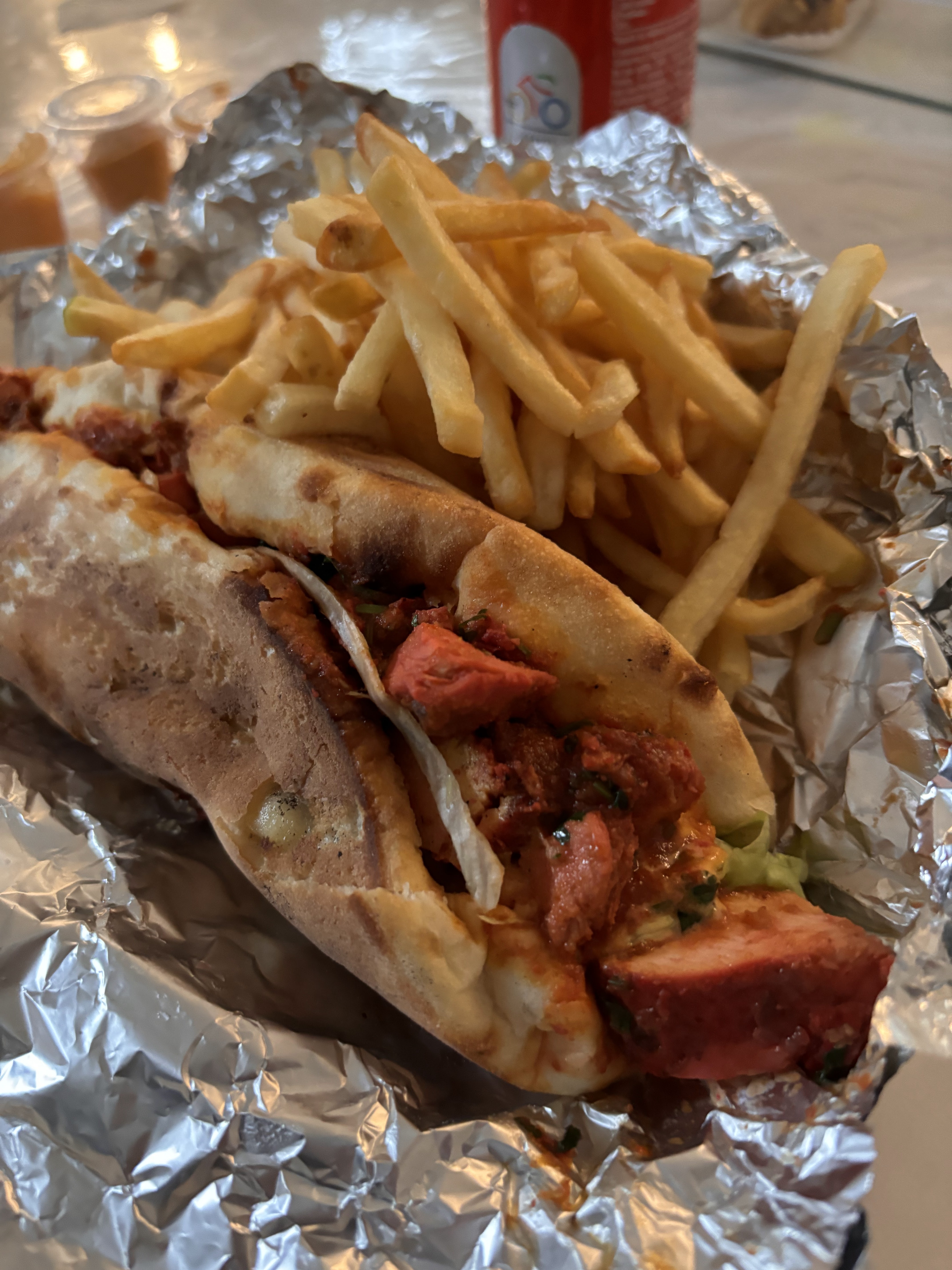 Sandwich naan très petit et pas très garni mais bon le goût passe bien, par contre les frites beaucoup trop huileuse et molle, mettez les frites dans de l’huile beaucoup plus chaude. Pour un menu à 9,50e c’est un peu cher pour la petite quantité de l’ensemble. Vous pouvez mieux faire .