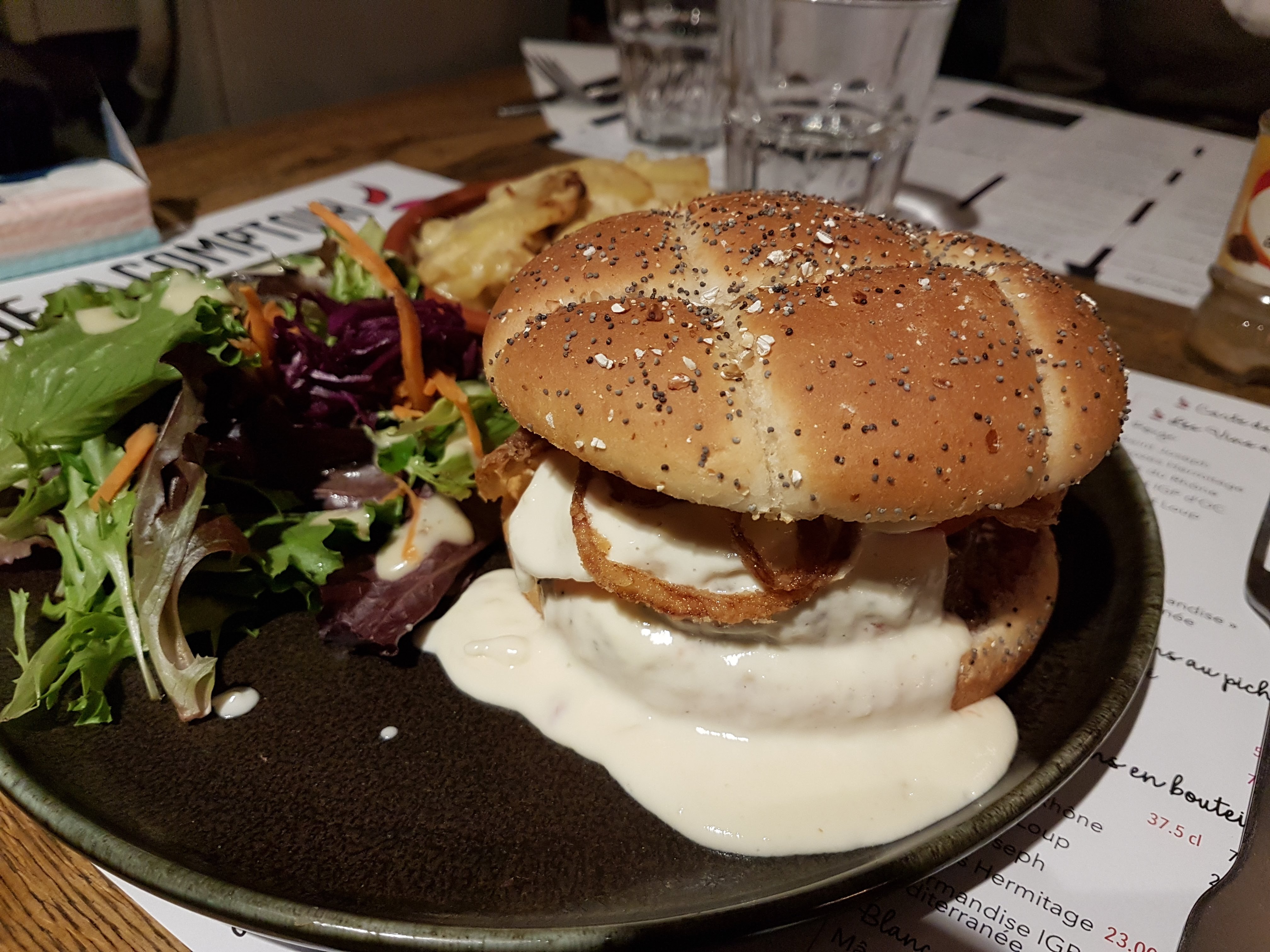 Personnellement la carte ne m'attirait pas tant que ça, mon choix s'est porté sur le cheeseburger. Il dégoulinait de cheddar grumeleux (c'était trop). La salade était flétrie, la sauce avait un goût bizarre. Nous sommes repartis avec un mal de ventre.