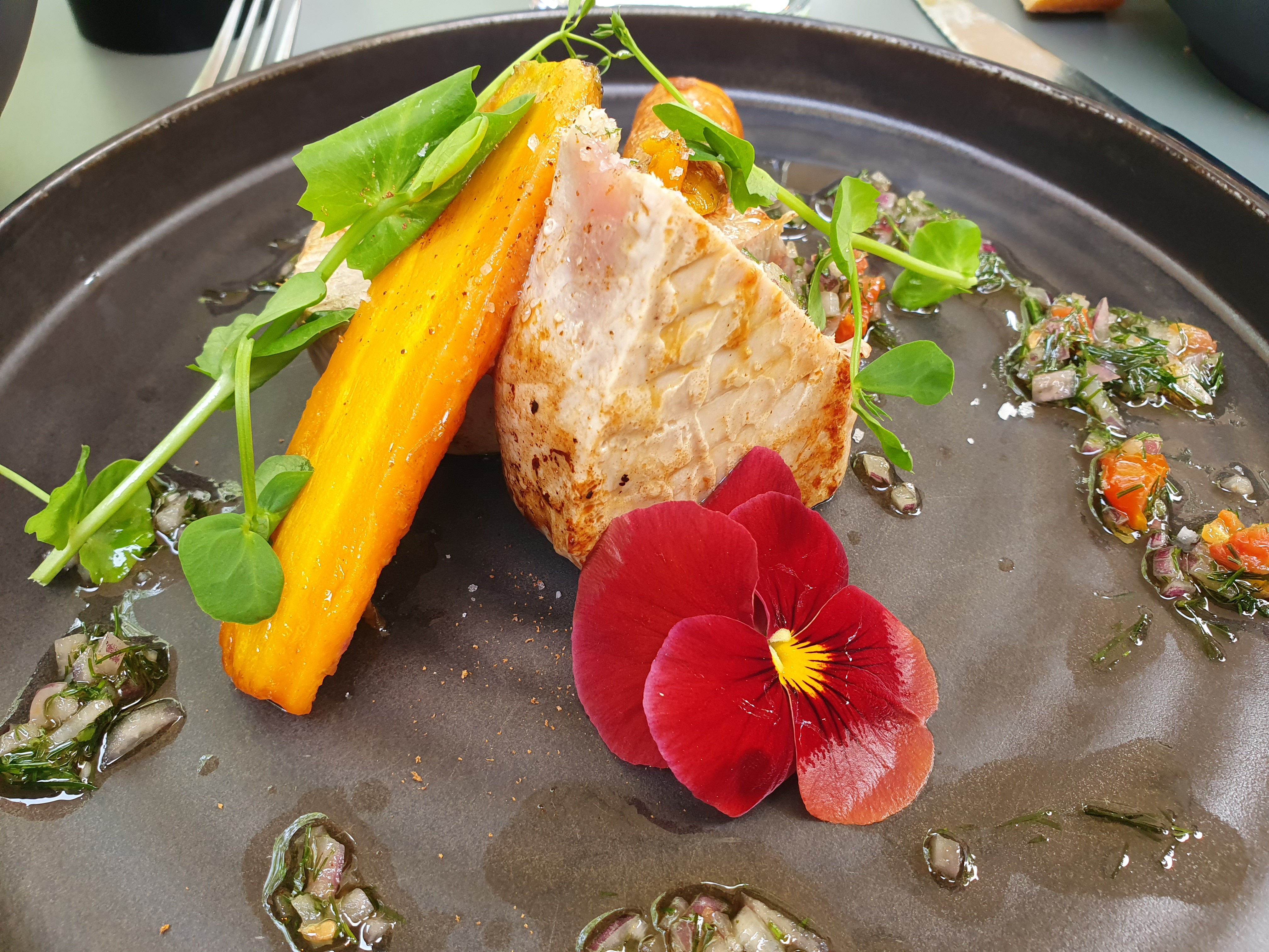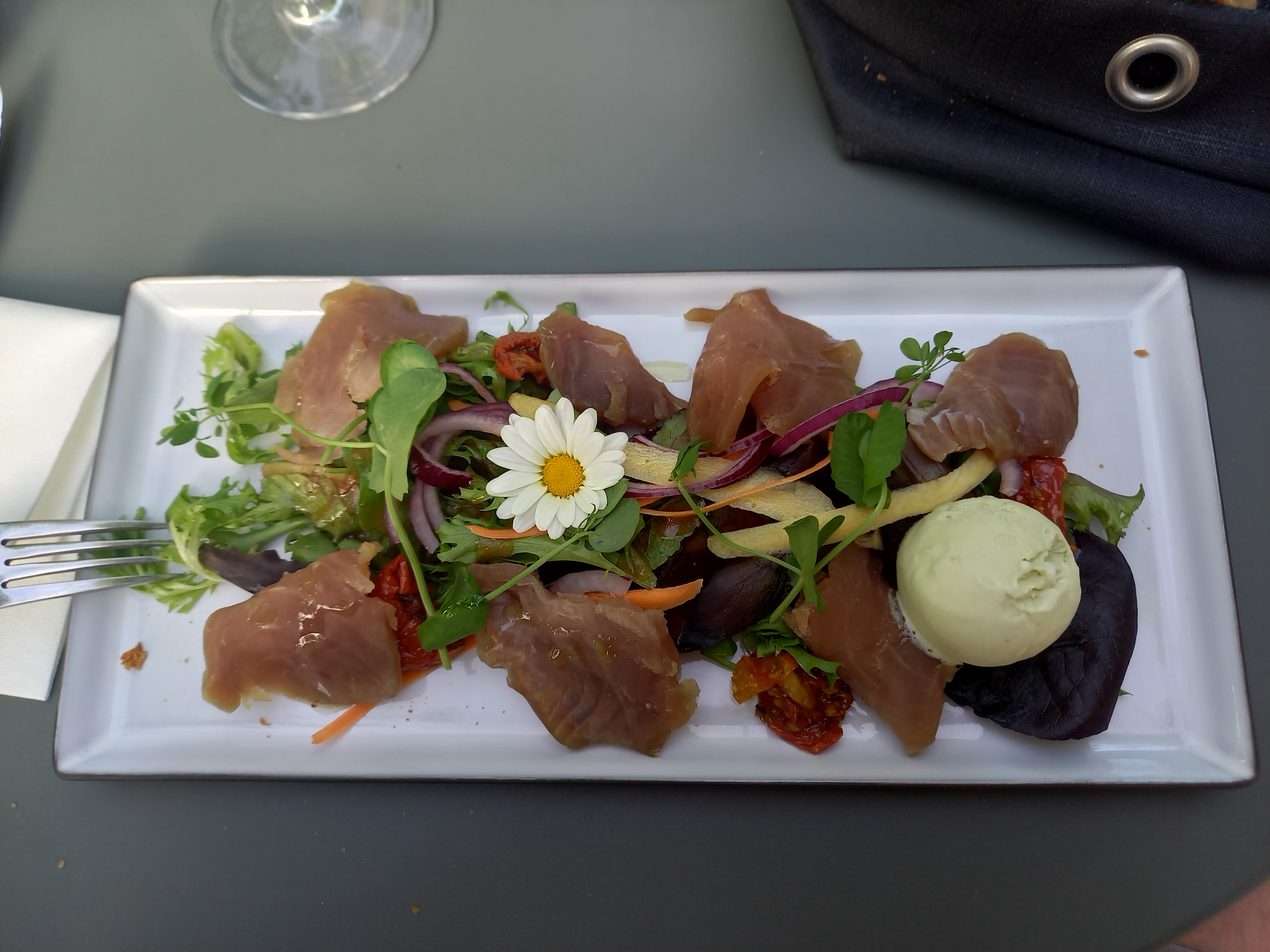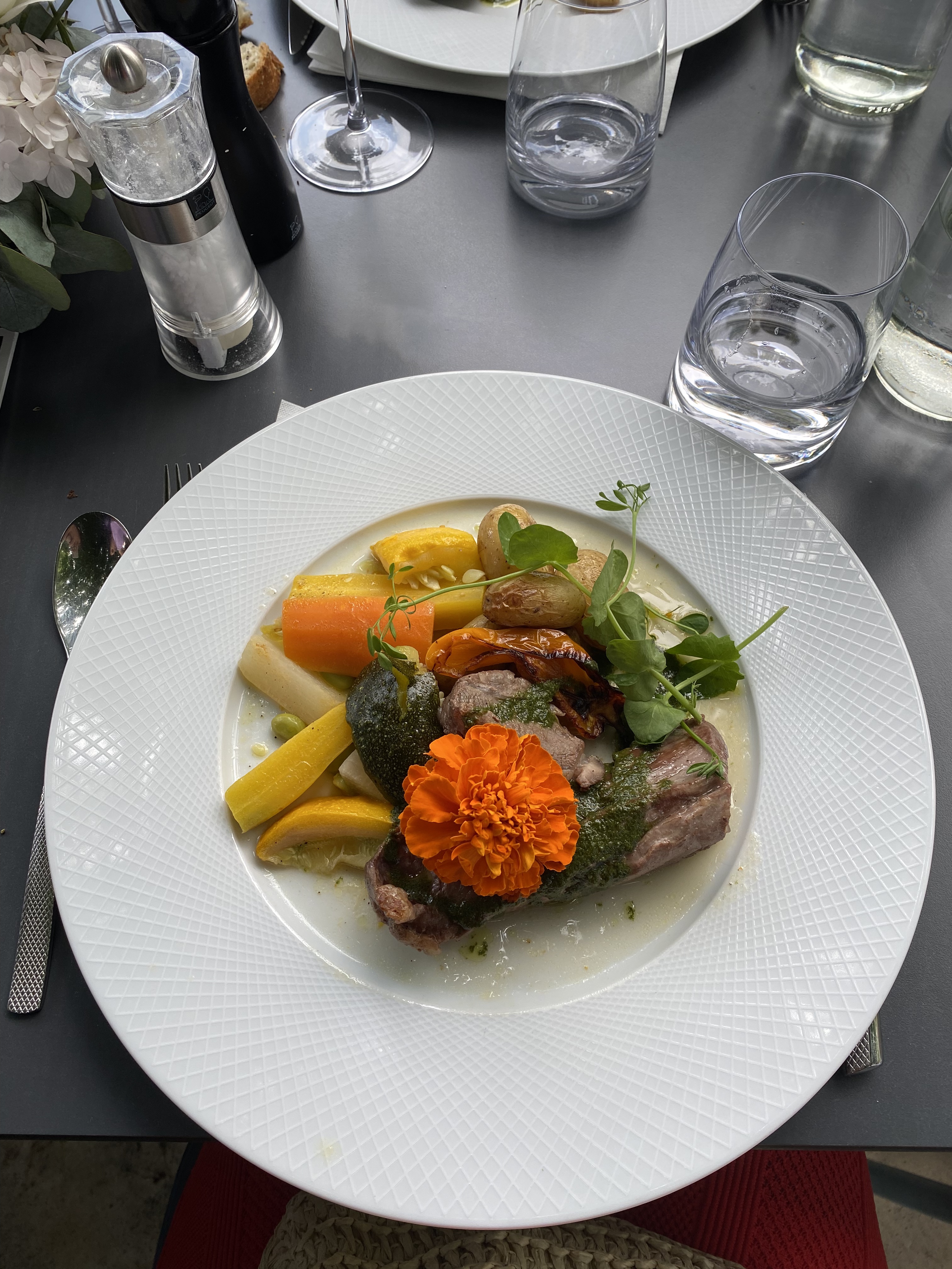 Dîner sur la magnifique terrasse au bord de l'eau. Plats très bons avec de beaux produits (légumes avec le poisson juste un peu sous-assaisonnés), vins excellents, accueil et service sympathiques (attente juste un peu longue pour les entrées). On aurait voulu mettre 4,5 mais pas possible... Une belle adresse pour un beau restaurant dans le coin !