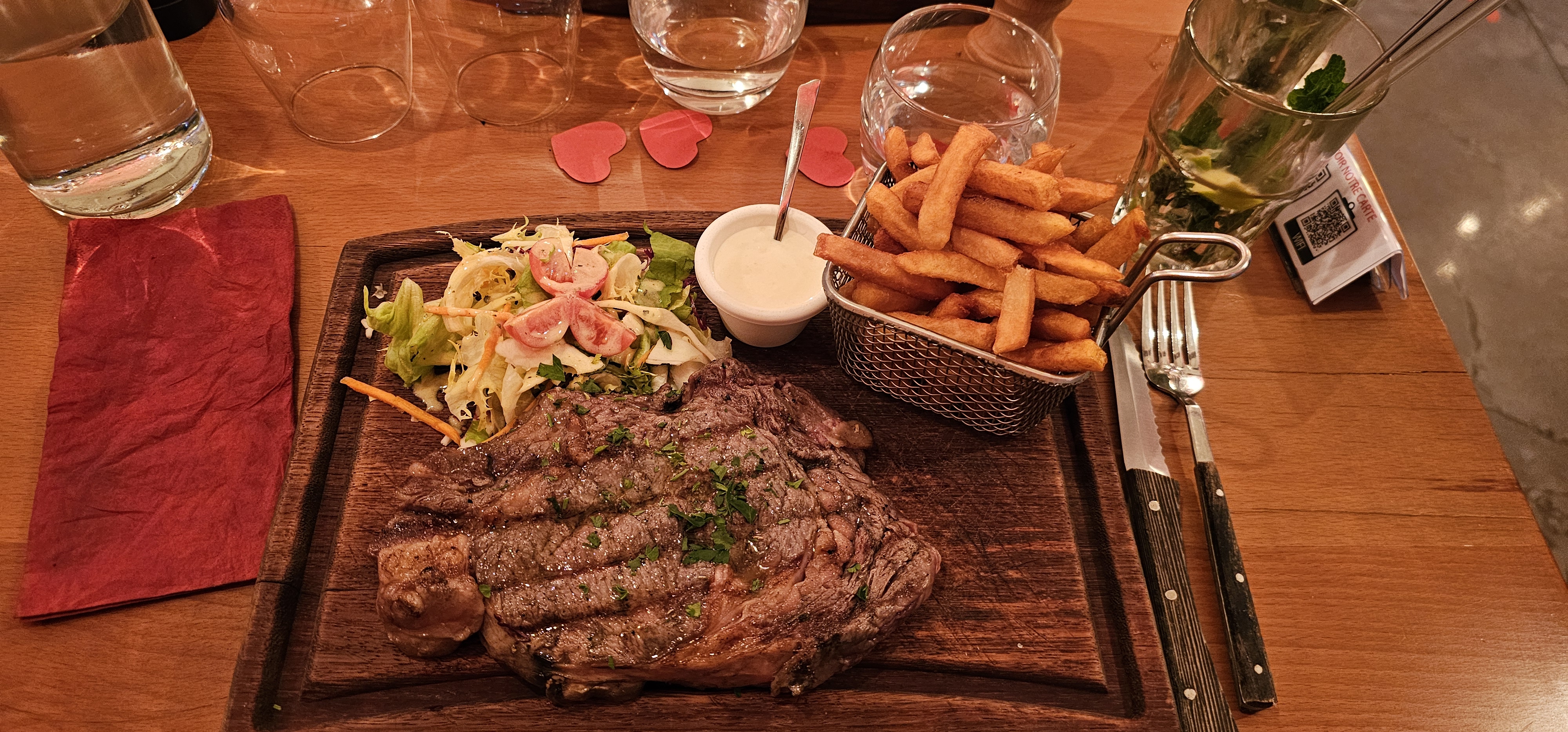 J'ai lu les avis et m'y suis rendu en toute confiance, et bien j'ai parfois l'impression qu'on ne parle pas du même restaurant. Pour la saint valentin carte unique plus ou moins imposée on a du demander le menu... Burger au cantal commandé, je n'ai jamais vu ce type de viande hachée qui n'avait aucun gout, le dessert ne m'a pas non plus convaincu. En revanche le serveur était au top, très serviable et agréable. Première et dernière fois pour moi.