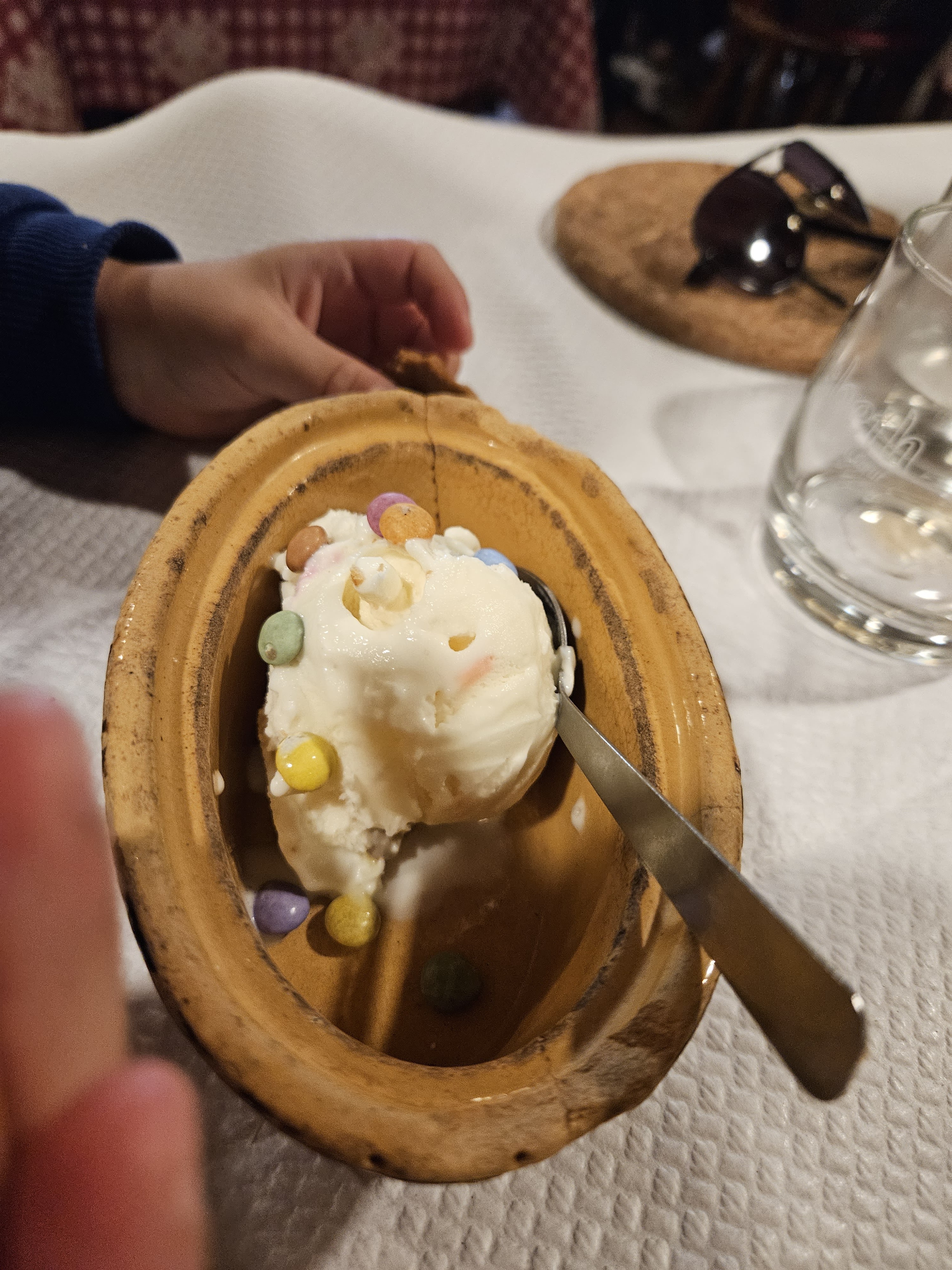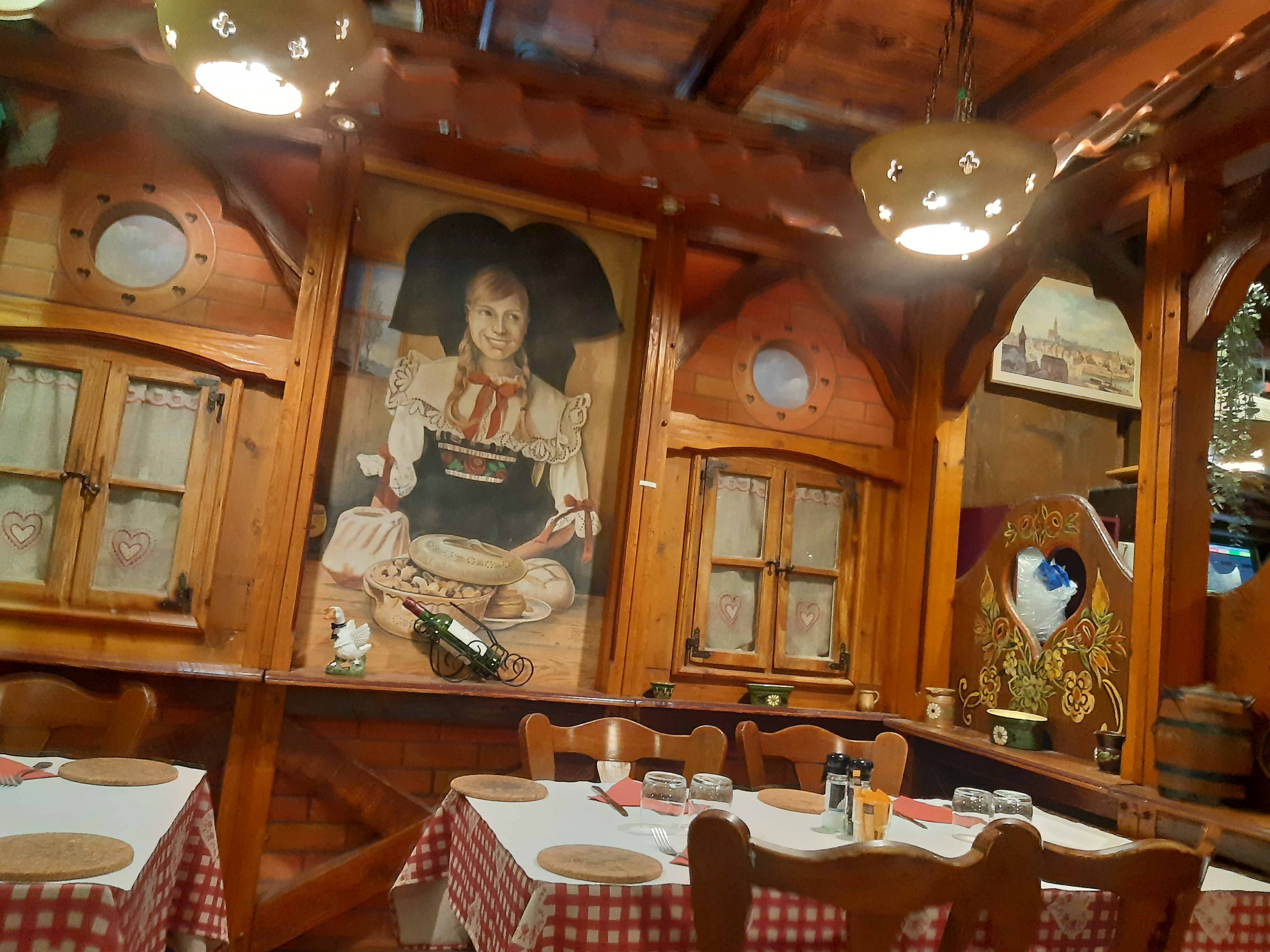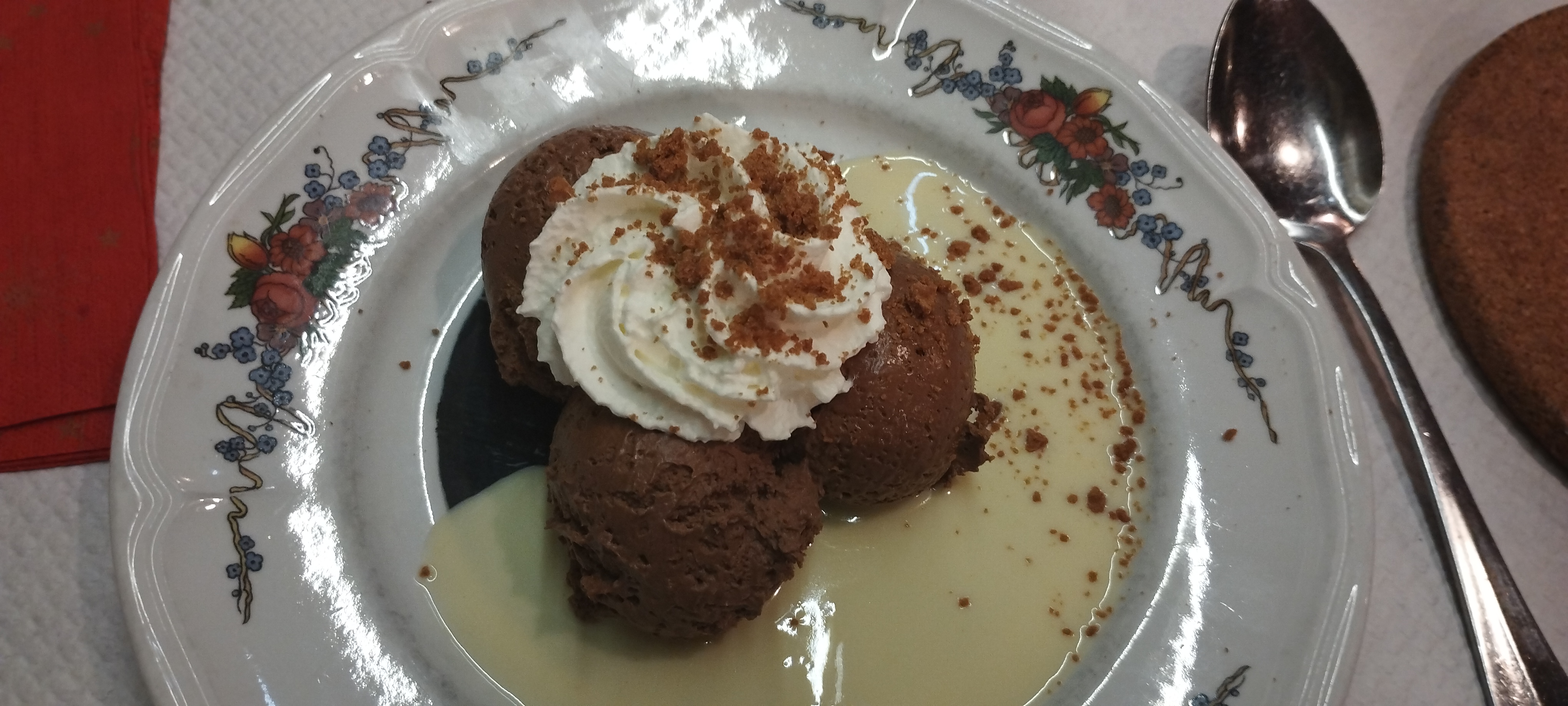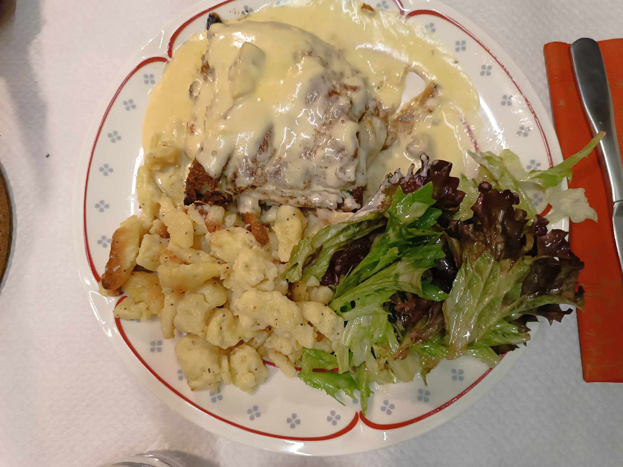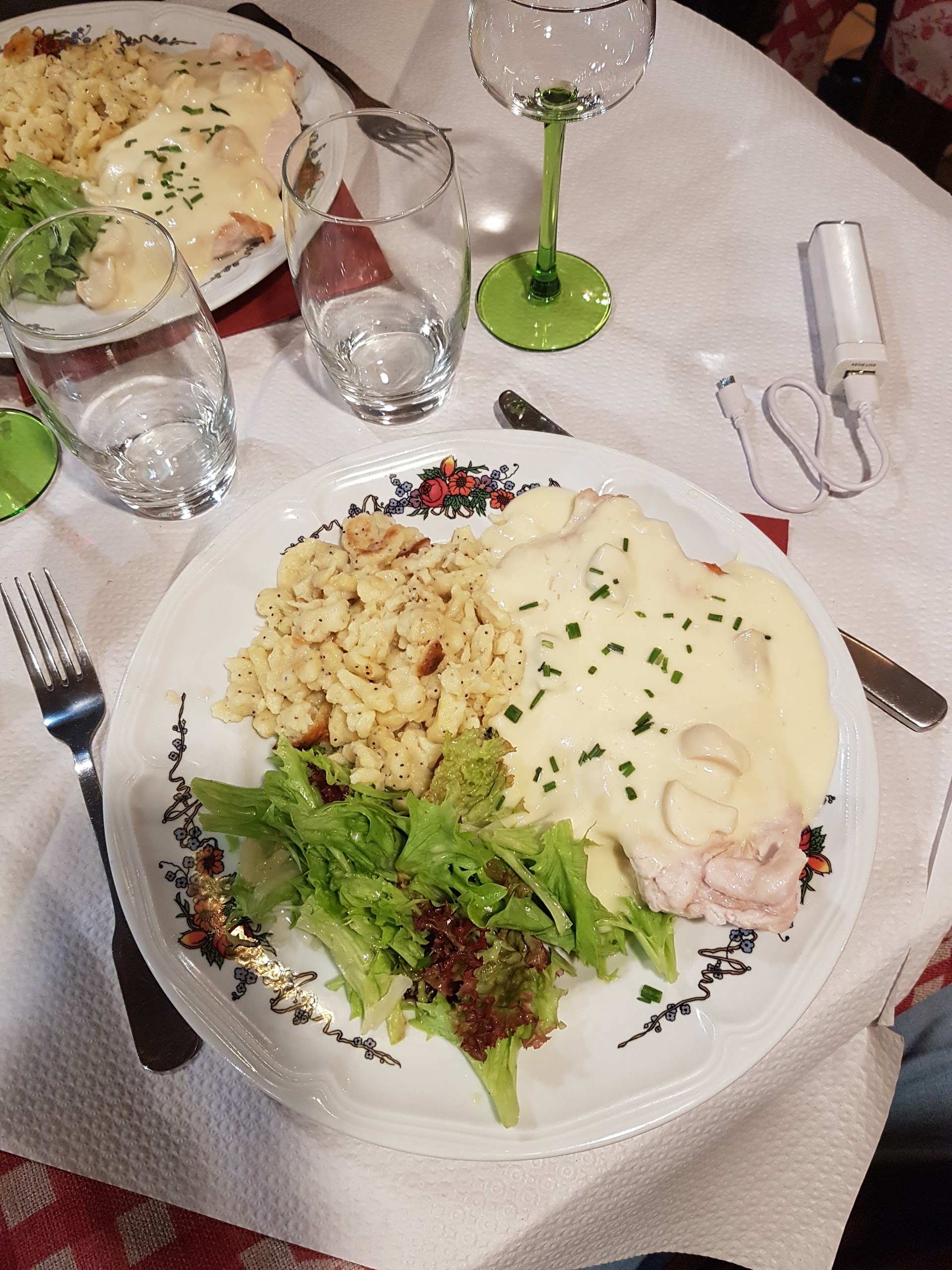 Décoration en bois typique Alsacienne. Au niveau des plats, j'ai commandé une escalope à la crème et des spaezles mais c'était très fade malheureusement.. Par contre le dessert (mousse au chocolat) était vraiment bon ! Le personnel est sympa