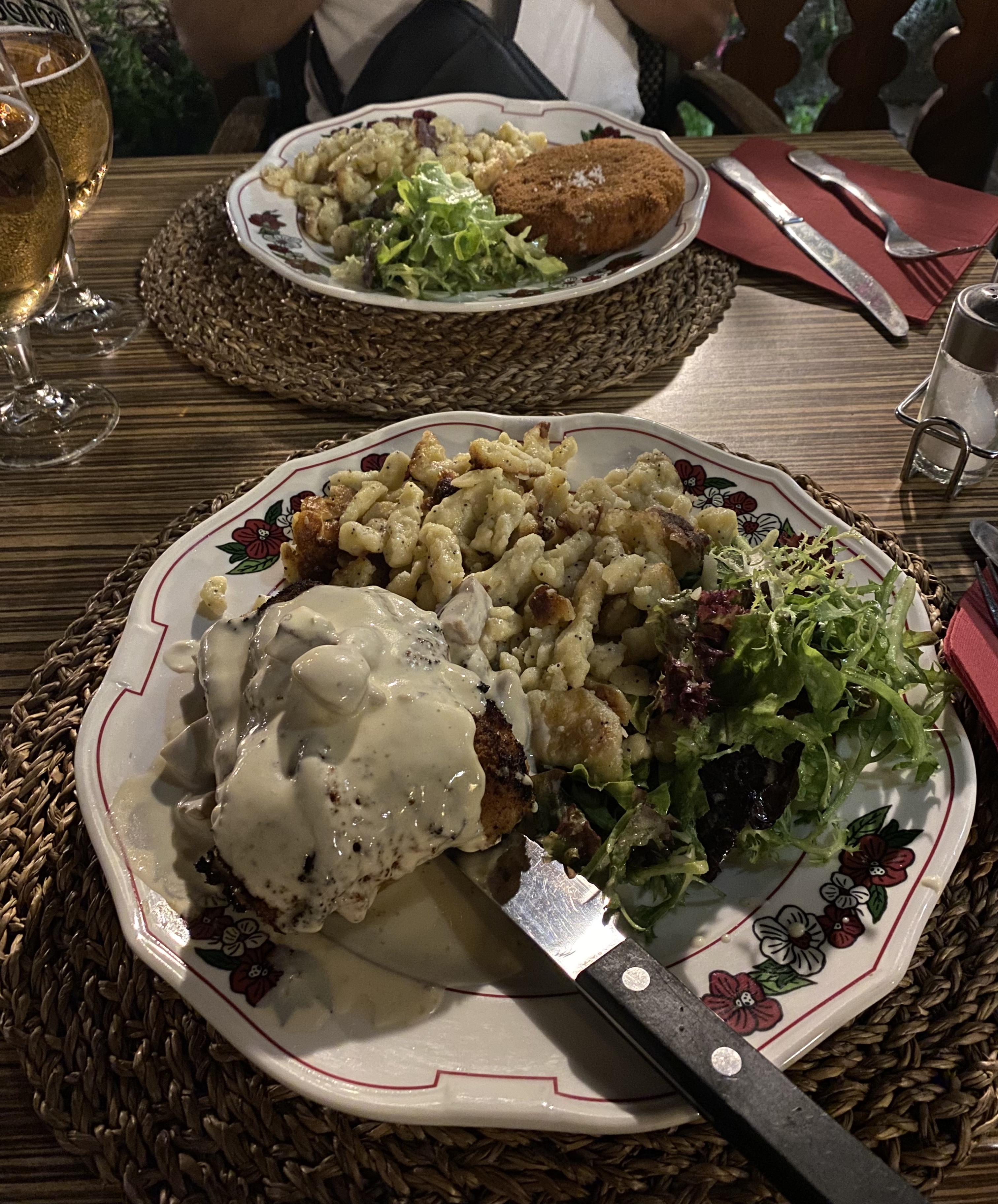 Véritable piège à touristes. Oser servir une salade vinaigrée sur la même assiette qu’un cordon bleu de veau à la soi-disante sauce au bleu qui n’avait ni goût ni trace de bleu… et des spaetzles pas suffisamment grillés c’est ce moquer ouvertement du client. Dommage l’établissement est séduisant mais ne mérite pas de faire la queue pour avoir une table !