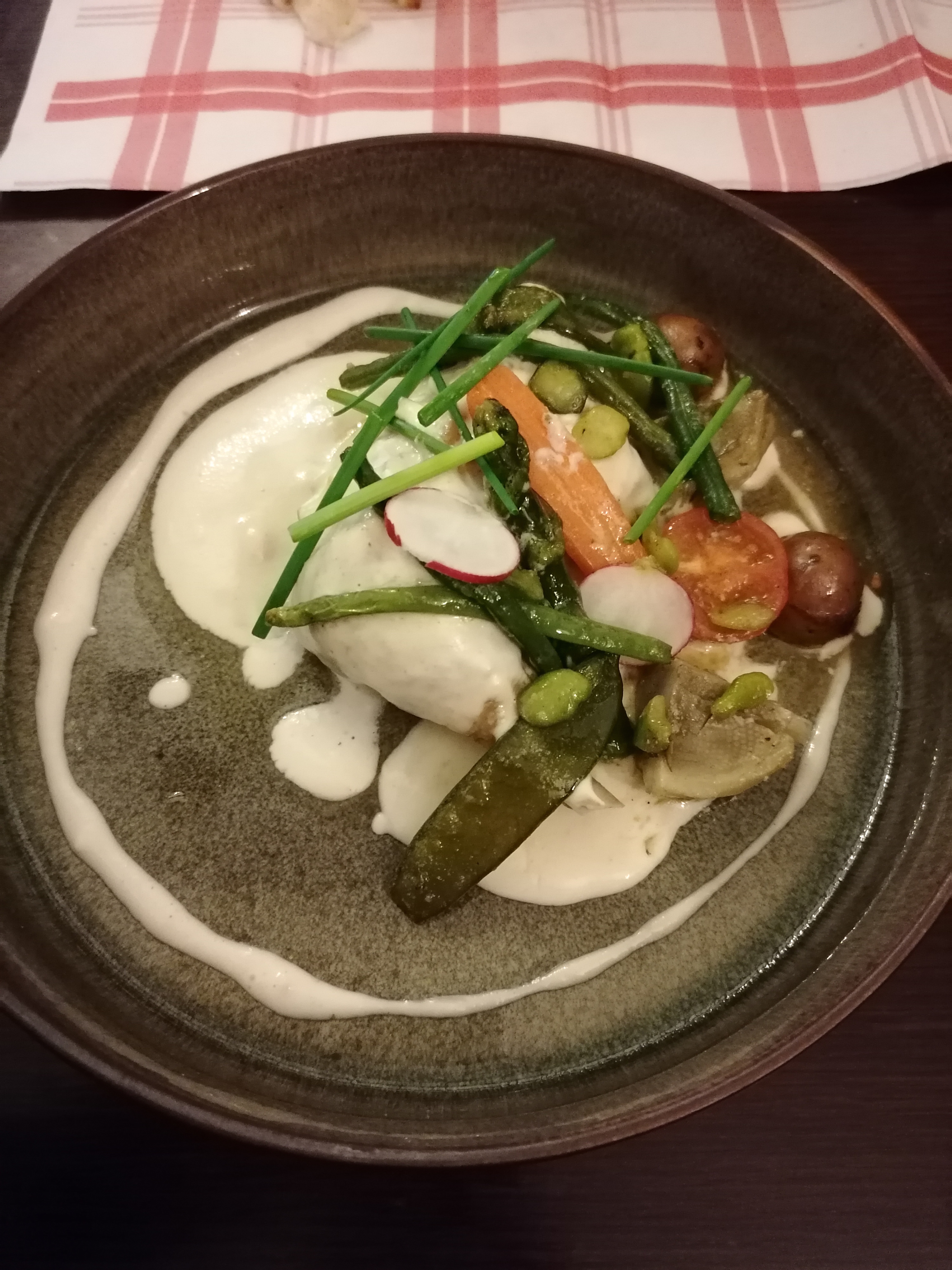 Accueil très sympathique. J'ai pris le menu végétarien pour leurs ravioles aux cépes très bon . Mon mari à pris la pièce de boeuf ,il n'a pas était déçu .