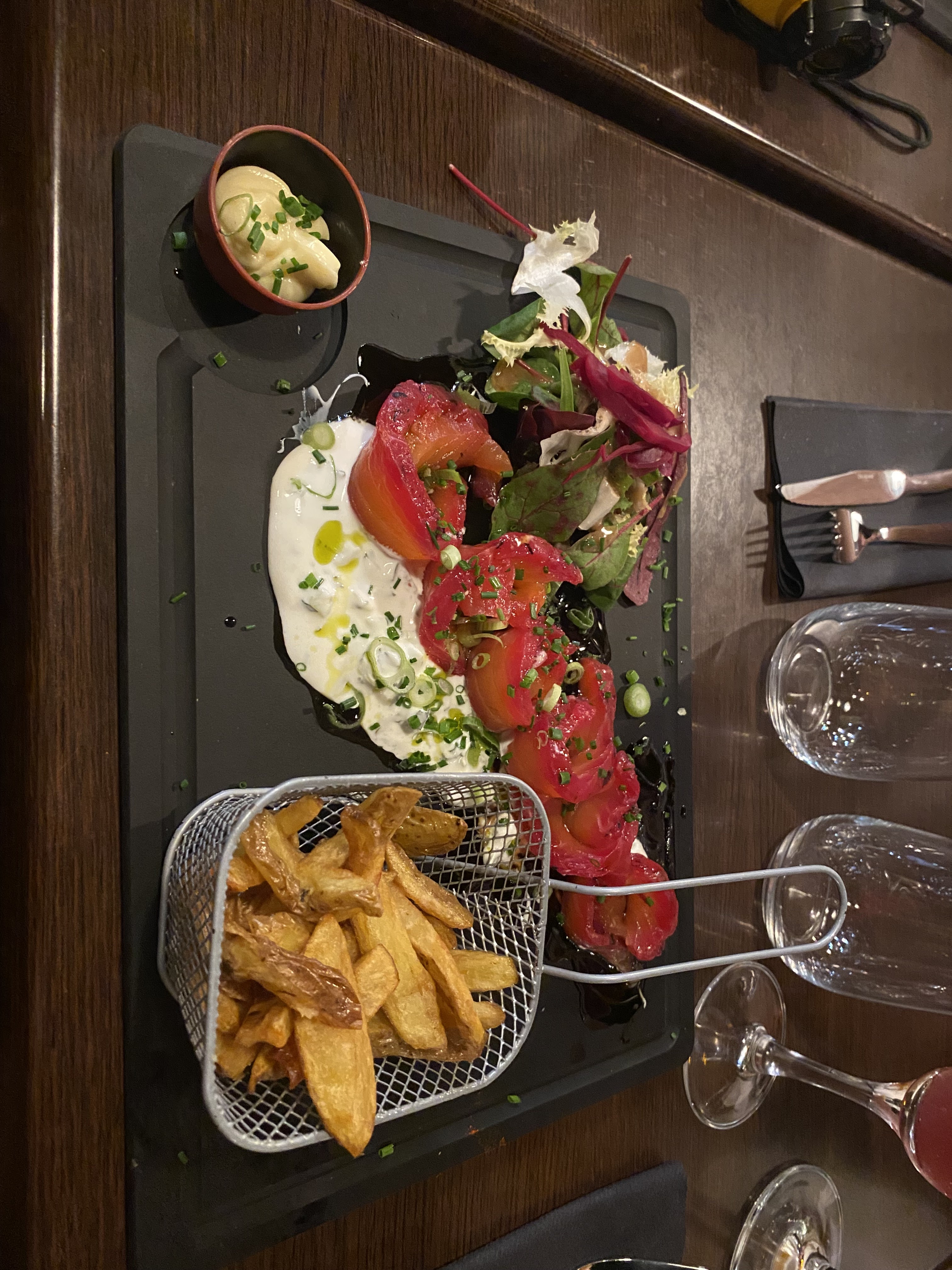 Restaurant très sympa autant niveau décoration que mise en place des tables . Un peu petit quand même . Carte très variée on a du mal à choisir ce qu'on veut manger . Portions énormes mais cela en vaut le prix . Je recommande