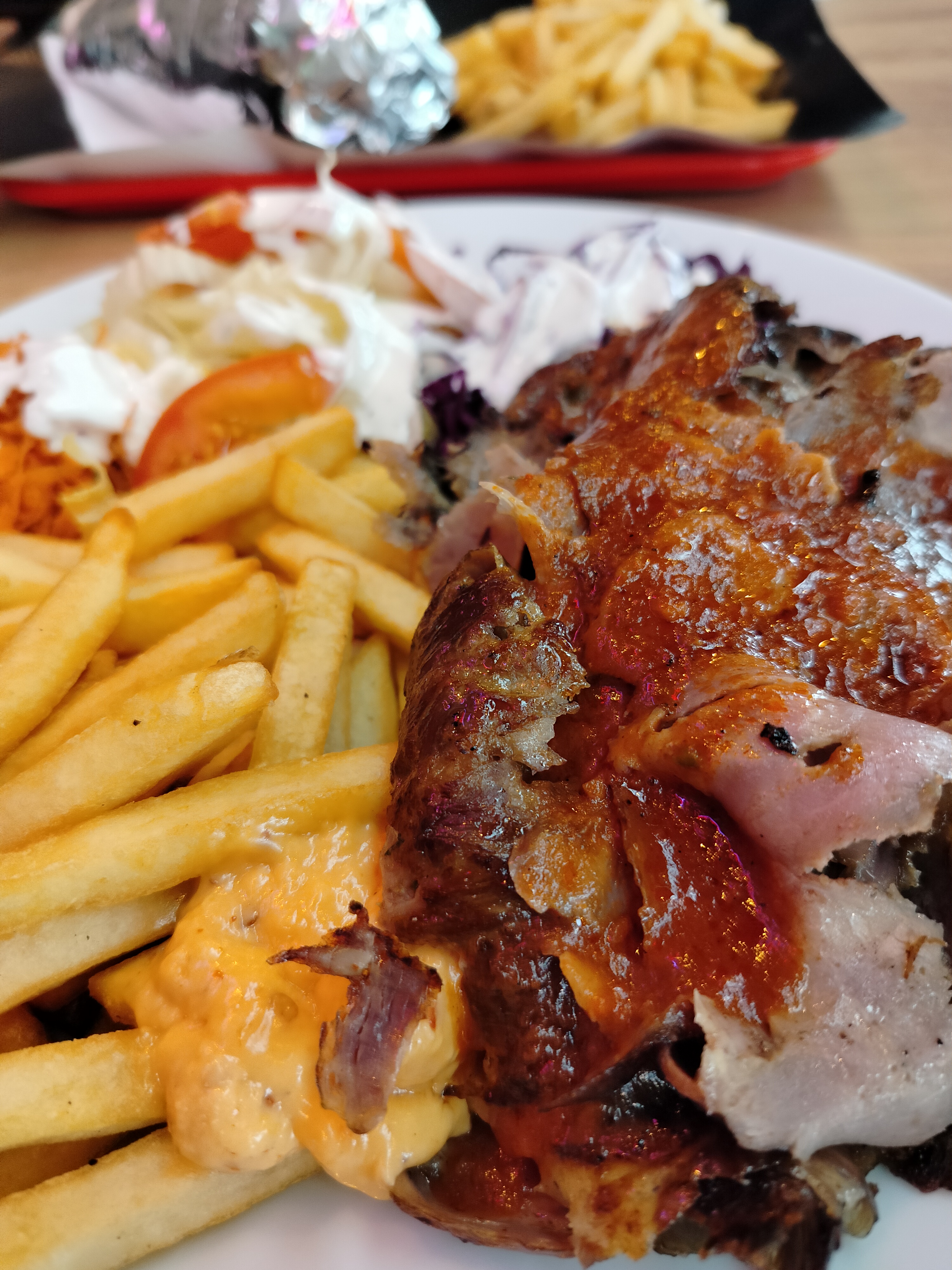 Frites industrielles de tres basse qualité huileuse et sans gouts excepte l’huile dans laquelle elles ont baigné. Pas de sel à disposition dommage pour les frites. Viande parcontre excellente mais trop salée paradoxalement. Le pain lui est industriel et gache l’experience. Ma copine a eu un pain datant de plusieurs jours qui lui était dur. 11,50€ pour un menu doner je trouve cela bien trop cher et bien dommage de cuisiner une viande aussi bonne avec des accompagnants d’aussi basse qualité. Je ne reviendrai malheureusement pas. Le personnel est gentil mais peu accueillant, pas de bonsoir, merci ou de bonne soiree la politesse commence et s’arrête à aurevoir.
