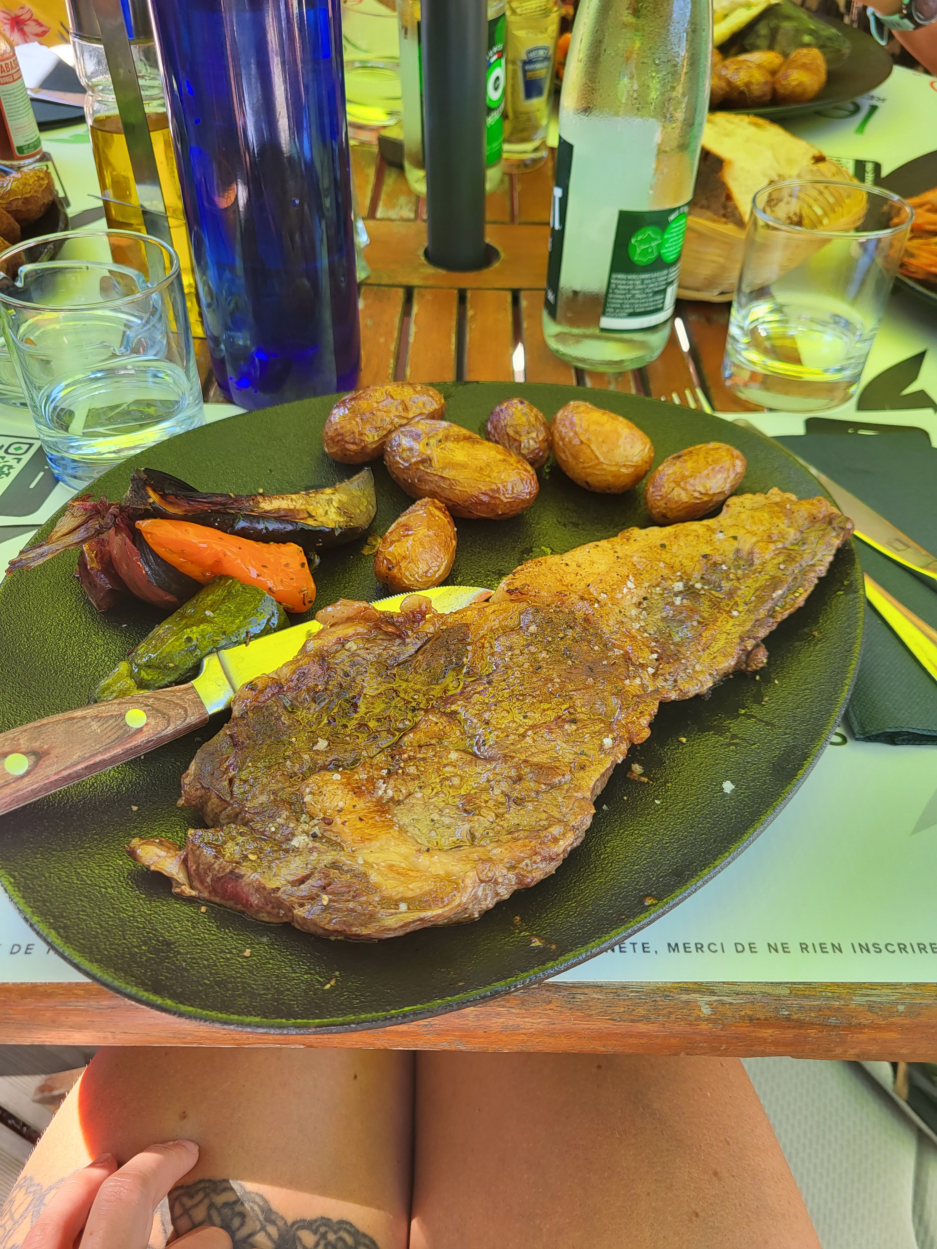 Handicapé, j'ai glissé sur le parquet fraîchement huilé. Blessé au bras, saignant, une chemise et un pantalon difficilement récupérable, je n'ai néanmoins rien dit une fois qu'on m'ait aidé à me relever. Rien n'était signalé à propos de cette opération d'huilage. On a déjeuné 4 adultes et 3 enfants. Tout à été payé rubis sur l'ongle. Rien, pas un café, pas un verre, rien. Le patron a encaissé sans moufté alors qu'en principe il est responsable des accidents qui se produisent chez lui. Bravo !