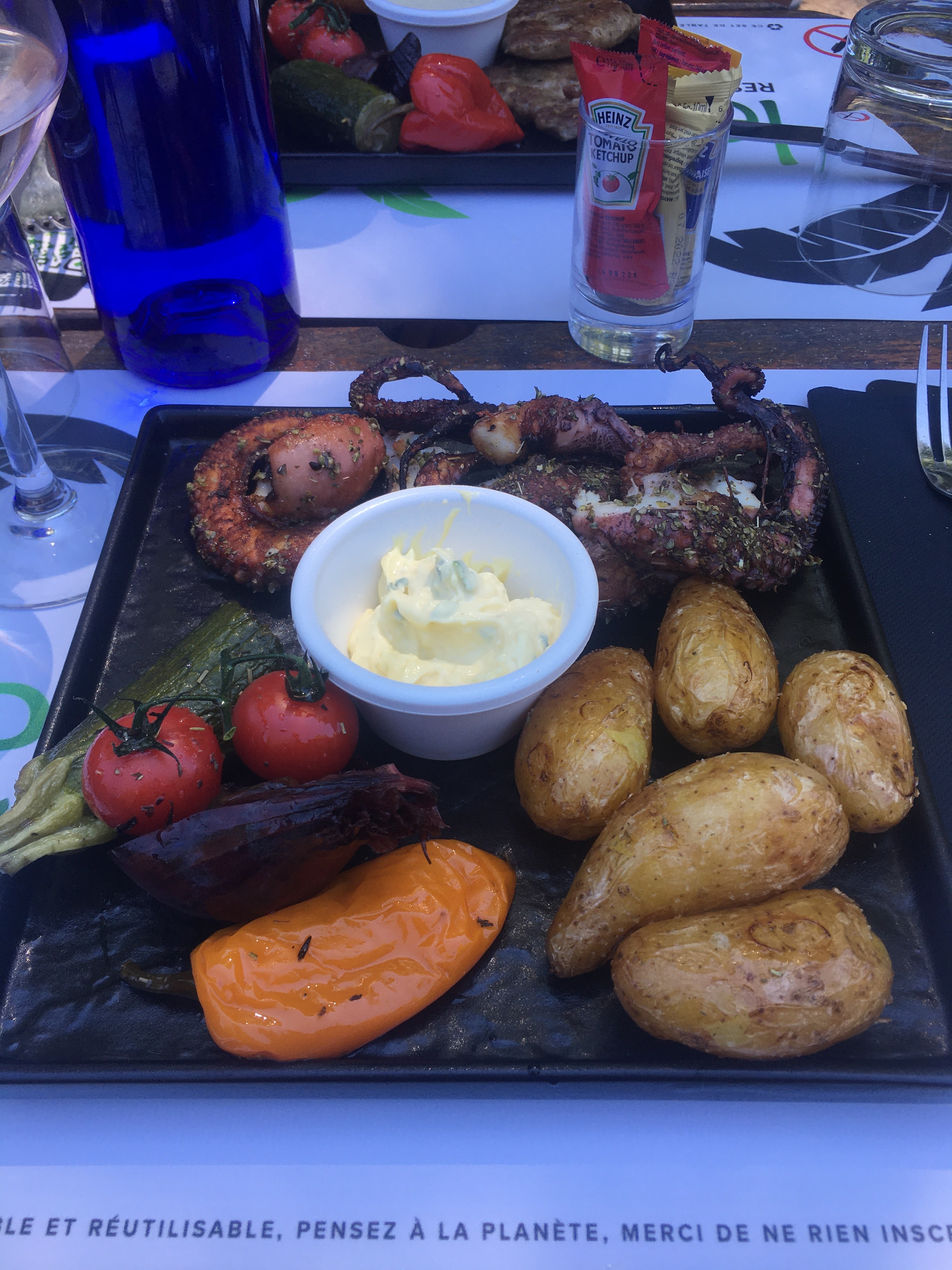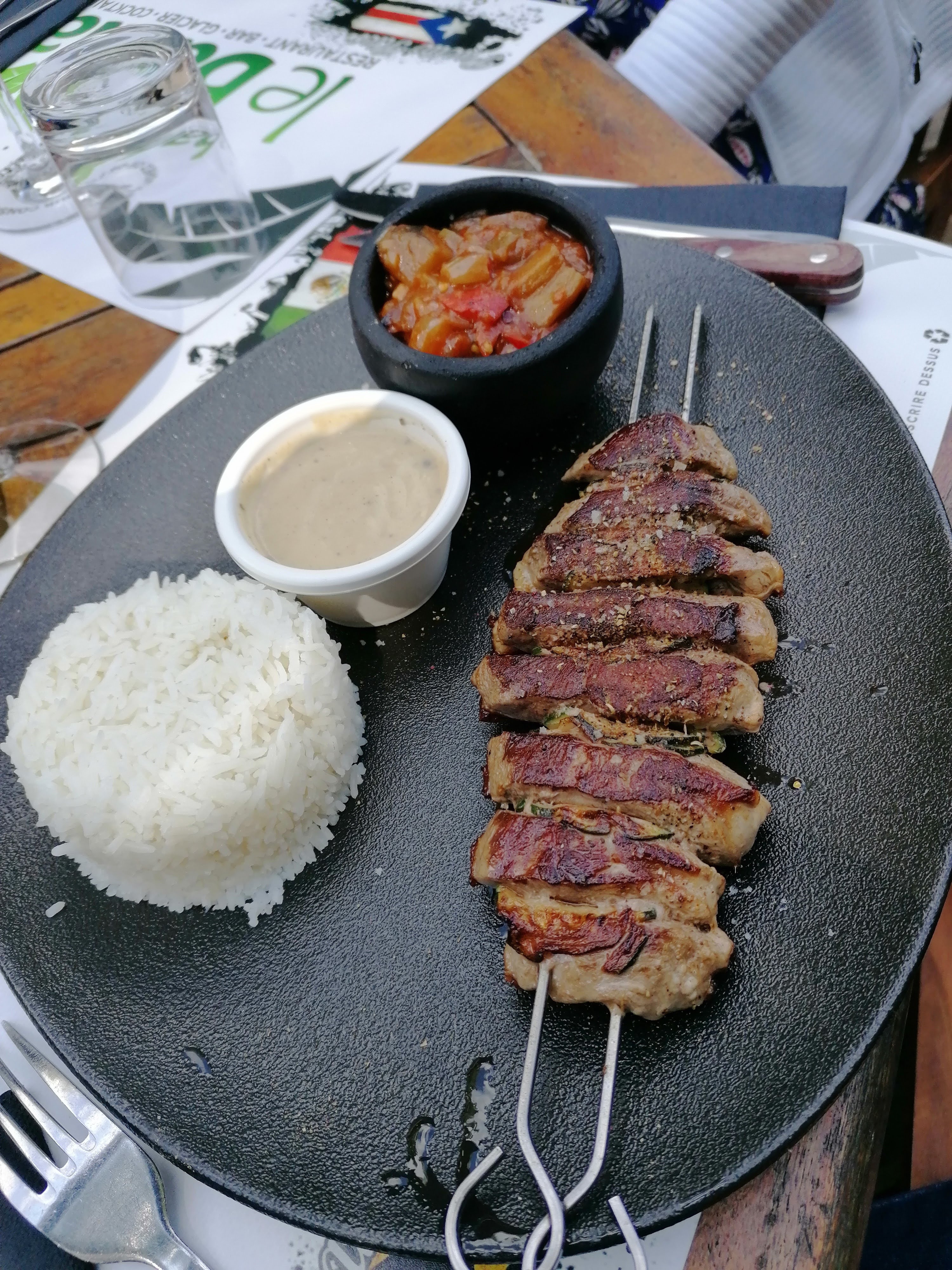 Repas en extérieur face au lac dans une ambiance Latino Pas de menu , mais un bon choix de viandes er poissons et des plats bien garnis Beaucoup de personnel au service mais pas forcément bien organisé, peut-être par manque d'expérience Endroit à découvrir
